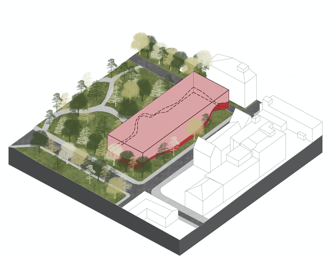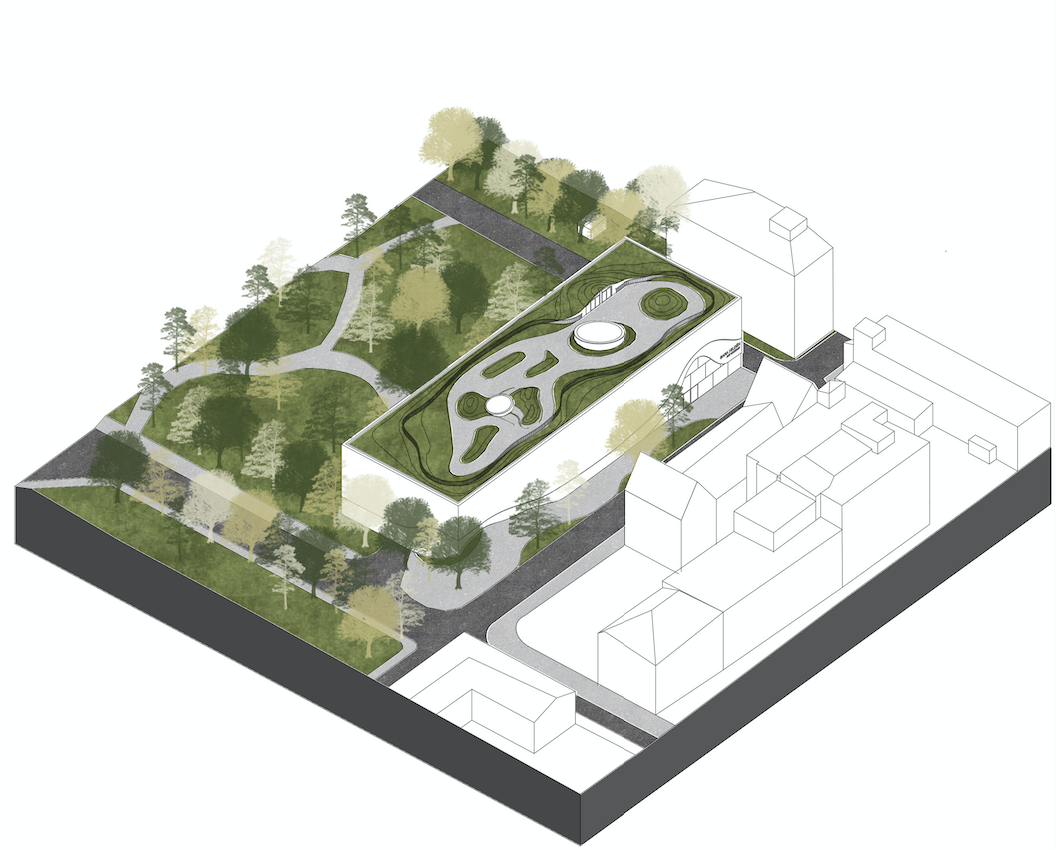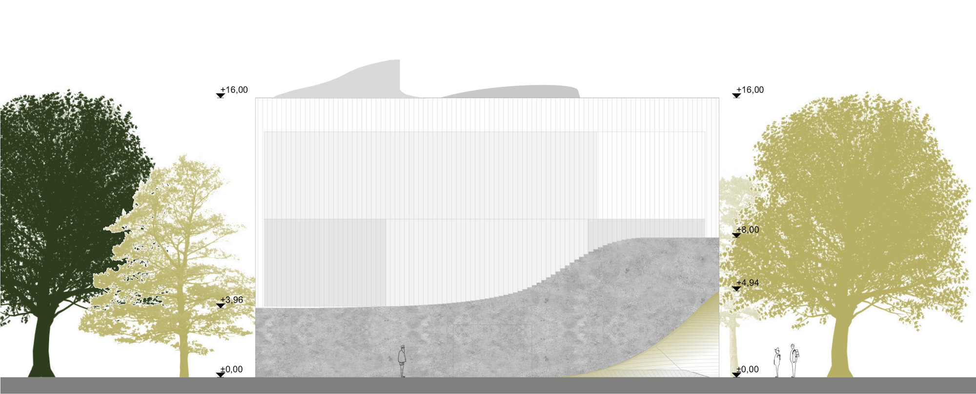 A függőlegesen tagolt tömeg két fő elem izgalmas elegyéből áll össze: a földszintet alkotó nyitott és átjárható közösségi térsor erősíti a természettel való fizikai köteléket. Természetközeli, organikus formavilága kontinuitást képez a parkkal, miközben markáns tájékozódási pontot jelent az épület alatt. A délnyugati sarok felnyitása új városi kapocsként szolgál; nem csak az átlátást, de a park és a palota közvetlen megközelítését is lehetővé teszi.