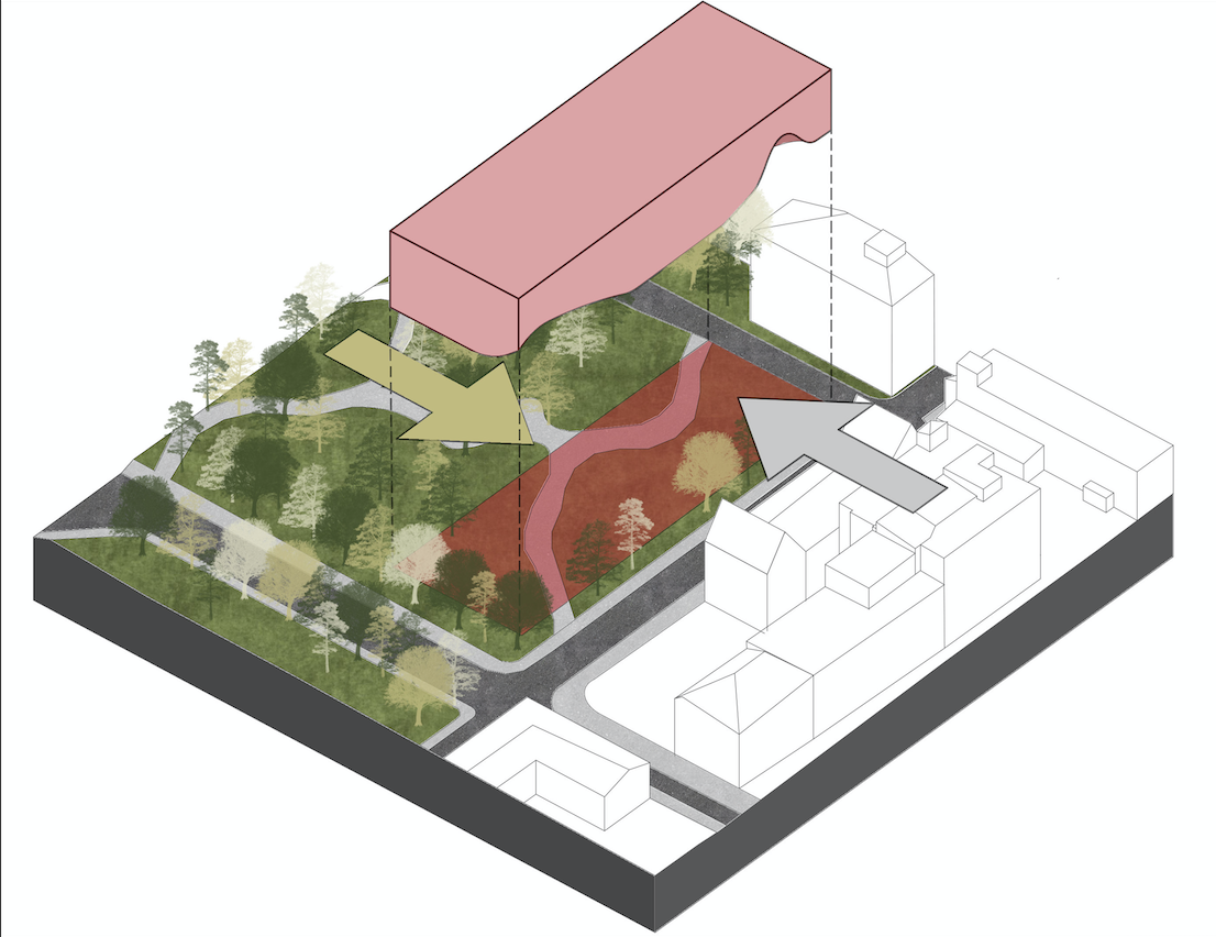A koncepciónk egyik központi eleme a déli városias szövet és a város északi részén található parkos részek közötti hiányos összeköttetés fejlesztése, pótlása. A Kuninkaankatu – Finlaysoninkatu felőli sarok felnyitásával nemcsak láthatóvá, de közvetlenül elérhetővé is válik a park és a palota. Ezáltal az egyébként forgalmas kereszteződés a gyalogosok, biciklisták számára a park bejáratává avanzsál.