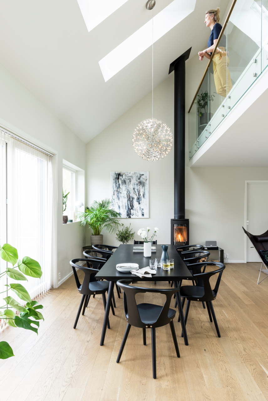 Simen és Christina úgy döntöttek, az emeletek belmagasságát az energiahatékonyság érdekében 2,5 méterben szabják meg, a közös terek esetén azonban nem szerettek volna lemondani a szellős, impozáns térélményről, ezért a nappali belmagasságát a födém áttörésével a tetőtér felé növelték meg. E megoldás lett a ház igazi különlegessége: az egymásba mosódó terek és a szinte láthatatlan emeleti korlátok a ház tágas, tiszta érzetét hangsúlyozzák. Az üvegkorlátokkal határolt, közös tereket és közlekedő folyosókat egyaránt magába foglaló emelet fölött pedig, a koramodern ipari építészet vívmányait idéző, a tetőgerinc mentén végigfutó ablaksor eredményezett fantasztikus fényviszonyokat. Az egymás mellé sorolt VELUX tetőablakok látják el napfénnyel a nappalit és az étkezőt is.
