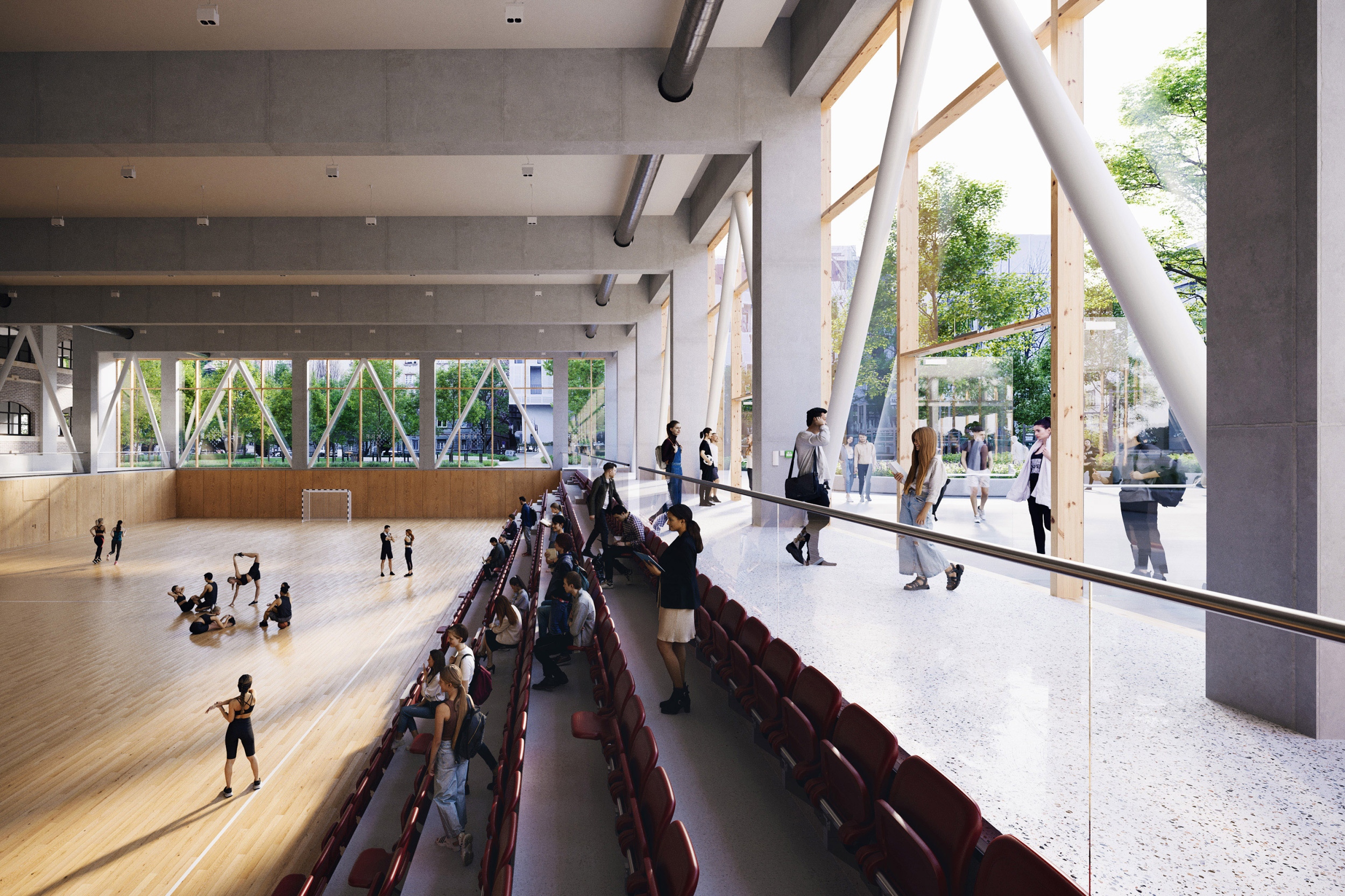 A sportközpont tornaterem, kisebb sport- és mozgáscélú termek, öltözők és a rendezvények lebonyolításához szükséges háttér helyiségek csoportjából áll. A helyiségcsoport szoros egyben tartása biztosítja mind az ideális működtetést, mind a párhuzamos események, valamint a bérbe adhatóság igényeit. A rendkívül nagy alapterületű, magas belvilágú és nagy fesztávigényű tornaterem elhelyezése kihat a teljes épület tömegalakítására és funkcionális kapcsolataira. A Kinizsi utcai épület főtraktusának megtartása esetén a mellé helyezés pozíciója és a kiválasztott magasságra emelés következményeit kellett mérlegelni.