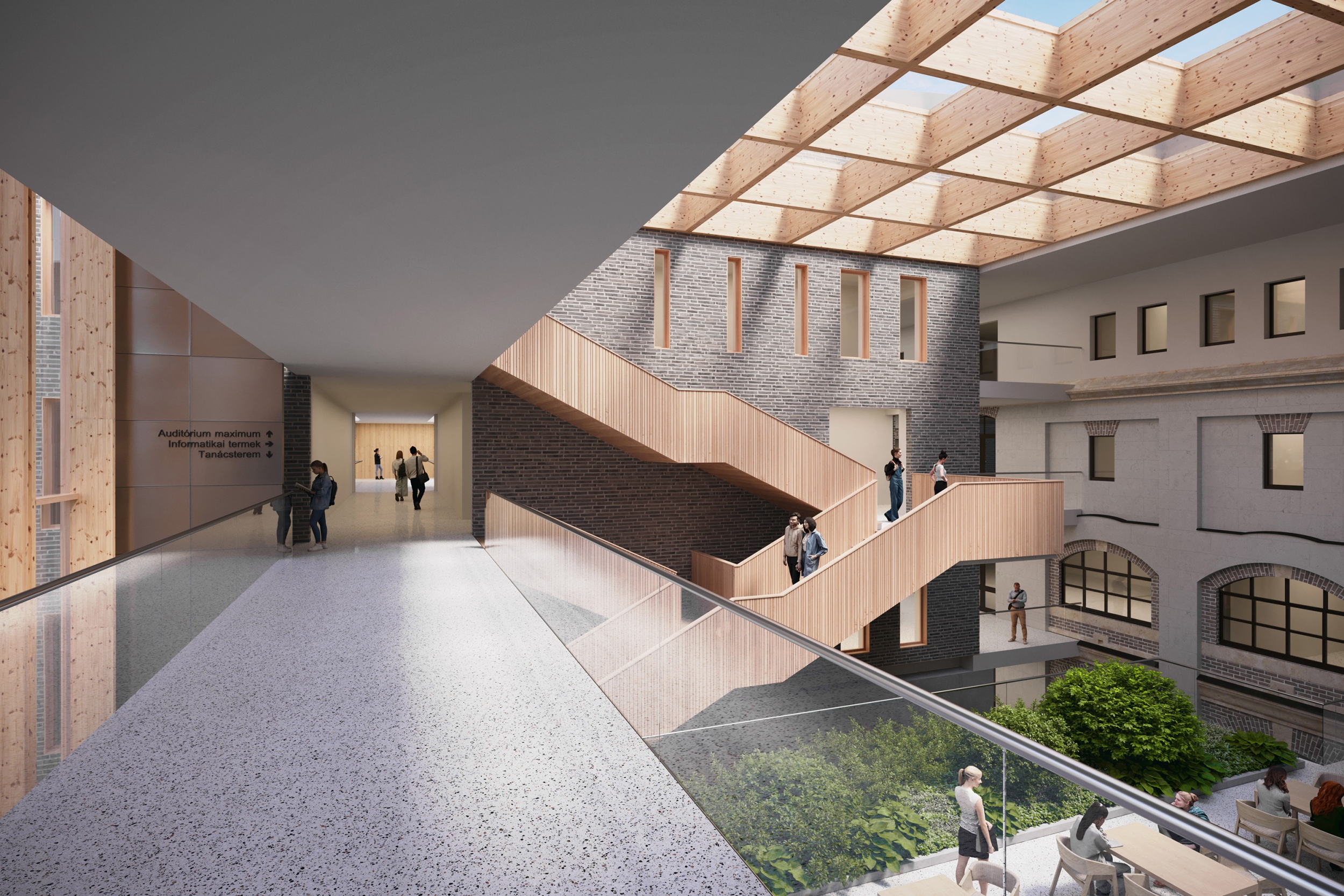 Az aulatér további vertikális, többszintes tereket is összeköt, melyek felfelé átlátásokat és összenézéseket teremtenek. A hidakkal és térbe állított lépcsőkkel tagolt, összenyitott terek a közösség találkozási pontjai, melyek egyben mindig kilátást biztosítanak a külső térre, segítve a tájékozódást az épületen belül. Az aulaterek letisztult anyaghasználatában dominál a tantermi blokkok külső téglafalainak befuttatása és a meglévő, átalakított épületszárny történeti homlokzata. Az aulaterek fedéseként fagerendás szerkezet jelenik meg, mely emlékeztet a református fakazettás mennyezetekre, miközben lágyabb, fénnyel teli hártyaként feszülnek a téglatömbök közé. A kondicionált terek leválasztása során belső udvarok és külső udvarkertek jönnek létre. Mindkét térrészben zöld kertek teremtenek szerethető és egyben érzelmi feltöltődést biztosító atmoszférát.