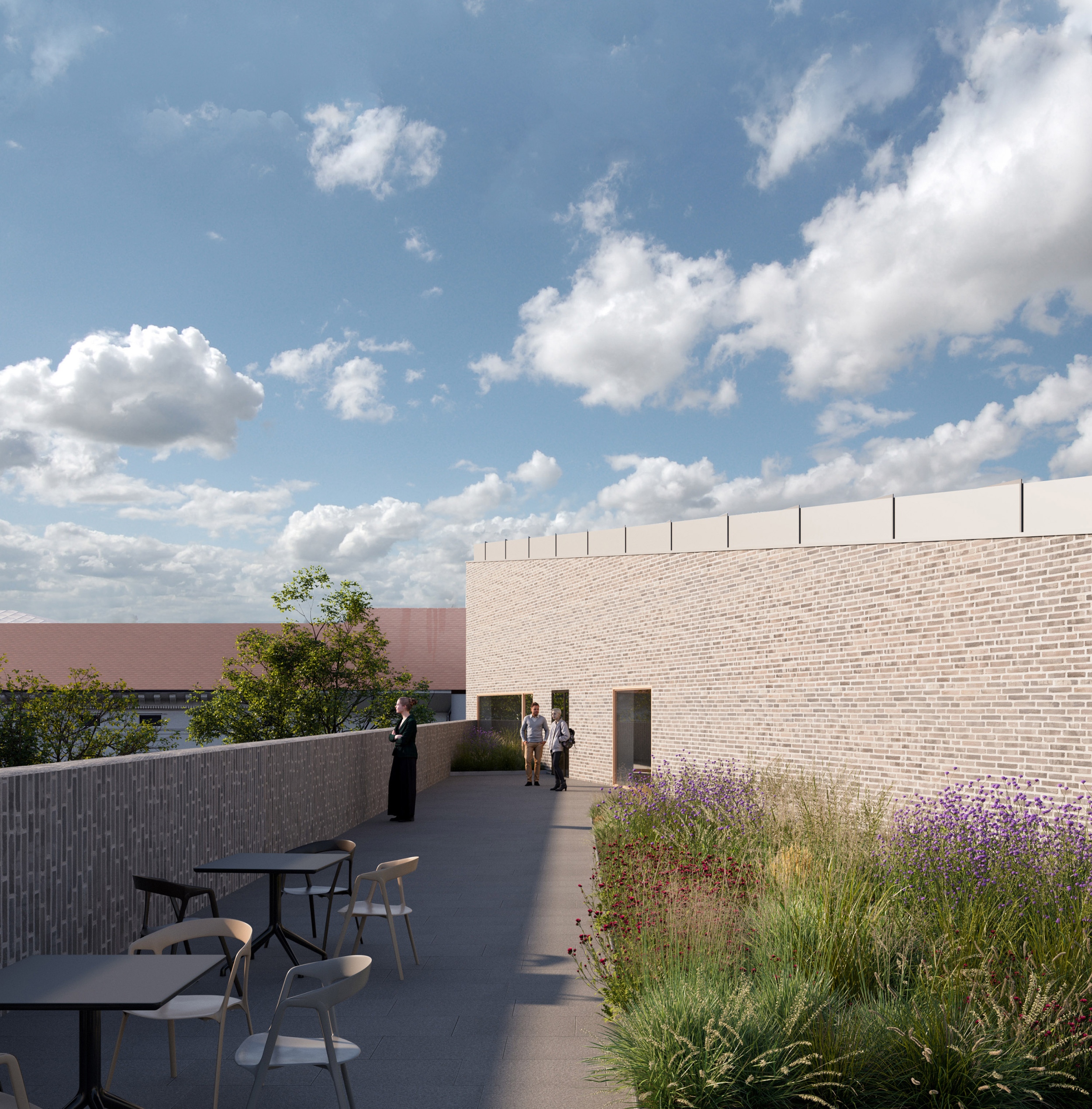 A tégla jelenléte fontos közösség, melyet büszkén vállal és folytat az új épület. A kézi vetésű fakó barna, világos agyag tégla szép átmenet a vakolt és látszó vörös felületek között, tömörsége határozott erőt sugall. A téglatömböket kisebb-nagyobb ablakok ritmusa nyitja fel, mely az egészen keskeny réstől a nyitható ablakokon át a fix, nagy üvegezésű felületekig váltakozik, a sarkok felé tömörödik. Összeáll, mint az egyénekből a közösség. A földszinti üvegfal szerepe nem a tömbök ellebegtetése, hanem egy átlátható hártya létrehozása, mely bevezet a park felé, átengedi a park zöldjét az Üllői út felé, és folyamatos vizuális kapcsolatot tart a belső terek és a park között.