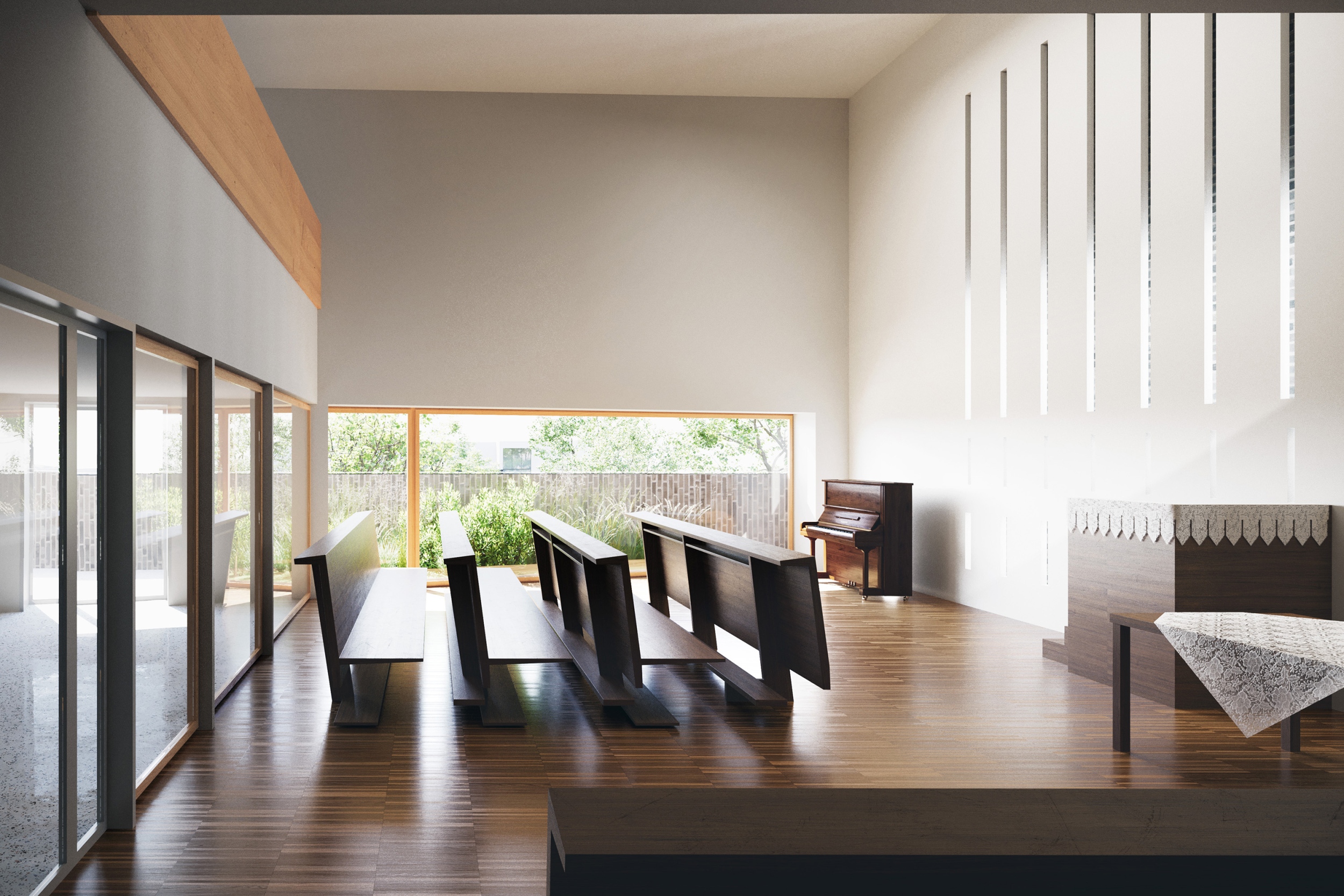 A kápolna a tervezés során egyik változatban a földszinten a park külső kapcsolatait kereste, másik változatban a könyvtári terek csendesebb emeleti atmoszféráját egészítette ki. Végül – megítélésünk szerint – legjobb helyét az Üllői úti tömb tetőszintjén találta meg, mely nyugodt, átmenő forgalomtól mentes, ugyanakkor a tetőkertekkel közvetlen kapcsolatban áll. Ablaka kilátást egy zöld kertre biztosít, de téri helyzete a zavaró külső belátást és forgalmat kizárja. A kápolna tere szorosan együttműködik a lelkészi szobákkal, létrehozva egy több kart is egyszerre ellátó lelkészi központot, biztonságos teret.