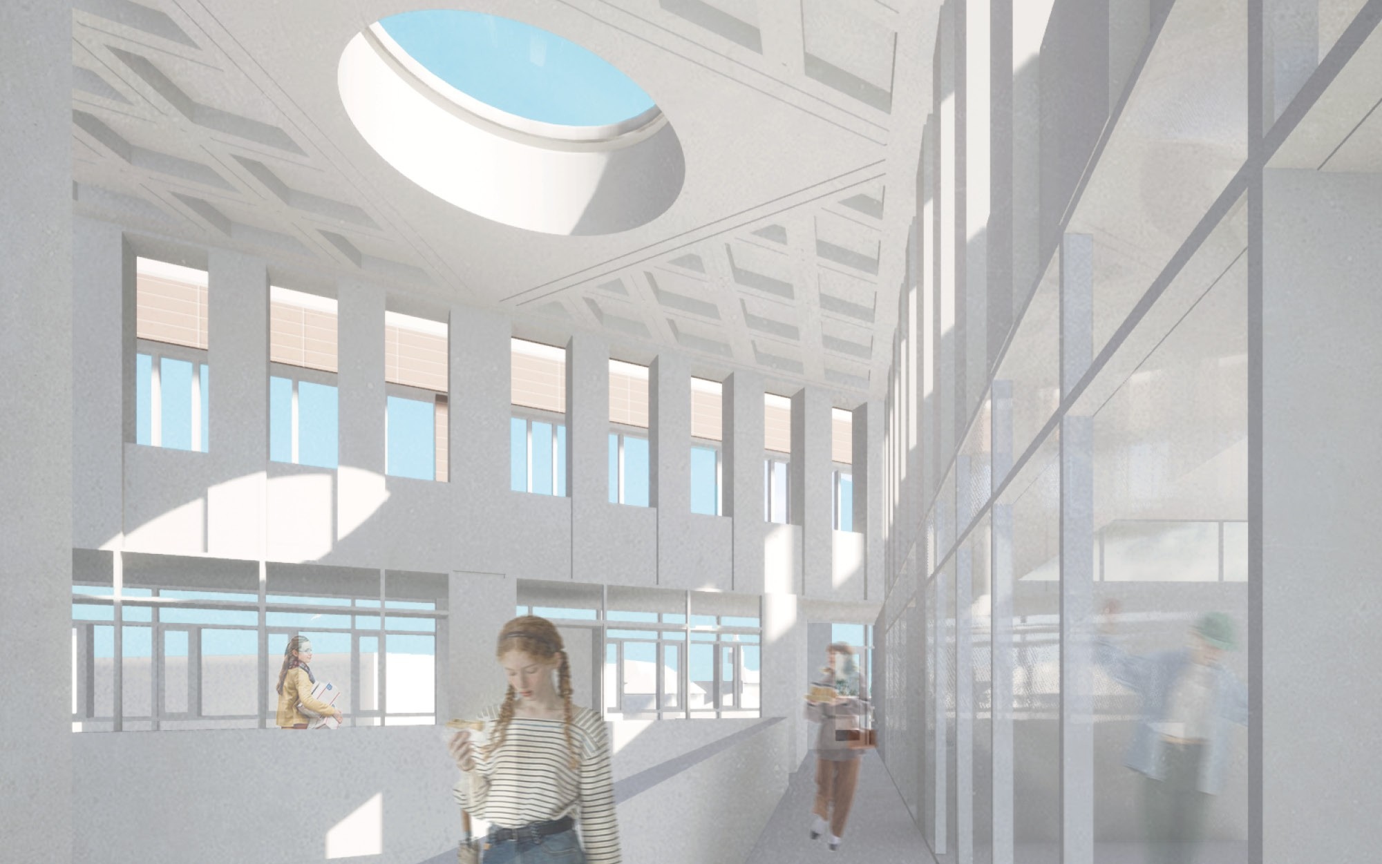 A belső kialakítás alapelve a nyitottság és a rugalmasság volt. A terek többféle használati módhoz alkalmazkodnak, legyen szó tanulásról, közösségi eseményekről vagy kisebb csoportos tevékenységekről. Korán megjelent az átriumos koncepció, amely természetes fényt juttat az épület mélyére, és vizuális kapcsolatot teremt a szintek között. Fontos tervezési szempont volt a külső környezettel való párbeszéd is, különösen a Tisza és a város meghatározó látványosságai felé.