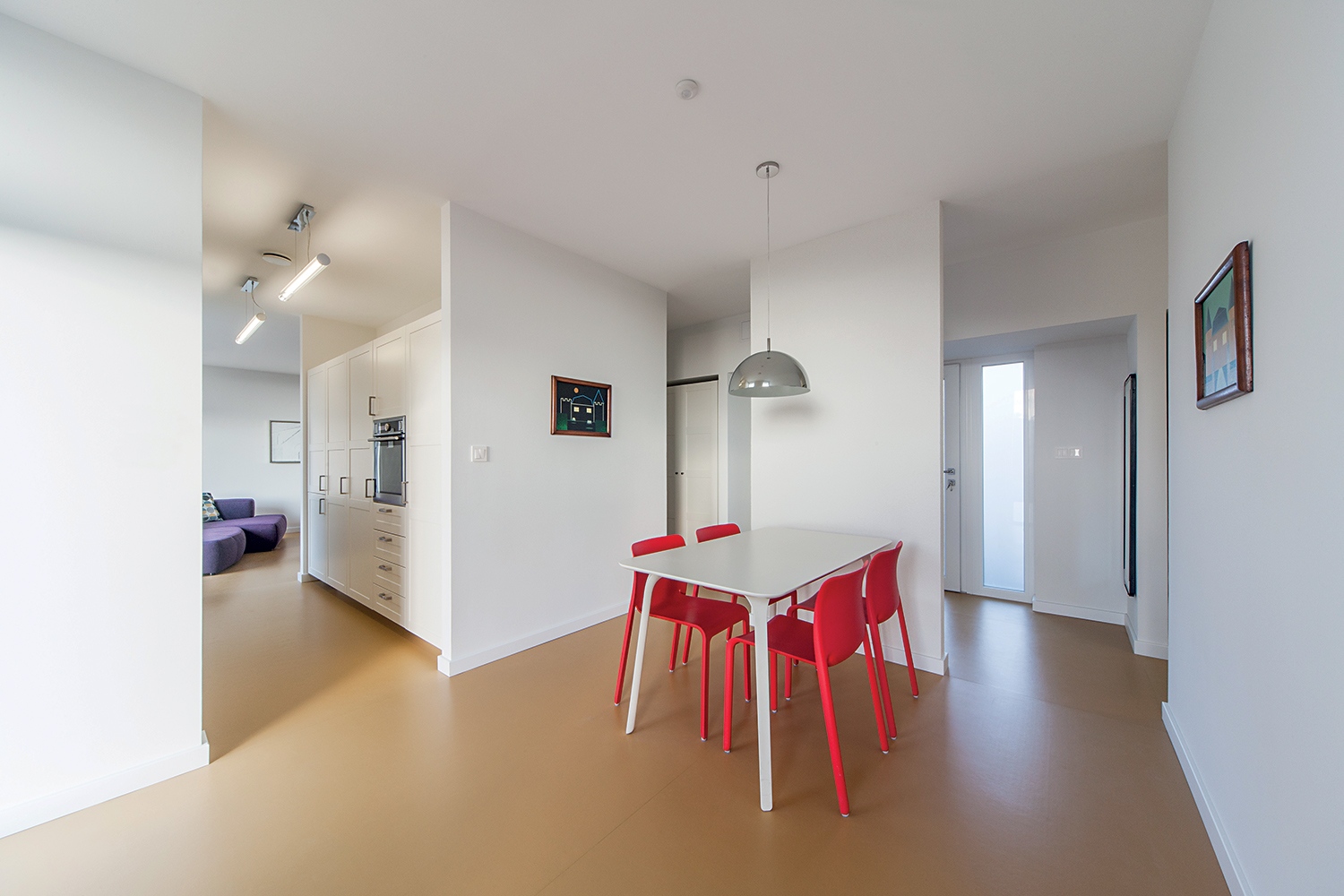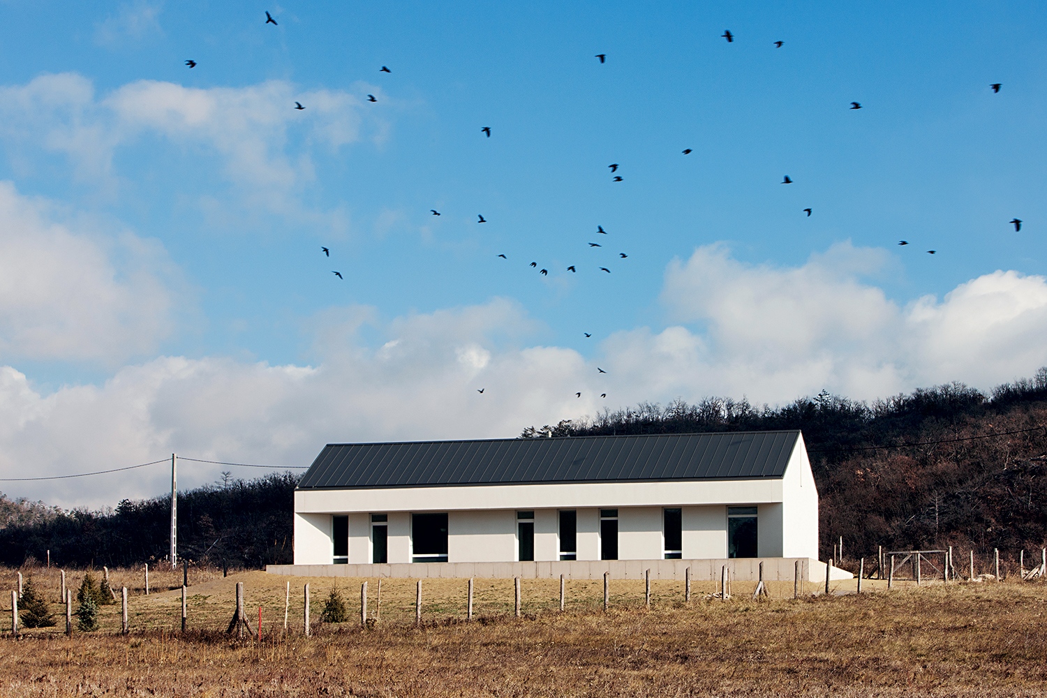 Nyáron az erős déli naptól fém zsaluzia védi a lakóteret, míg télen-nyáron egy kifinomult vezérlésű, elektromos, hűtő-fűtő légtechnikai központ temperálja a levegőt. Elképesztően professzionális, végletekig letisztult, költségvetésében, üzemeltetésben, térszervezésében, építhetőségében is hihetetlenül racionális ház lett a végeredmény. Noha alaprajzi elrendezésében, a belső terek egymásba fűződésében, leginkább a konyha centrális pozíciójában felsejlik a régi tornácos hosszú-házak téri képlete, de a nagy üveg megnyitások, a környezettel való erős vizuális kapcsolat felülírja a „paraszti építészet” narratíváját is.