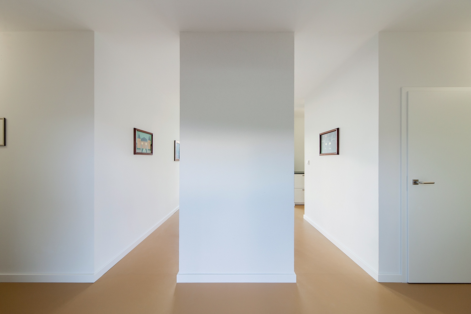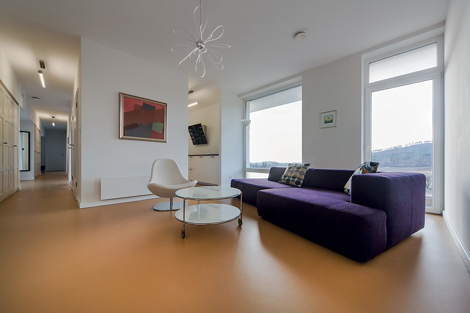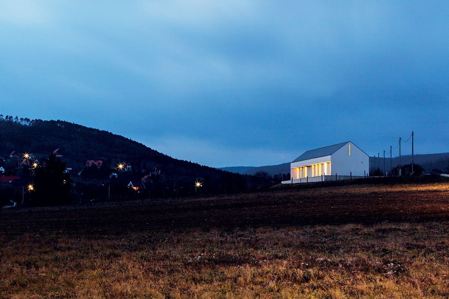 Telepítés szempontjából fontosabb azonban, hogy egy távoli zöld halom tetején, kissé délnyugati irányban a Szent Mihály-kápolna látszik. Erre a látványra fordul a ház hosszanti, nyitott, karakteres belső ritmussal tagolt üveges főhomlokzata. Ebből következik, hogy a szürke fémfedésű, túlnyomórészt mégis hófehér épülettömeg hossztengelye a lanka szintvonalaival párhuzamosan áll, így a panoráma is teljesen kinyílik, illetve a háznak nem kellett jelentősebb szinteltolással megküzdenie.