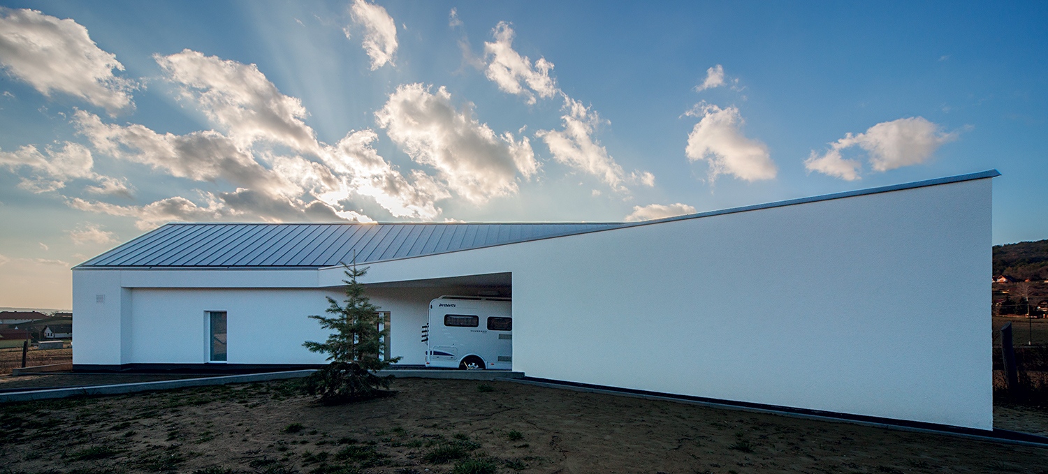 Ez az a pont, ahol elkezdődnek az esztétizáló kritika problémái, hiszen az elmondottakon és néhány technikai részleten, meg a lakóterek szenvtelen felsorolásán kívül, alig akad az épületről írnivaló. A háttérbeszélgetésben elhangzik, hogy az érkezési oldalon lévő félnyitott-félfedett, legyezőszerűen kiforduló kocsibeálló tulajdonképpen azért ideális megoldás, mert a tulajdonos házaspár európai túrákra használt lakóbusza szinte emelet magasságú, kisebb ház léptékű. A leforduló sík volt az egyetlen lehetséges megoldás, ami révén olyan takarást kaphatott a jármű, ami nem zavarja meg az épület tiszta formálását.