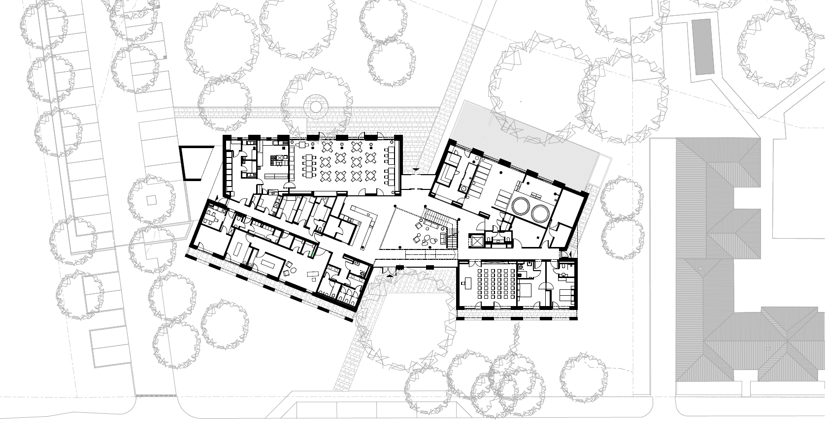 Alaprajzi rendszerét tekintve a hotel egy középfolyosós épület lenne, amit azonban az egyik ott álló fa szétnyitott és négy tömegre bontott. Középen egy nagyvonalú, kétszintes központi tér alakult ki, ide fut be minden folyosó. Ebbe a szétnyíló világba, az egyes allék között helyezték el a széleken a kiszolgáló funkciókat: például a liftet, az emeleten a szobaasszonyi szobát, a földszinten a recepciót és az alárendelt helyiségeket. Egyetlen fa így fellazította a tömeget, négy egységre bontotta, amelyeket az építészek a helyi hagyományokra reflektálva a jellegzetes tornácos házak modern átirataiként fogalmaztak meg. A közöttük létrejött kellemes fogadóterületen keresztül át lehet menni a parkba vagy tovább lehet menni a fürdőbe.