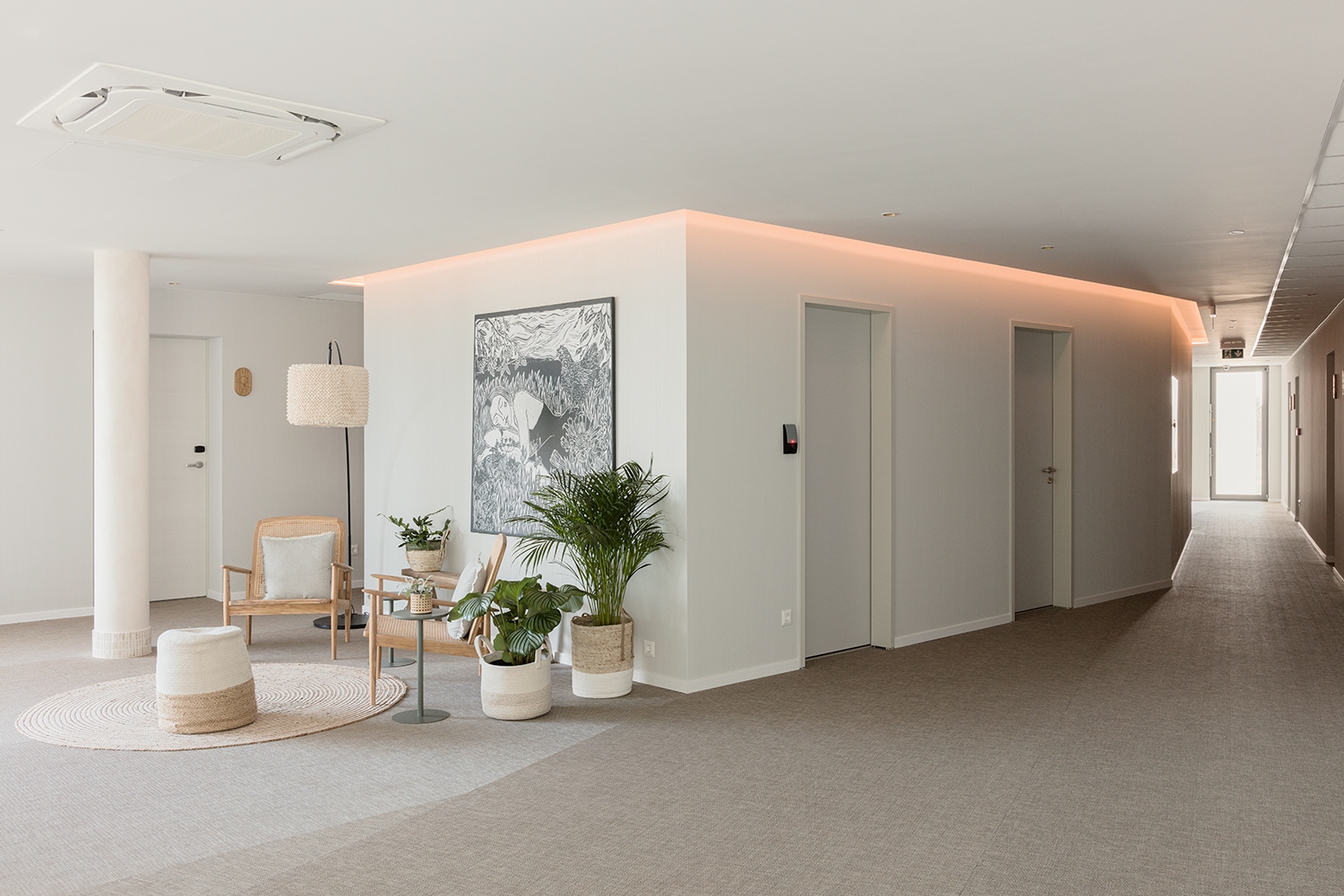 A Kirády Rita Rebeka DLA tervezte belsőépítészet nagyon sokat hozzátesz az összképhez. Visszafogott, természetes anyaghasználat és természetközeliség jellemzi, a falakon sokféle monokróm textúrával. A házba belépőt rengeteg finom, taktilis élmény várja. A szobákat, folyosókat és előtereket Csipler Vanda linómetszetei alapján készült printek teszik hangulatossá. A típustermék-ágyak és fotelek mellett egyedi tervezésűek az asztalok és a szobák előszobabútorai. Kellemesen szelíd, valódi anyagok jelennek meg, különböző finom textúrák teszik az egészet nagyon otthonossá.