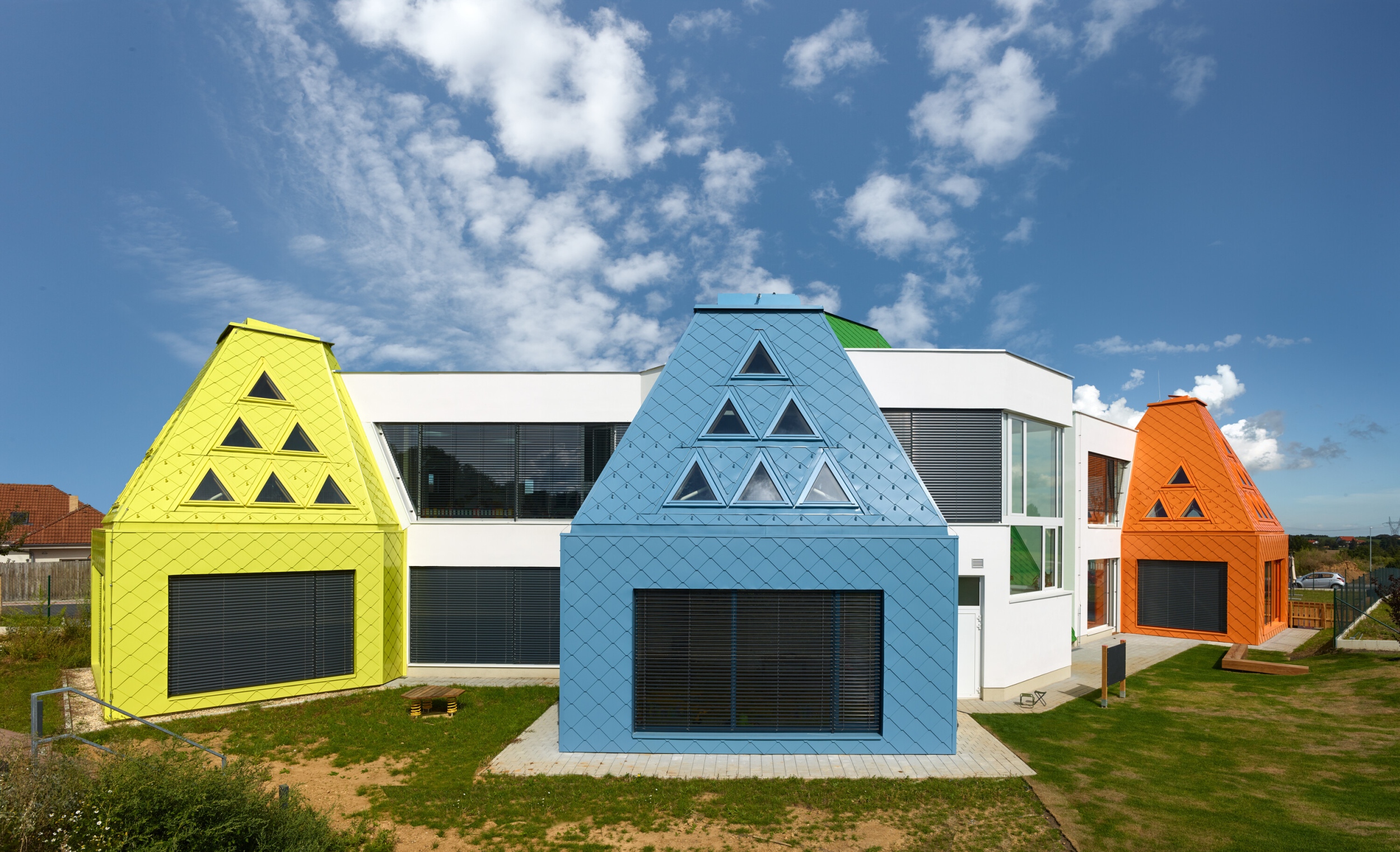 Az utcai homlokzatra függőleges zöldfelületet terveztek, amely idővel remélhetően az egész falat befutja majd. A bejárat mintha egy űrhajóba, vagy valami rejtélyes ősi templomba nyílna. A gépészetet nem rejtették el a gyerekek szeme elől, figyelemmel kísérhetik és megérthetik a víz, a levegő, az elektromosság mozgását az épületen belül. A vidám színek kívül-belül felderítik az épületet. Az épület mögötti játszótér anyagi okok miatt még csak részben készült el, ide is egy képeskönyv világát álmodták a tervezők.