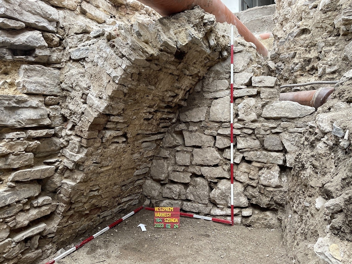 „Veszprémben már a középkorban is állt vár, amelyet a 14. századtól egészen biztosan kőfallal vettek körül. Egy helyen azonban olyan falszakaszt tártunk fel, amely még ennél is régebbi” – mondja Hegyi Dóra, a Magyar Nemzeti Múzeum Közgyűjteményi Központ Nemzeti Régészeti Intézetének ásatásvezető régésze. A veszprémi várnegyed 18 érsekségi épületének megújítása jelentős műemléki beruházás, amely kiemelt régészeti területen zajlik, emiatt hangsúlyos régészeti munka kíséri – ennek részeként tárták fel a Piarista Gimnázium udvarán azt a két és fél méter vastag, a 13-14. század fordulójából származó falszakaszt, amelyre már az 1970-es években felfigyeltek a szakemberek.