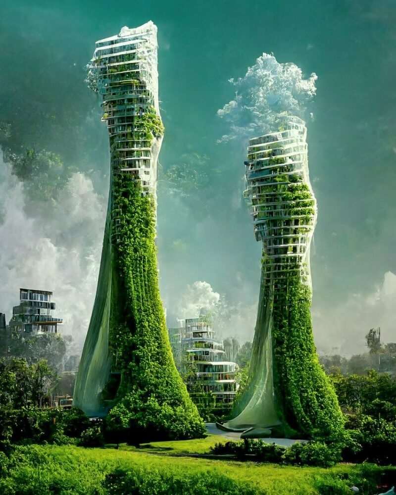 Az indiai építész ezúttal olyan kifejezéseket és kulcsszavakat bízott a Midjourney intelligenciájára, mint „szimbolikus”, „biomimetikus”, „folyékonyság”, „toronylakások algából és biolumineszcenc anyagból, melyek a jövő nagyvárosainak levegőjét képesek tisztítani”, „HD”, „HQ”, „hiperrealisztikus”, „fotorealisztikus”. Mindezekből pedig megszültetett ez a lenyűgöző eleganciával hullámzó, egymásba folyó, főként fehér és zöld tömbökből álló, organikus városkép.