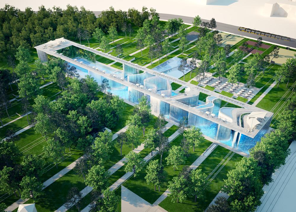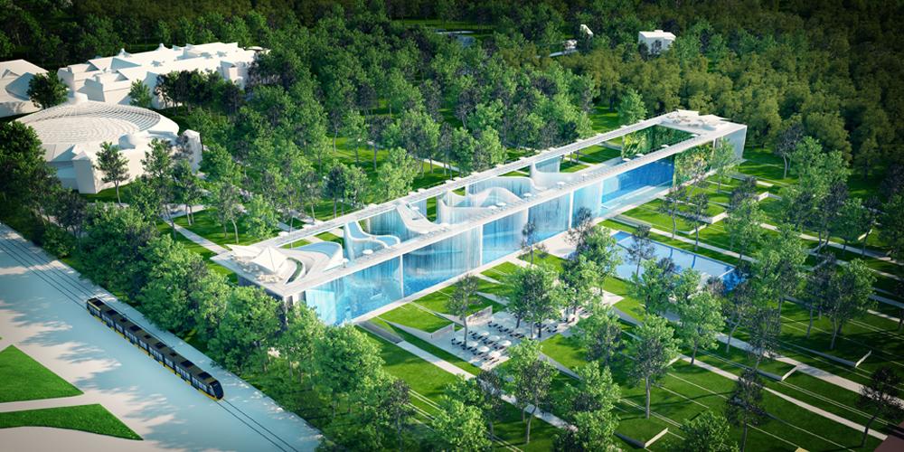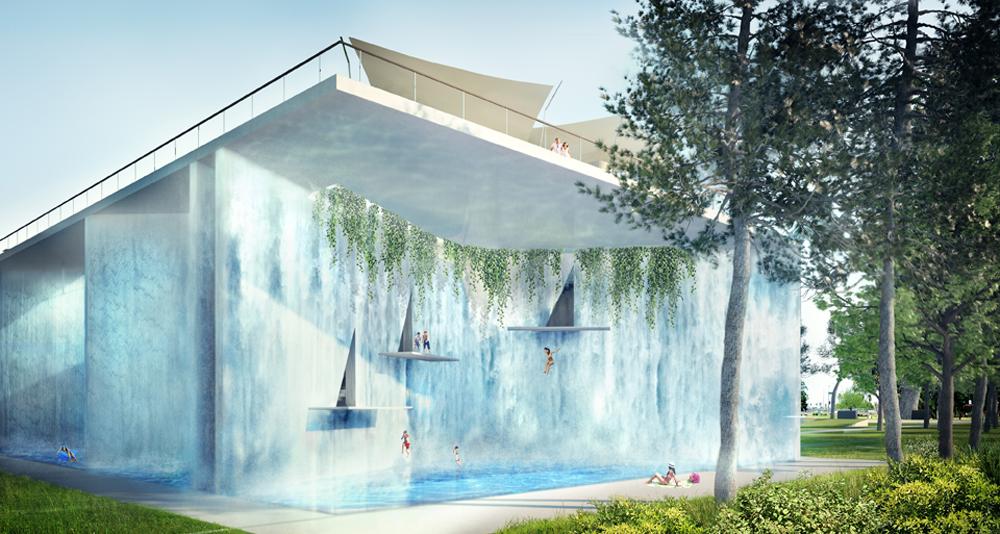 Így alakult ki az ötlet, hogy egy minden irányból könnyen megközelíthető és átjárható épületet hozzunk létre, keretül szolgálva a bekerülő funkcióknak, ahol a külső és belső tér egymásba folyik, ahol a kinti és benti rész egymástól nem teljesen lehatárolt, ahol már a megérkezésnél a fejünk felett úszó látvány és élmények ígérete mágnesként vonz, belépésre ösztönöz. Legyen ez egy hely, ahol a víz 3D-ben látható.