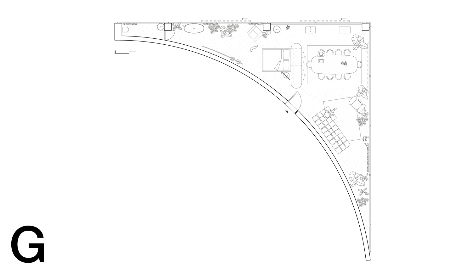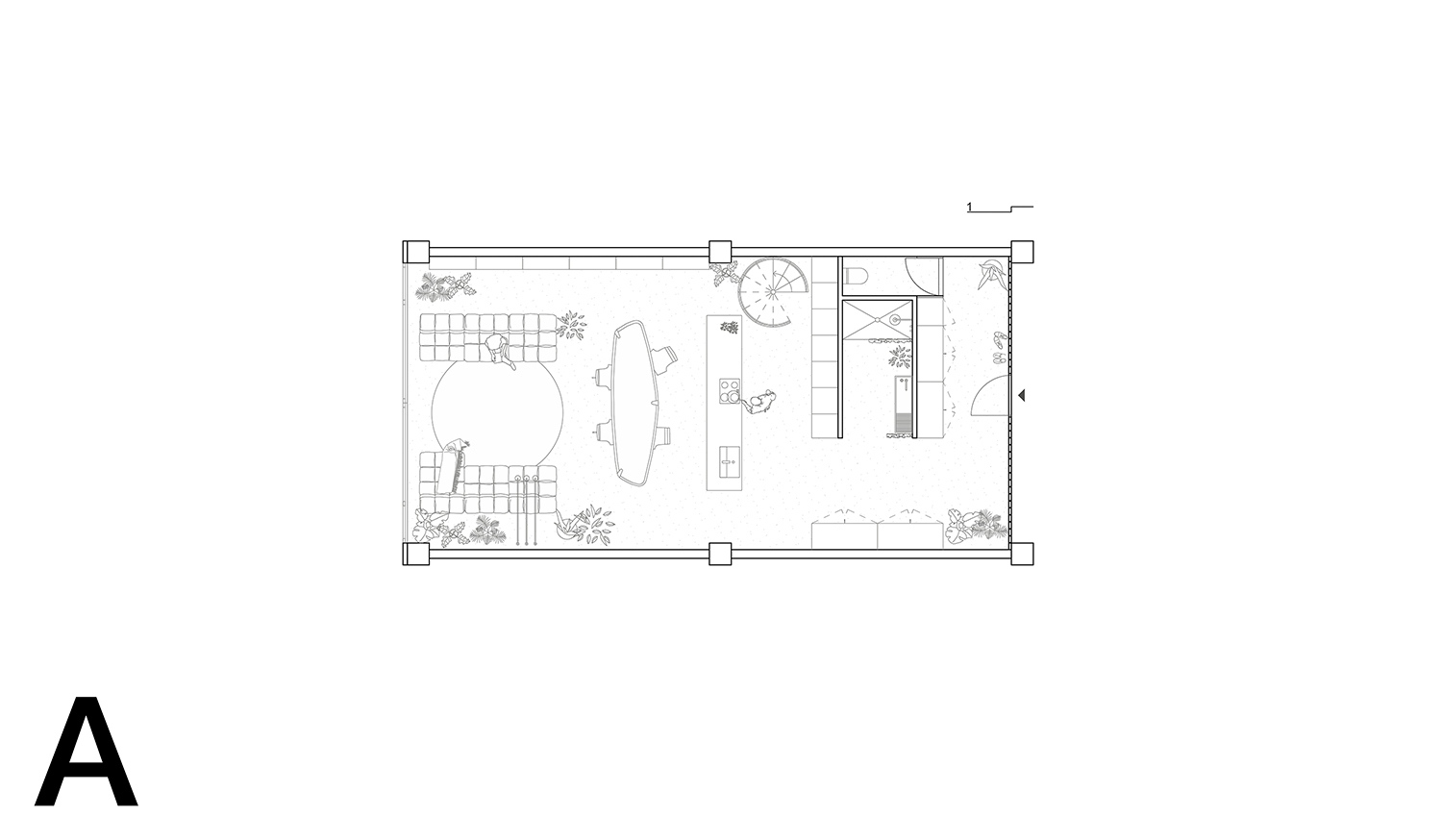 Az első emeleten az impozáns lépcsőtér melletti terület a lakásokhoz tartozó, közös használatú nappali-konyha-étkező tere, a szociális interakció, a közösségépítés helyszíne, a tetőkertre néző, megmaradó megnyitásokkal. Az íves falú kiselőadó a lakókat kiszolgáló házimozi teremmé alakul.