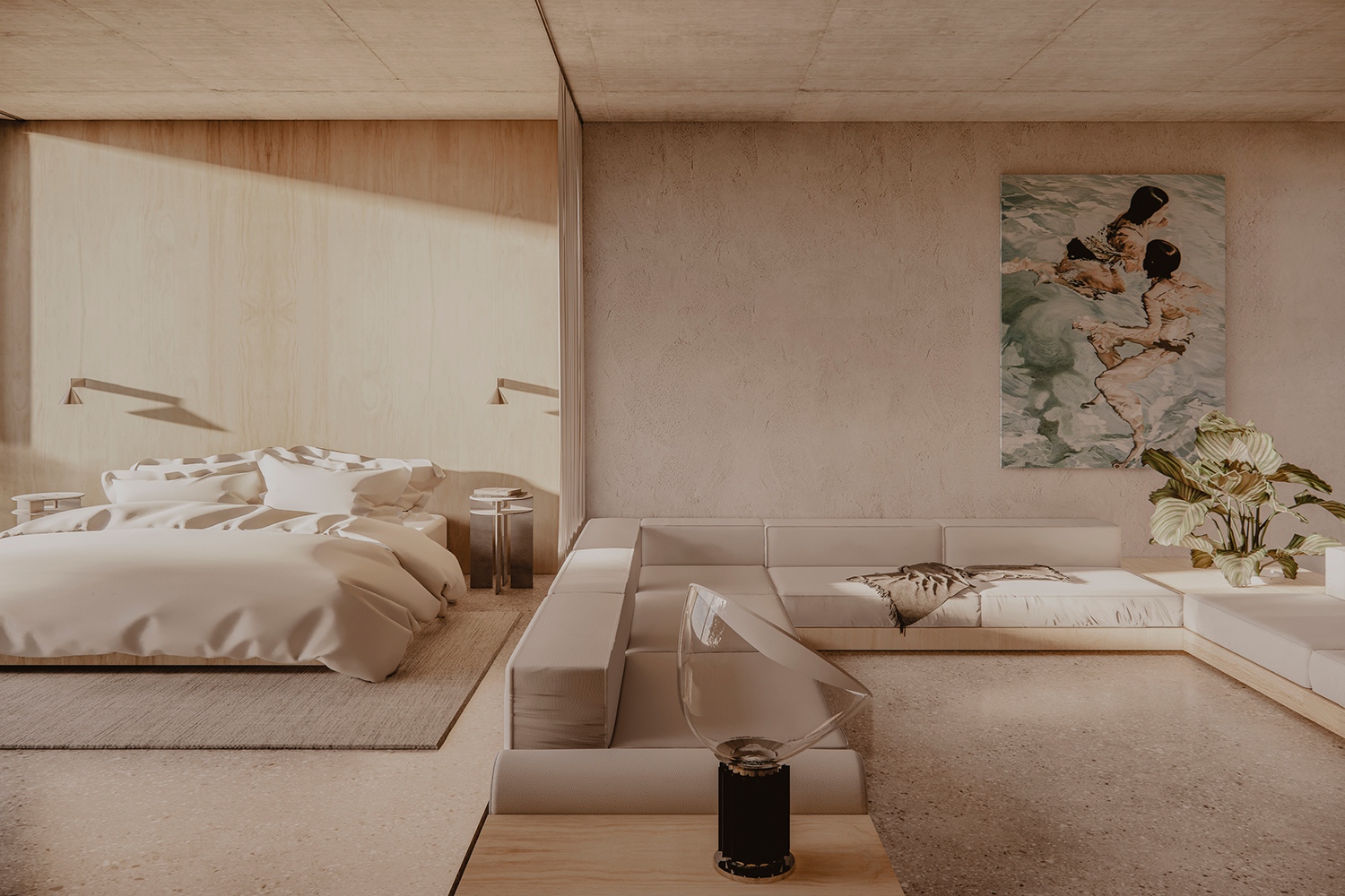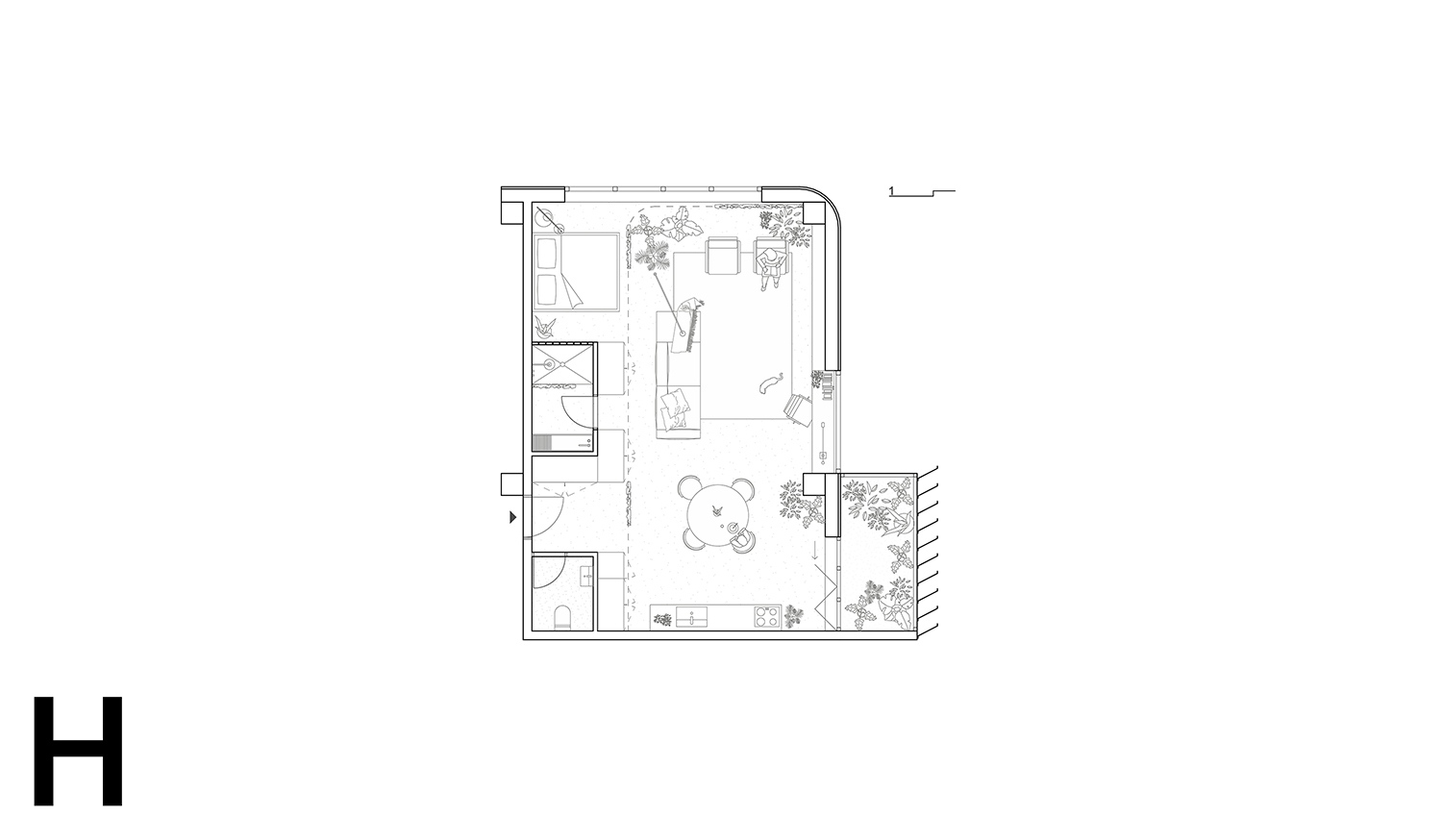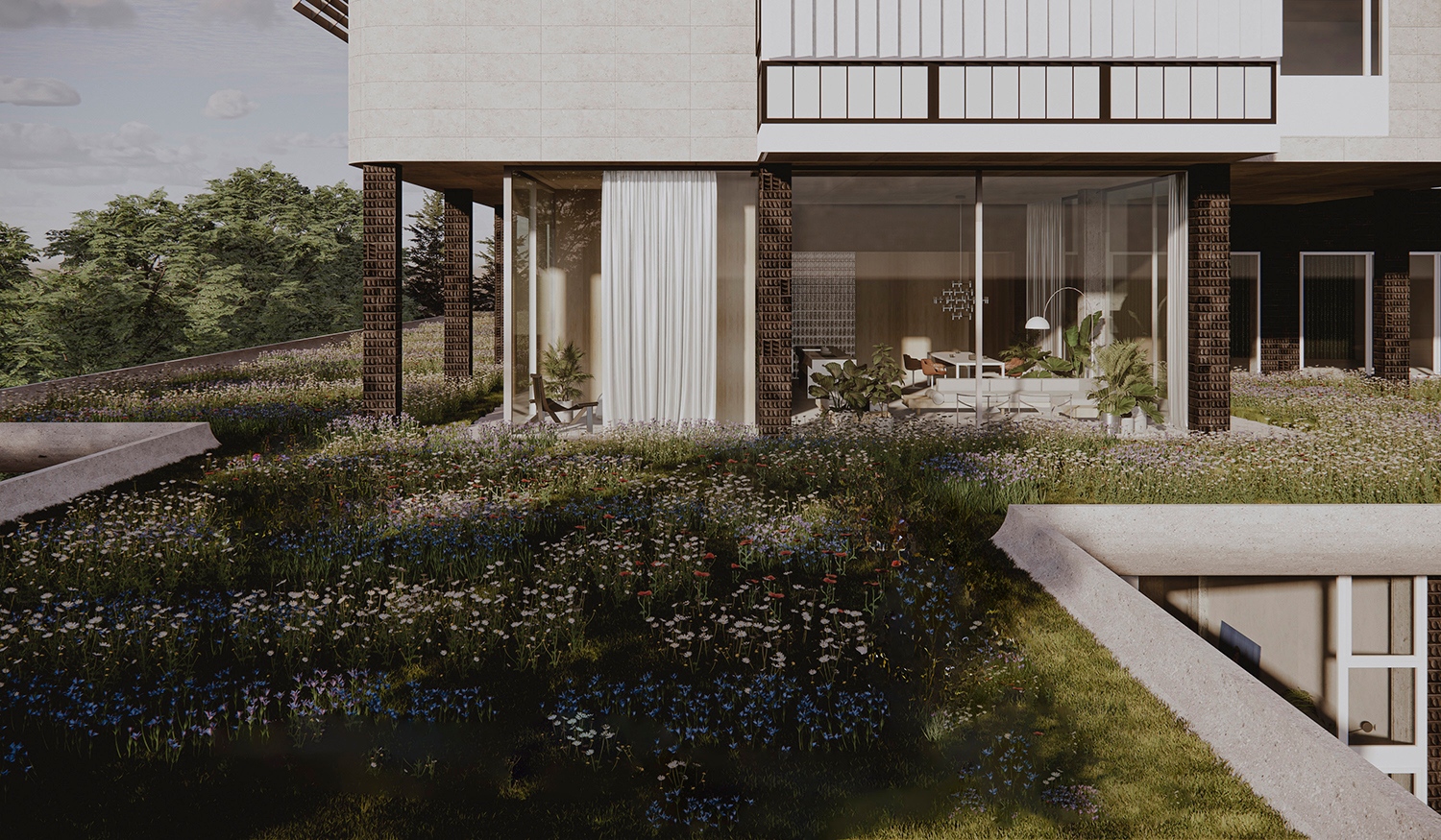 Az alsó szinteken, egyedi helyzetekben találták meg helyüket a különleges lakások. Többek között lakással egészülnek ki az emeleti kihasználatlan fedett-nyitott terek, a nagy előadótérből nyíló, íves, kerámiaburkolatú háttérfallal rendelkező háromszög alaprajzú terek, valamint a háromszintes tömeg alatt, két végén szabadon maradt árkád. Mindegyikhez közvetlenül tetőterasz kapcsolódik. A nagy lapostető felületen virágos rét, méhlegelő idilli világa szeparálja az egyes lakásokhoz tartozó, saját használatú tetőrészeket. A földszinten, közvetlenül a városi nyüzsgésben, az oldalkertekben kialakított gazdasági bejáratok helyén visszaállított kertrészekre orientált, nagy belmagasságú lakások alakulnak ki.