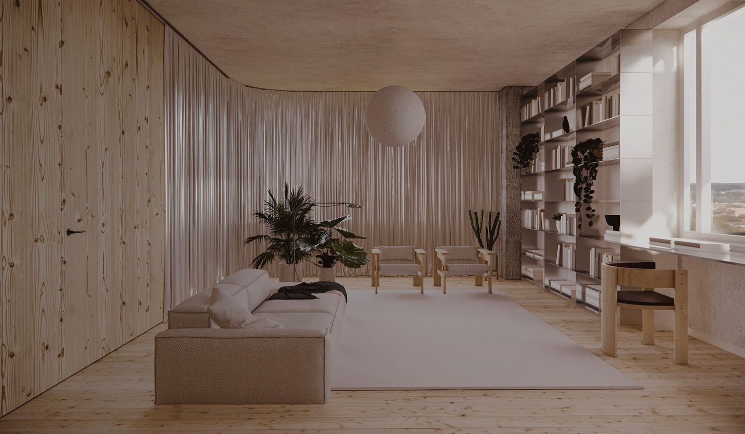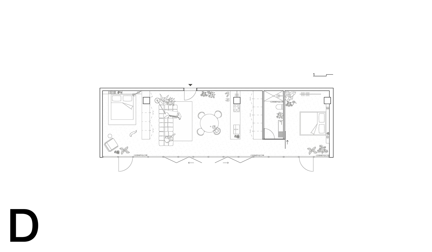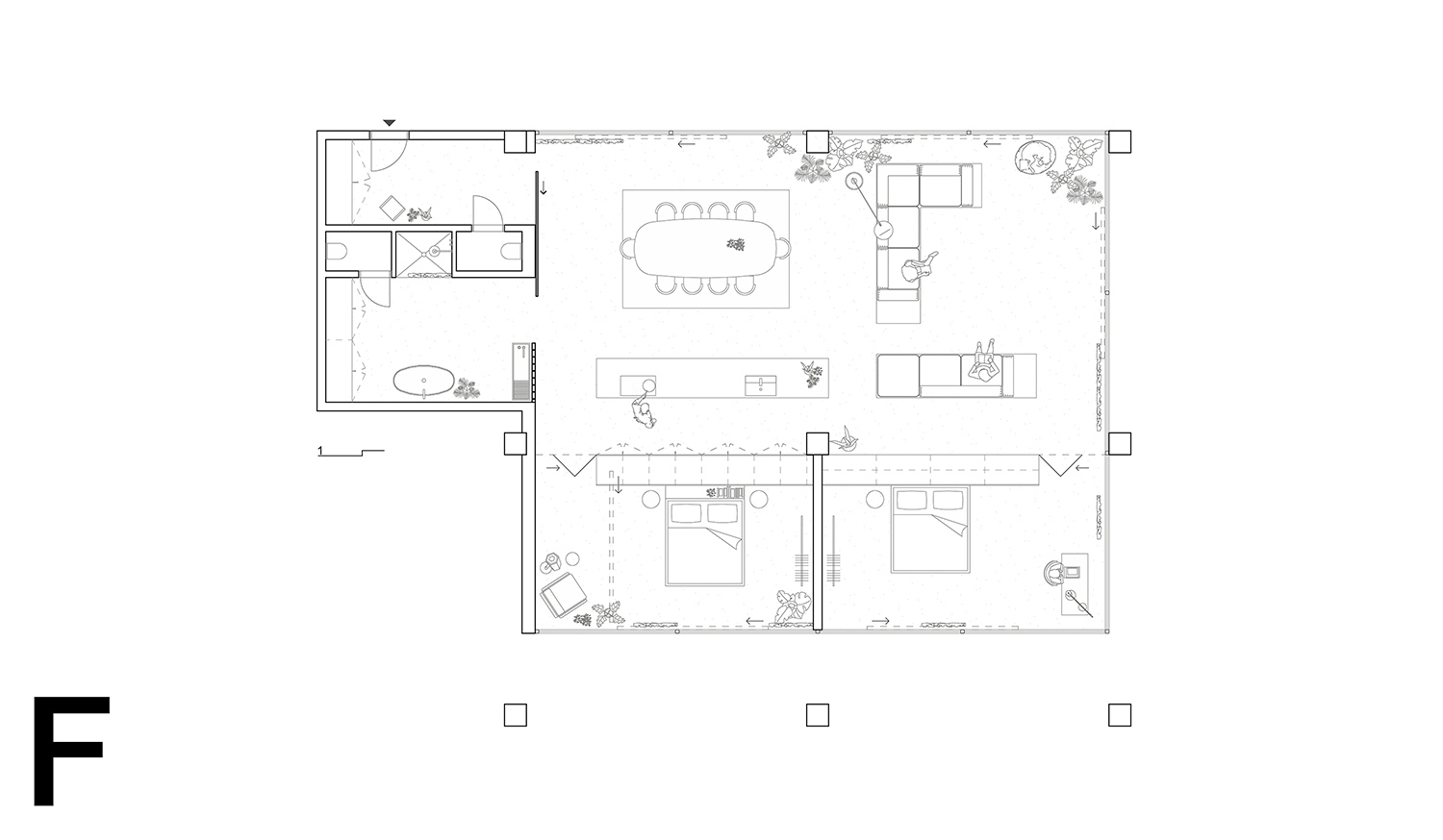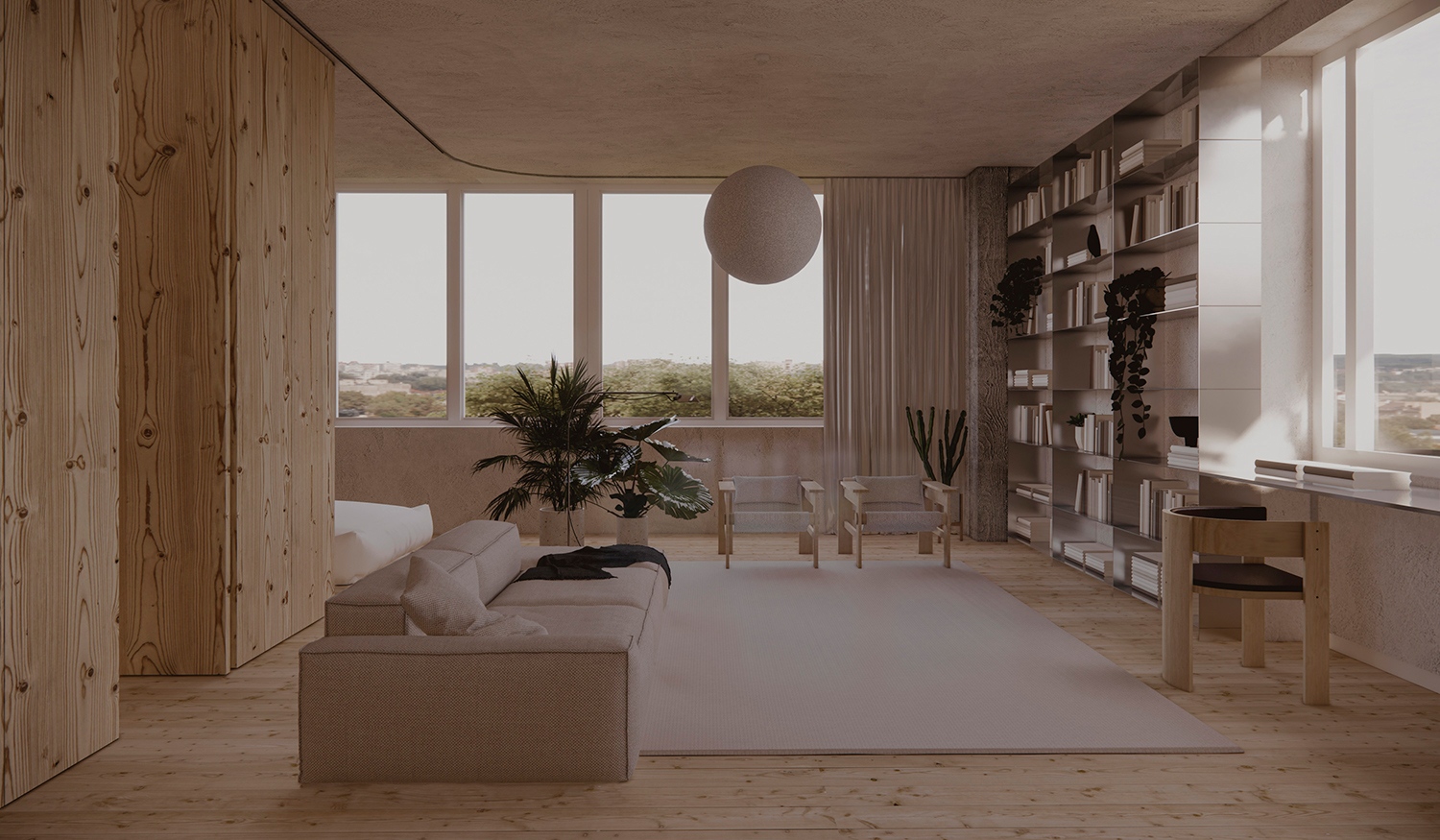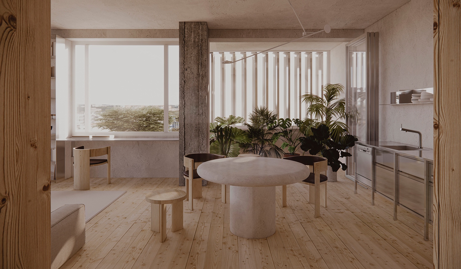 A meglévő struktúra belakására törekszünk. A felső három irodaszinten a kisebb lakások koncentrálódnak, hétköznapi kivitelben. A mérleg nyelve a homlokzatok megtartása – a parapet bontások elkerülése felé billen. A lakásokhoz közvetlenül csatlakozó erkélyek helyett az épület tetején közösségi kert alakul ki zárható fedett terasszal, kerti étkezőasztallal, közös használatú nyári konyhával.