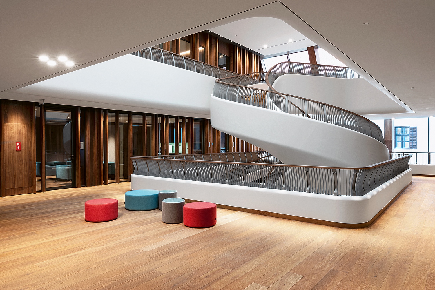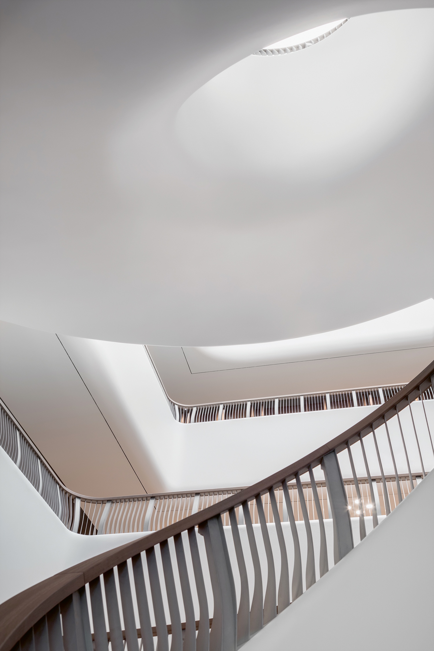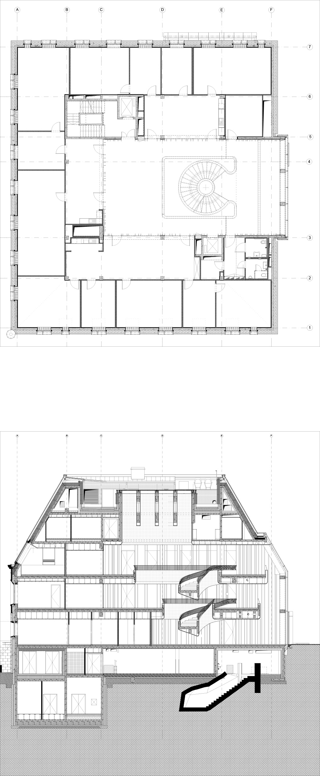Megbízói elvárásra a homlokzat udvariasan illeszkedő, egy kőtömbből faragott ablakkávái középkori előképeket idéznek. A visszafogott eleganciájú belső tereket a minden részletében átgondolt, intelligens világítással ellátott átrium szervezi, amelynek puha formáit az építésziroda visszatérő motívuma: közösségi térként és esztétikai elemként is értelmezhető, húzott karú csigalépcső uralja. Ahhoz, hogy az évszázadokon át alakítgatott, mégis szűkös és kötött alaprajzú kolostorépületet a miniszterelnöki reprezentáció kereteihez igazítsák, jó szolgálatot tett a párizsi Élysée-palotához hasonlóan előudvarként átértelmezett belső kert.