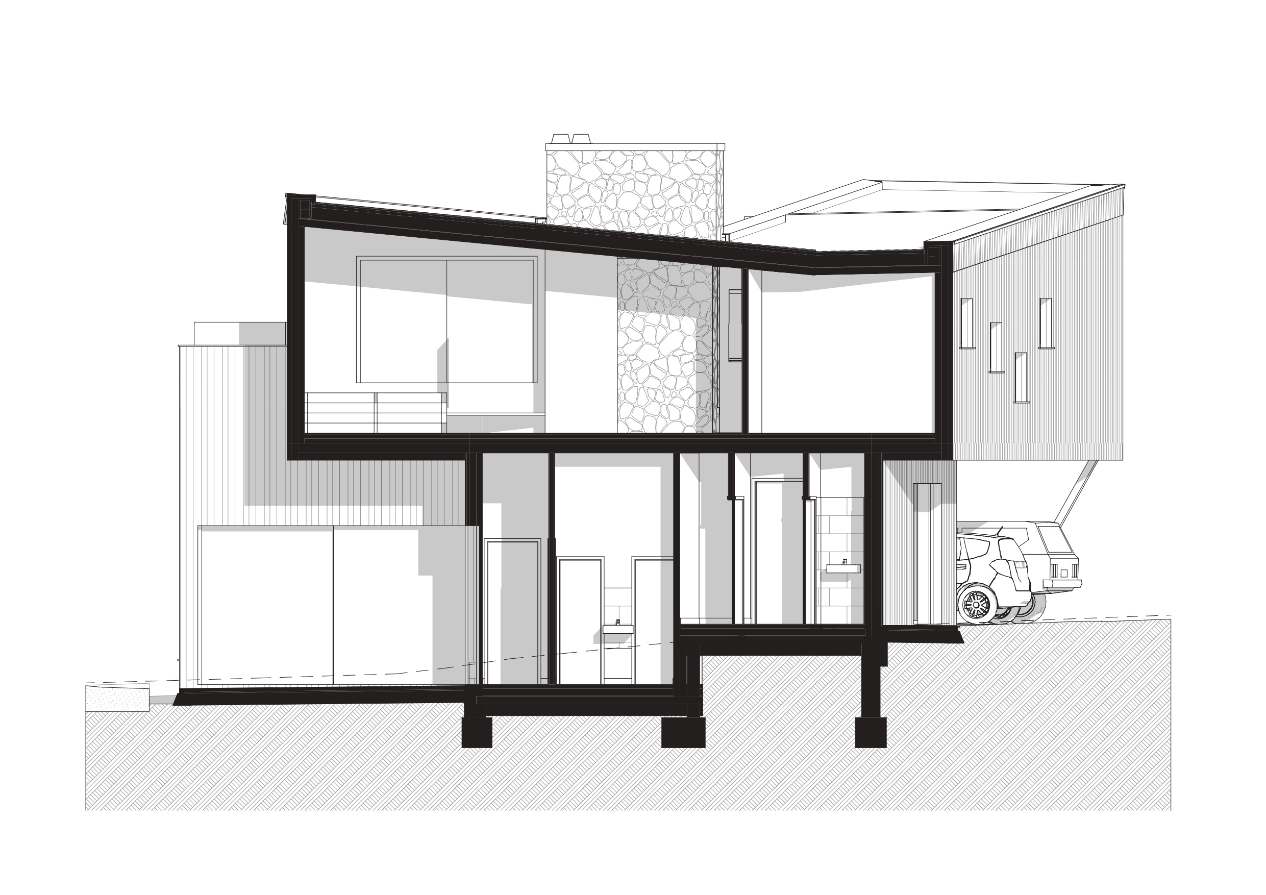 A ház vertikális középtengelyét képző kéménypillér köré szerkesztett épület két szintje egymáshoz képest minden irányban elmozdul, ezáltal a különböző funkciók jól szeparálódnak. Mindkét szint belső és külső terei elfordulnak egymásból: így sikerül mind a közösségi, mind a privát tereket kellően elválasztani úgy, hogy azok közben a környezet felé teljesen megnyílnak. Mind az alsó, mind a felső szint közönsége el tud vonulni a külvilág és a másik szinten tartózkodók elől, az adott teraszokon elmerülni a végtelen tájban. Az emelet elfordulása egyúttal lebegéssé válik, a térbe kilépő szárnyakat mindössze filigrán, törékenynek ható oszlopok tartják. A felső szint leginkább intim, védett része – a szülők és a gyermekek hálószobája – külön nyúlványként lép ki az épület tömegéből, az autóbeálló fölé nyúlik, a vége csak egy valószínűtlenül kecses tartópilléren nyugszik.
