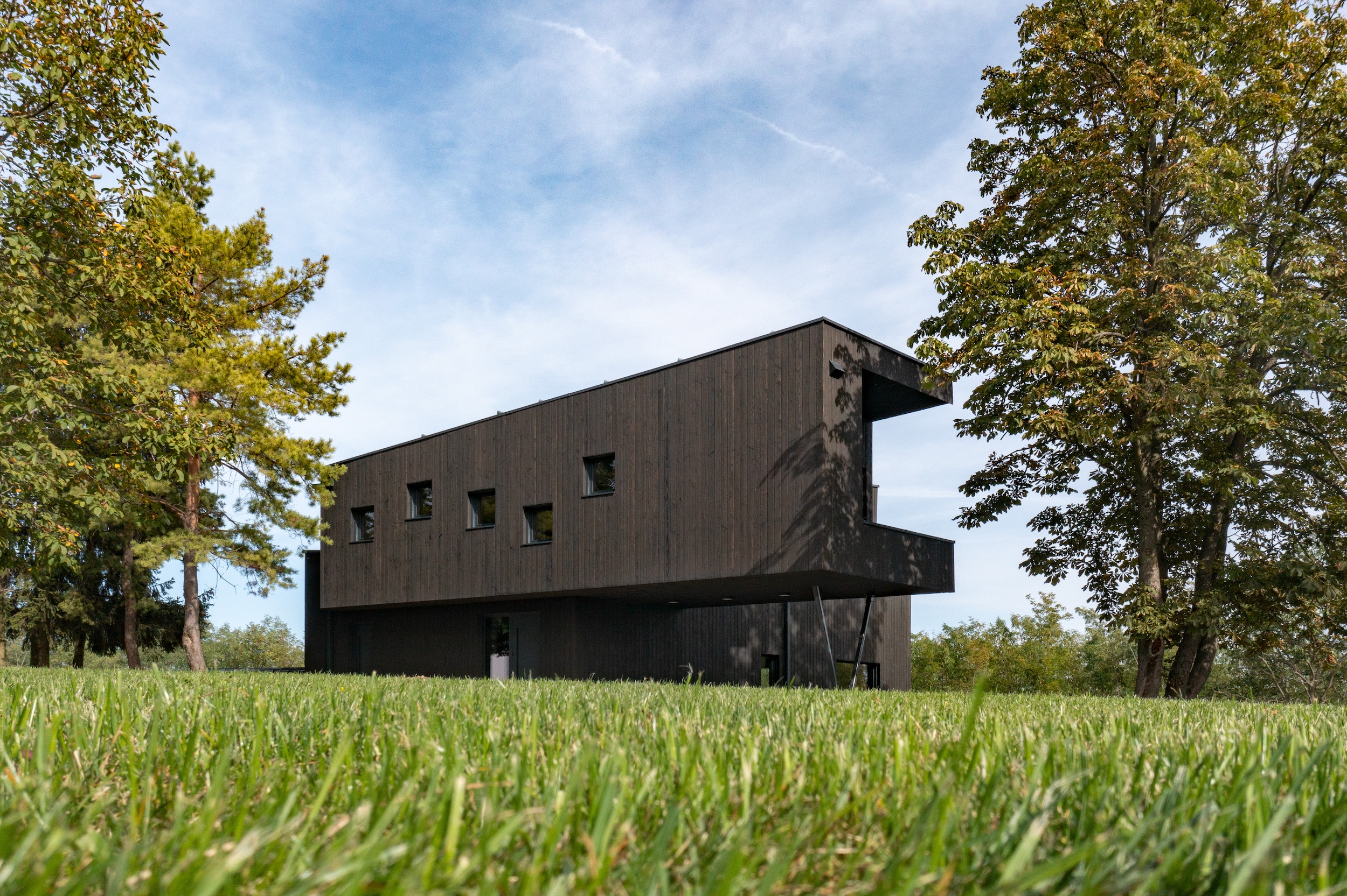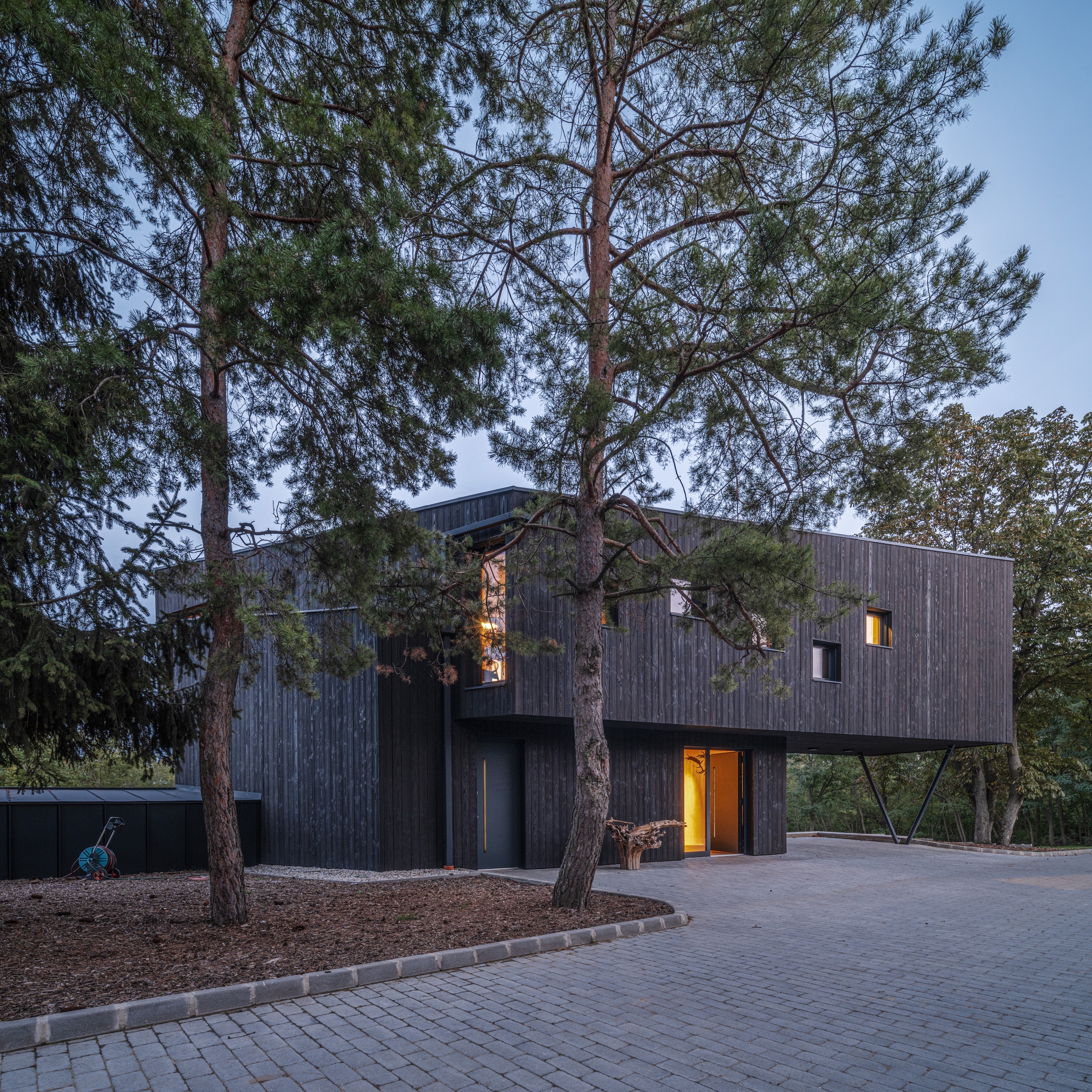 Távol mindentől, a világ zajától, a települések fényétől, az erdő mélyén áll egy ház, ami invitálja a vadásztársakat és a családot egyaránt. A kettős küldetésű ház égetett deszka homlokzatával, kifordult formáival szokatlan látvány, mégis az erdő részévé tud válni. Cikkünk az OCTOGON magazin 187-es (2023/7-es) lapszámából.