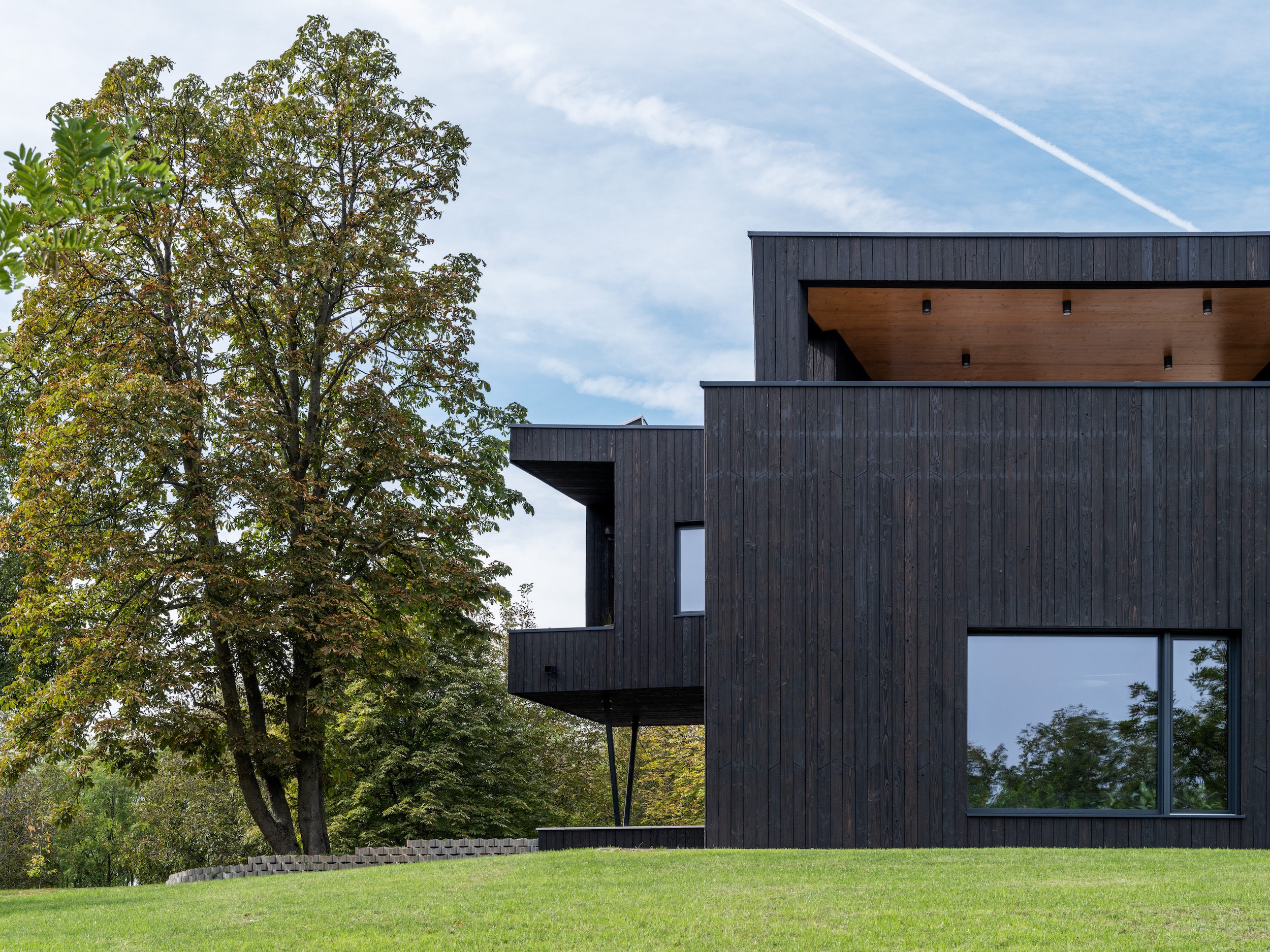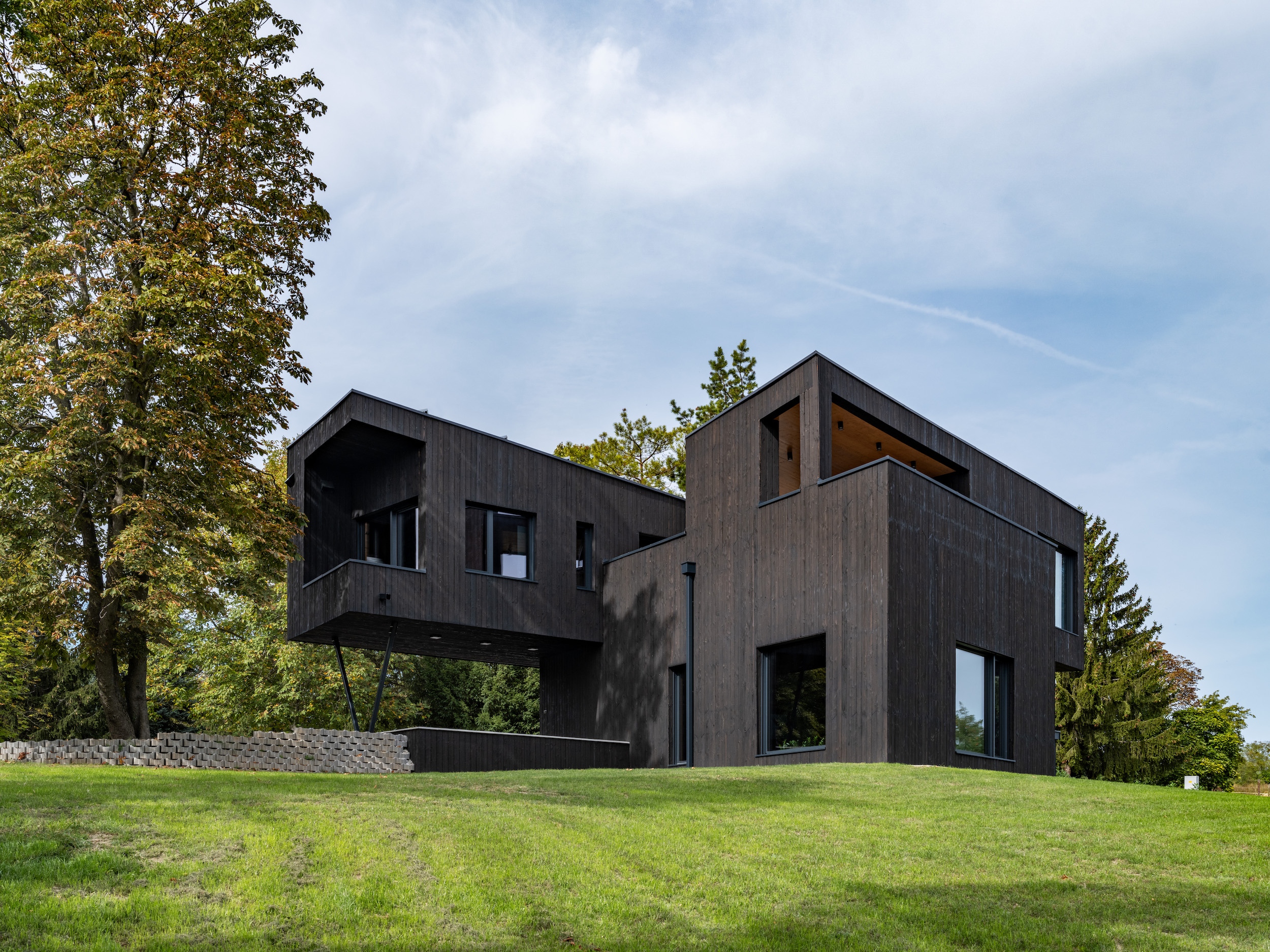 A megérkezés irányából, az autóbejáró felől az épület zártabb, komorabb, míg az előterében elterülő rét, az alatta meghúzódó völgy és azon keresztül az erdő felé már teljesen nyitott. A felső szint terasza és a szülői hálószoba elkülönülő, jól elhatárolt erkélye a lombkorona fölött teljes panorámát nyújt a végtelenbe tartó dombság irányába. A homlokzatot égetett és olajjal kezelt deszkafelület burkolja, ez adja a karakteres sötét, már-már feketének is mondható összhatást. A deszkák textúráját a fa természetes rajzolata alkotja, de emellett a hosszabb deszkaszálak a vágásuknál kaptak egységes, folyamatosan visszatérő ritmust. A nagy üvegfelületek szintén sötét, antracit keretezés kaptak, a fény ellen pedig külső, a nyílászárókkal és a tartópillérekkel azonos színvilágú árnyékoló véd.