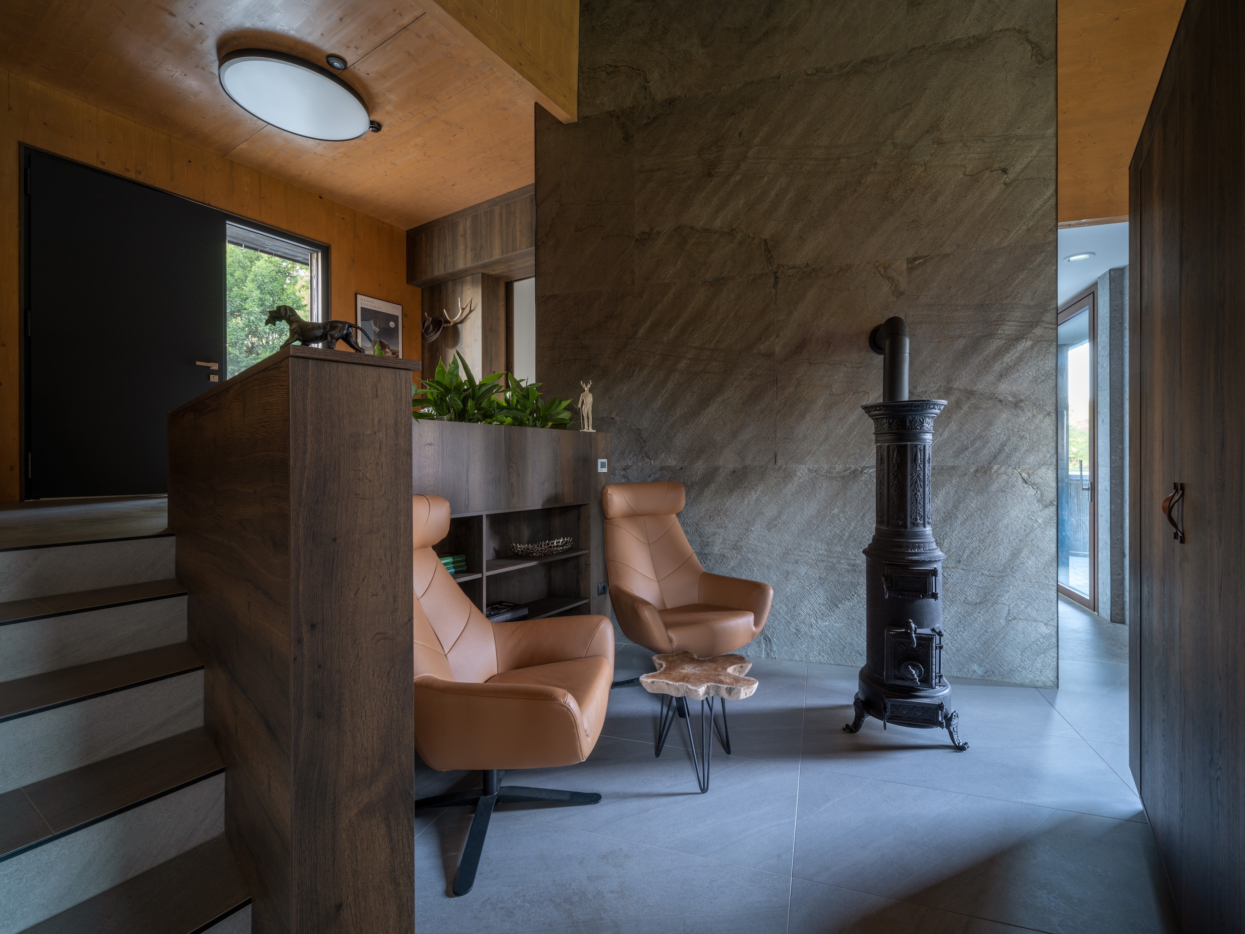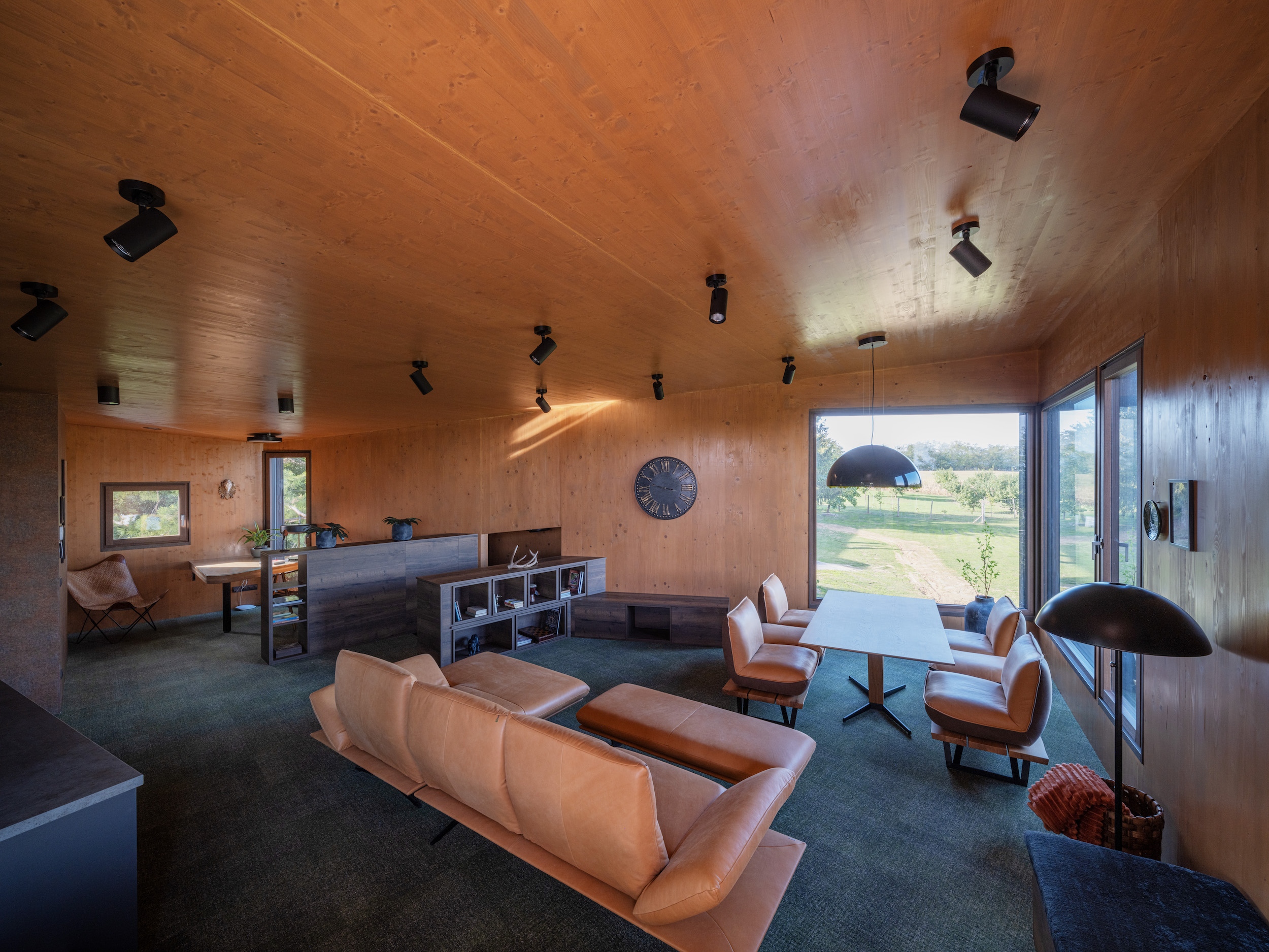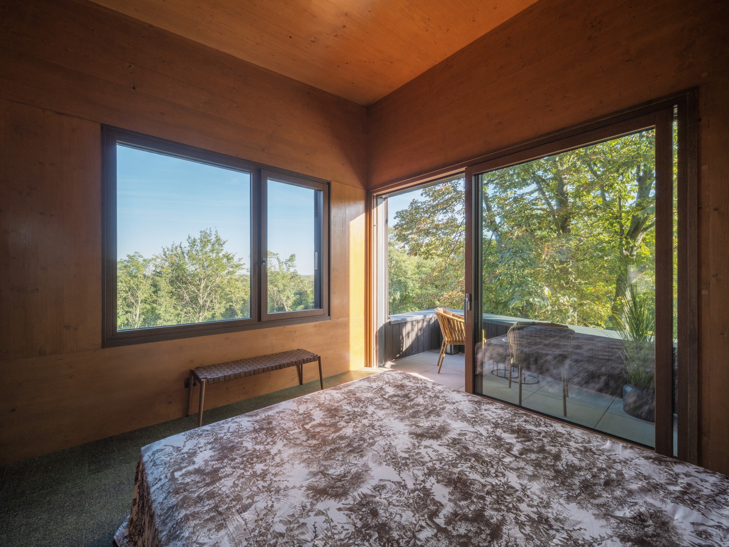Erre az összetett képletre kerestek és találtak megfelelő megoldást, amit végül az anyag, a funkció és a forma közös nevezője hozott el. A megtalált anyag a CLT technológia lett, ami lényegesen lerövidítette a területen zajló hangos munkavégzés és a szerkezetkész állapot előállításának idejét. Az előre gyártott paneleket ideszállítva „csak” össze kellett szerelni, az így elkészült zárt tömbben már nyugodtan lehetett folytatni a beltéri munkálatokat. A technológia sajátossága segített a formavilág megtalálásában is, amelynek legfőbb célja az volt, hogy a két funkciót, ami akár két különálló háznak is értelmezhető, úgy gyúrja egybe, hogy a két világ érintőlegesen találkozhat ugyan, de ne zavarja egymást. Emellett persze mind a közösségi, mind a privát szféra teljes értékű tereket, nyitottságot, panorámát, kényelmet kapjon. Az építészeket nyilván megihlette az erdő széli környezet, az ezáltal nyújtott formavilág: lehulló ágak, elhullott agancsok.
