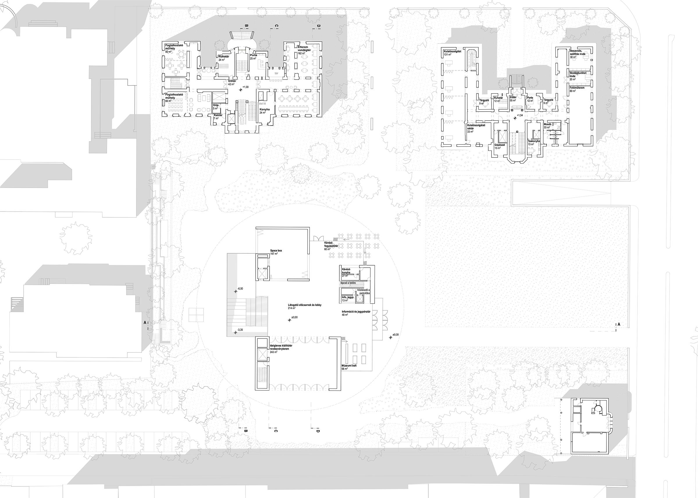 Ezt tükrözik a tervünk eltérő karakterű és működésű terei. Az állandó kiállítás jellegéből adódóan klasszikusabb, teremről teremre végig járható, magába forduló formában, a Herczel- Épületben, (az egyik történeti villában) kap helyet. Az Új Főépületben a látogatók sokkal aktívabb jelenlétével számolunk. Az itt létrehozott terek egy része tágas, osztható és napfényben gazdag (ideiglenes kiállítótér), a másik része (space box és rendezvénytér) határai nagyban alakíthatók, ezáltal szinte a kert és a lobby folytatásává válnak.