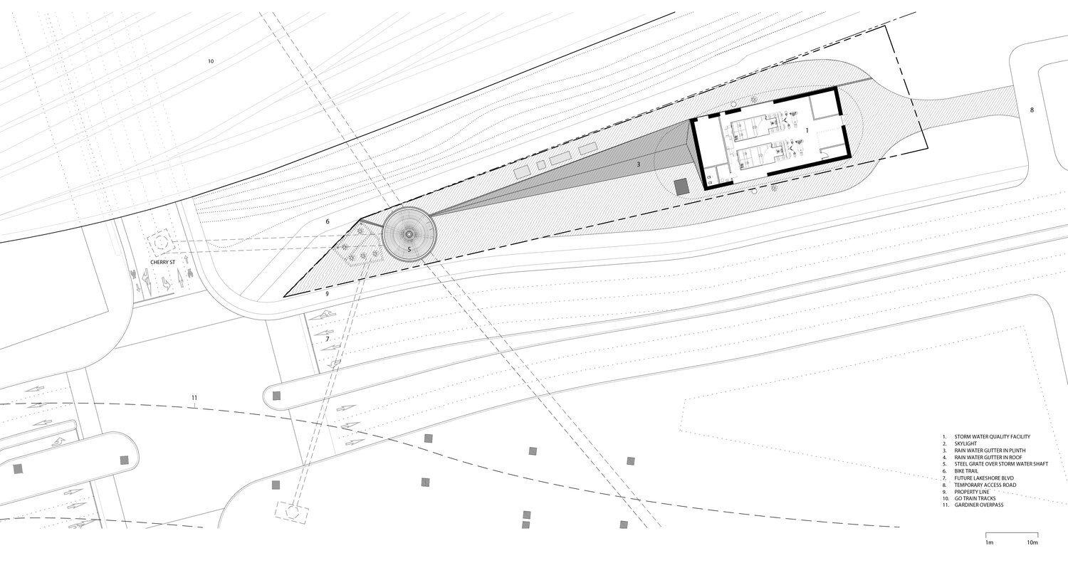 Az új fejlesztésű West Don Lands városrész elfolyó csapadékvizét kezelő Stormwater Facility (SWF) nem csak korszerű mérnöki létesítmény, de egyben műalkotás is: formája és telepítése olyan infrastrukturális létesítményeket idéz, amelyek a múltban meghatározták Toronto arculatát.