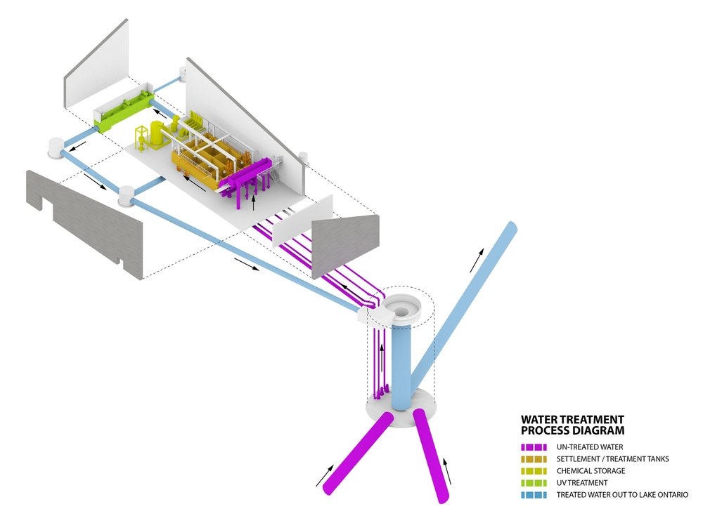 A telep négy elemet egyesít jól olvasható, didaktikus és esztétikailag lenyűgöző kompozícióvá. A csapadékvíz-tározó egy 20 méter átmérőjű, acélráccsal borított akna, amely fordított szifonként működik, és fogadja a környező fejlesztésből származó kezeletlen csapadékvizet. Közvetlenül felette található egy önálló szivattyúépület, amely a tározó szélén helyezkedik el. A létesítmény legkiemelkedőbb eleme maga a csapadékvíz-tisztító épület, valamint a létesítményt a tározóval összekötő burkolat. A Toronto új arculatát meghatározó SWF létesítmény 2021-ben jelentős városfejlesztési és építészeti elismerésekben részesült, elnyerte a Toronto Urban Design Award of Excellence, és a Canadian Architect Award of Excellence díjakat.