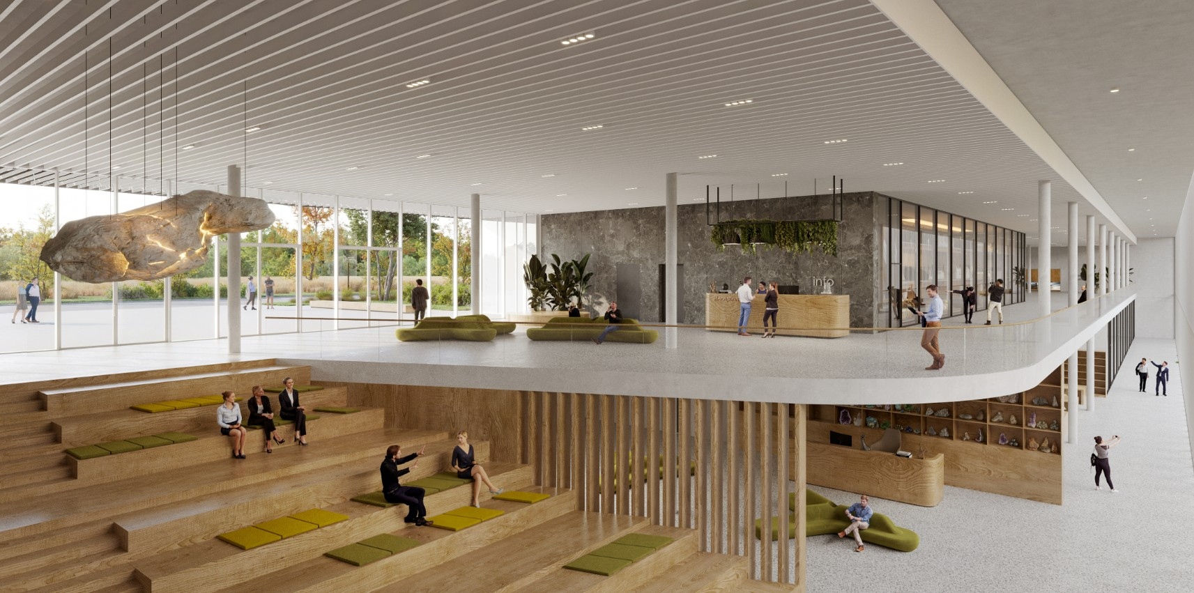 A földszinti látogatói közlekedő területek galériásan kapcsolódnak a pinceszinti publikus közlekedő terekhez. A belső átriumot bekapcsoltuk a látogatói zónába, az oda telepített gazdag növényvilág egy bejárható botanikus kert.