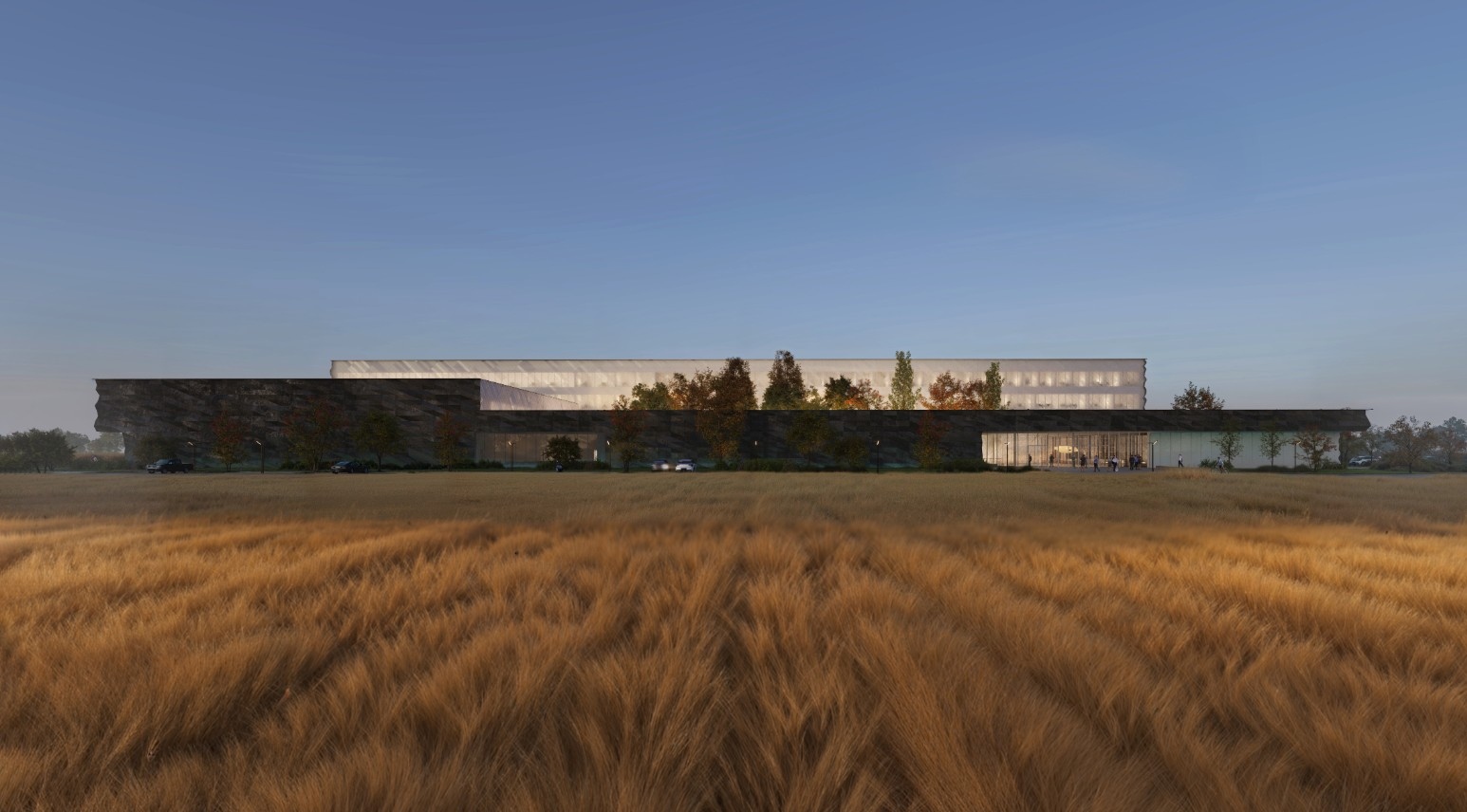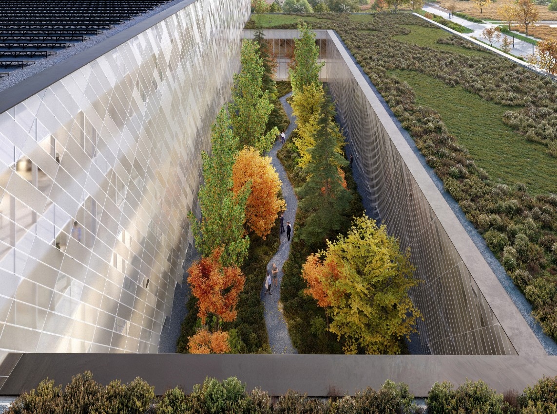 A tervezett gyűjteményi központ egy, az építési helyre befeszülő téglalap alaprajzú épület, a belsejében egy átriummal. A természetes fényt nem igénylő raktárterületek a teljes alapterületi igényből jóval nagyobb arányt tesznek ki, mint a természetes fényt igénylő iroda és laborterületek, így utóbbiakat az átrium mentén koncentrálva helyeztük el, miközben közvetlen kapcsolatban maradnak a külső homlokzat mentén elhelyezett raktárterületekkel. Ennek az alaprajzi kialakításnak köszönhetően egy kívülről tömör megjelenésű épülettömeget kapunk, a munkahelyek befelé, az „édenkertet” megtestesítő átriumba nyílnak. Ez a telepítés párhuzamba állítható az épületben folyó elmélyült kutatási munka befelé forduló jellegével. Az átriummal ellentétben az épület körüli területek funkcionálisak, déli oldalon találhatók a parkolók, nyugati oldalra került az épület főbejárata, és a gyalogos járda mellett a dolgozói parkolók, északi oldalra pedig a gazdasági udvar, innen történik mind a műtárgy mind pedig a mindennapi üzemelést szolgáló beszállítás, valamint a keletkező hulladékok elszállítása. Keleti irányban az épület teljesen zárt.
