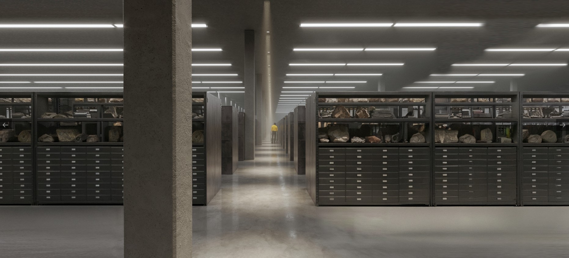 A raktárak és a hozzájuk kapcsolódó kiszolgáló helyiségek tömör horizontális blokkot képeznek, így az egyes raktárak az adott gyűjteményhez kapcsolódó műhelyekből, előkészítő helyiségekből azonos szinten, rövid úton és kényelmesen megközelíthetőek. A raktárak és egyéb helyiségek egy tengelyirányú folyosó két oldalára vannak felfűzve. Az egyes raktárhelyiségek, illetve akár egész gyűjteményrészek leválasztása is megoldható, a belépési jogosultságoknak megfelelően szeparálható.