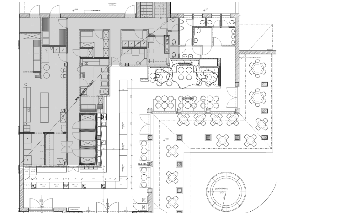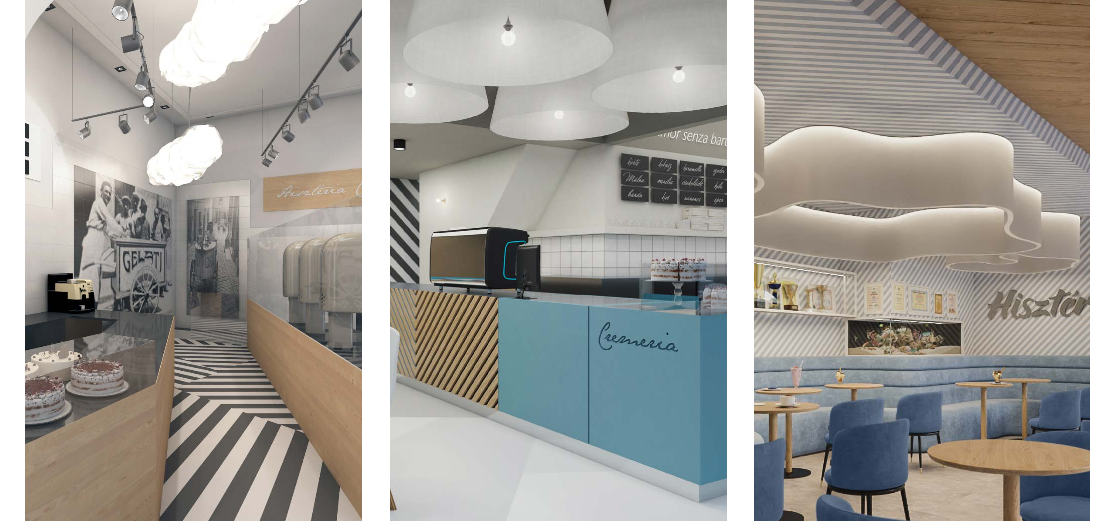Mindebből első pillantásra a szellős, harmonikus színvilágú vendéglátó-tér tűnik fel, ám ha az első ízmámorában tekintetünk a mennyezetre téved, szellemes utalásokat találunk: a tápiószecsői (és az Andrássy úti) Hisztéria lámpái habot idéznek, a WestEndben lévő üzleté pedig tortaformát vagy süteményes dobozt. Ugyanígy a mobiliák is, a „krémes-kanapétól” a „macaron-székig” vagy a sütitálcára emlékeztető asztalokig.