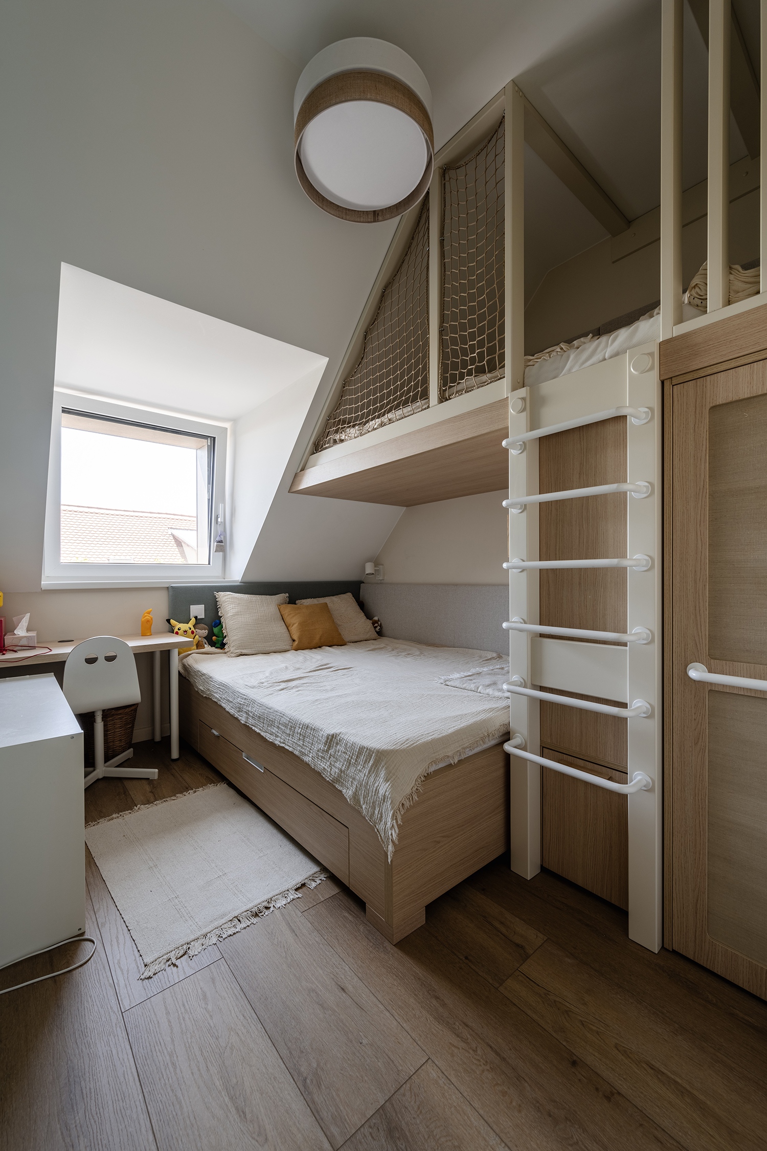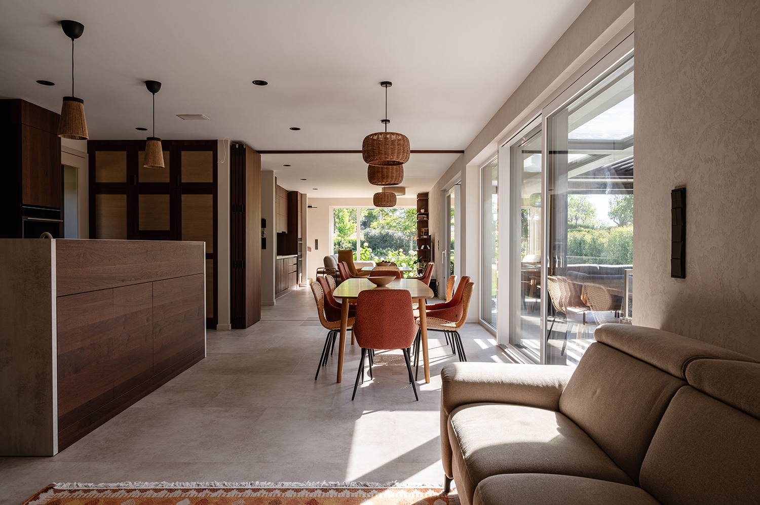 Együttes tervezői és megélt megrendelői tapasztalat szülte az ötletet, hogy a hagyományos, többgenerációs hosszúházakat egy-egy közös használatú térrel válasszák ketté. Ez a földszinten egy elhúzható, hatásában roppant egységes harmonika-falat, míg az emeleten a mosó-szárító egységet jelenti. A földszinti nappali amúgy impozáns méretű tere az elválasztással gyakorlatilag csak optikailag csökken, kényelmi szempontból továbbra is elegendő szabad területet kínál használóinak.