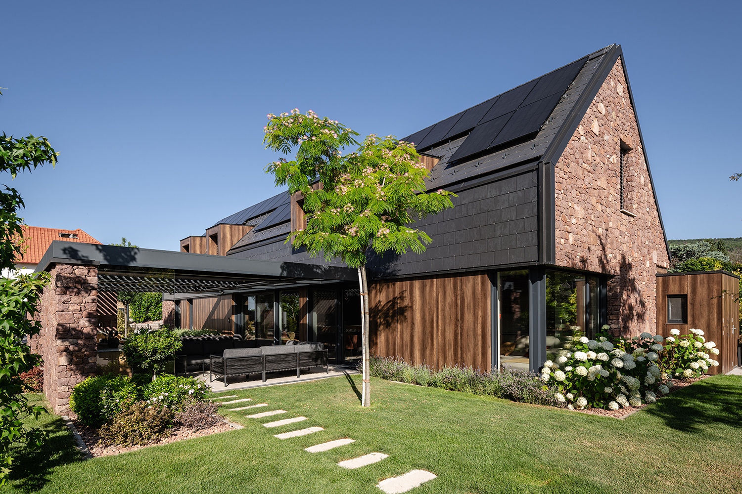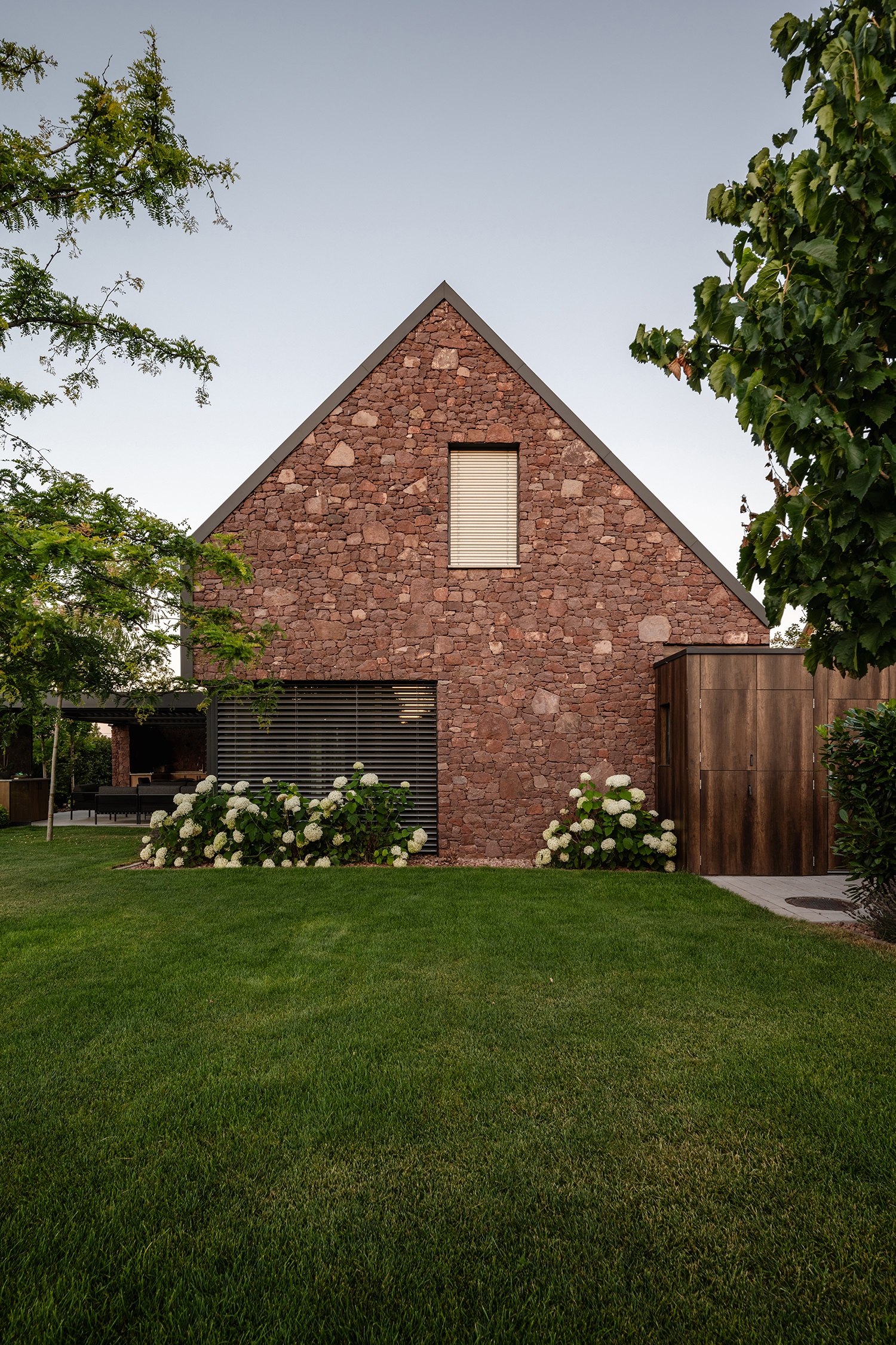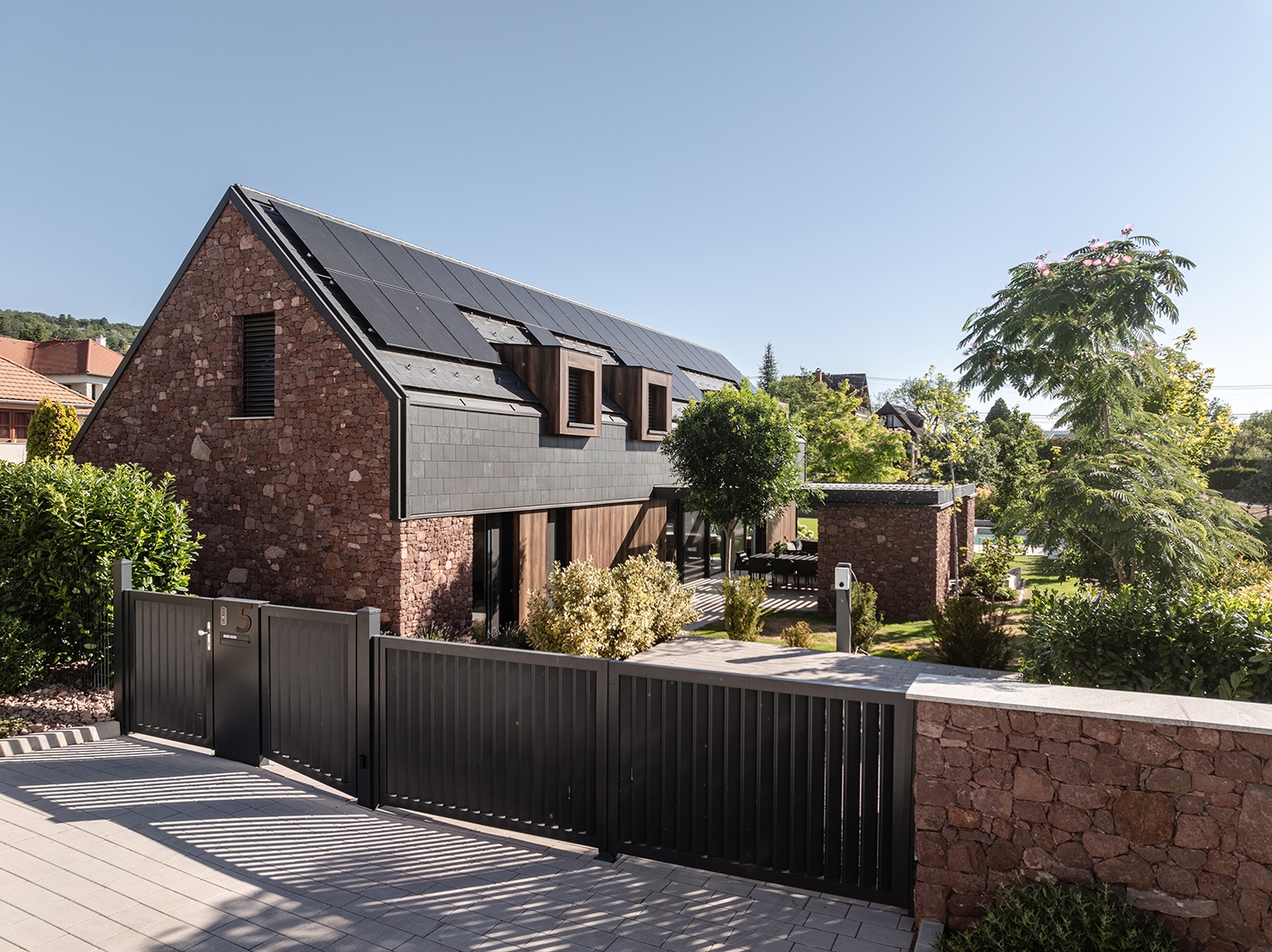 A homogén, vöröskővel burkolt, egyszemes utcafronti oromfalak nem is sejtetik, hogy a hosszanti elrendezésű ház valójában milyen tágas: az épület ugyanis több mint 200 négyzetméternyi lakóterületet rejt. A hagyományos, a településképi elváráshoz karakánul igazodó nyeregtető még inkább slankítja a tömeget. Ugyancsak ezt az optikai hatást erősíti a tervezőpáros kitűnő esztétikai érzékű designtervezőjének, Papp Lászlónak az ötlete az emelet dobozszerű ablakaival, de még inkább az udvari homlokzatra leforduló palaburkolattal, amely a háztól megkívánt puritán arányokat csak még inkább felerősíti. A leforduló burkolat elegánsan rejti az emeleti parapet megemelését, így viszont csak a házon belül érzékelhető a kiszerkesztett impozáns belmagasság.