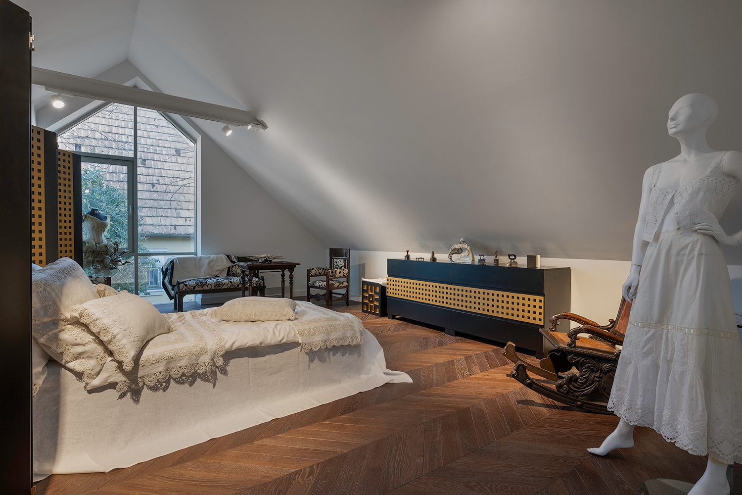 A villa különleges dísze az oldalhomlokzat vakolatkeretbe foglalt szentképe: ezt is megőrizték és felújították. A belső térben a válaszfalak elbontásával összefüggő kiállítótereket hoztak létre. A falépcsőt felújítva áthelyezték, ez vezet az újonnan kialakított tetőtéri kiállítóhelyiségbe. A tetőszerkezet megbontása során feltáruló látványt a belsőépítészeti koncepcióba illesztették: a nyitott fedélszék és a kis ablaknyílások atmoszférikus díszletet teremtenek az időről időre megújuló ruhaköltemények köré. A meglévő értékek felszínre hozása mellett a színvilág, illetve az anyagkezelés lecsendesítésével, a díszítés megtartásával végeredményben egy építészeti értékekkel bíró, az elképzelt funkcióra jól használható épület jött létre.