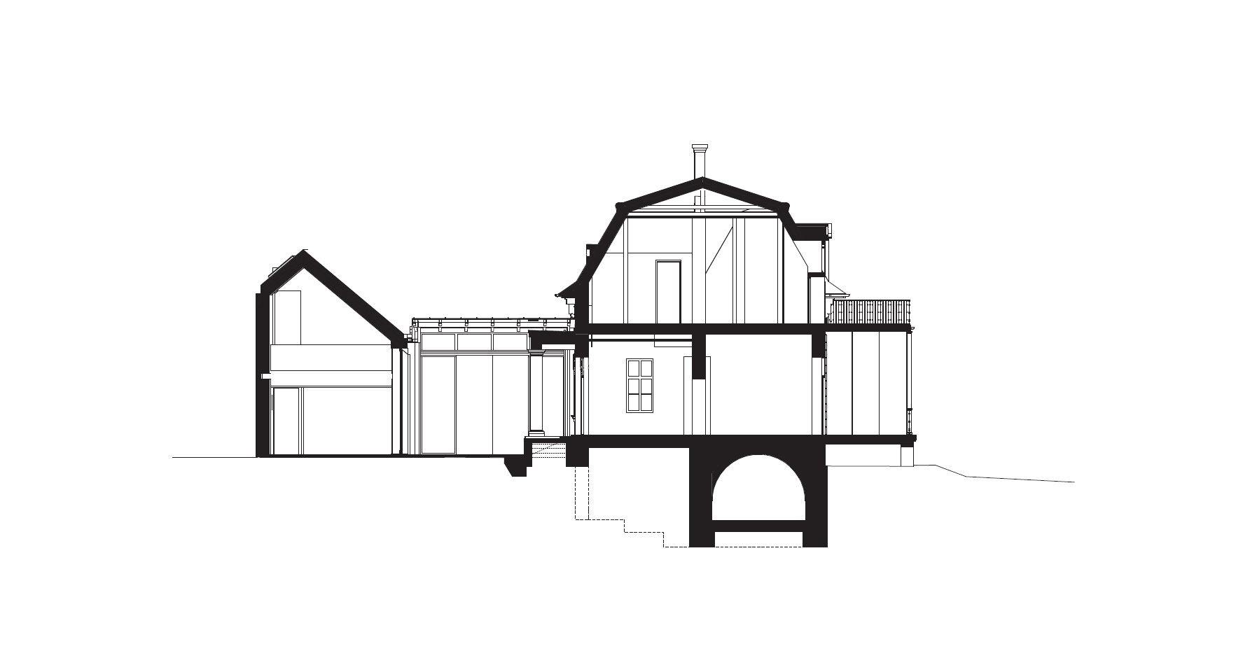 A melléképület elbontásának tetemes költsége abba az irányba mozdította a tervezést, hogy próbálják hasznosítani a nem túl kvalitásos objektumot. Itt jutott szerephez a kortárs kreativitás: a tömeg nyeregtetős, egyszerű formáját megtartva az ereszvonalat a térdfalak magasságáig emelték, és ezzel egy teljesen más arányú tömeget nyertek. Az eresz nélküli kialakítás, az egyetlen keretbe fogott, vitrinszerű utcai nyílás, a tető és a falak azonos, antracit színe modellszerű megjelenést kölcsönöz a felismerhetetlenségig megváltozott kis háznak, amely a háttérbe húzódva, sötét színével és kortárs megjelenésével hatásos, de nem hangos ellenpontja a 19. századi villának.