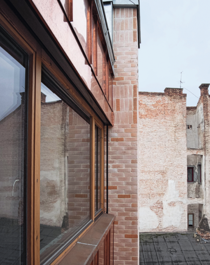 A ház utcai homlokzatának hangulatát a lépcsőház keskenyebb hasábja szabja meg, mely egyben összeköti az épületet a 25. sz. alatt található szerényebb Bauhaus-típusú lakóépület tűzfalával. Ez az épület határozta meg a ház ereszmagasságát, tetejének macskalépcsője pedig a lépcsőházat lefedő tetősík szögét. Személyes kedvencem a sarokablak, illetve a téglarács mögé rejtett udvari ablakok. Teljesen más hangulatú kapcsolat jött létre a 25. sz. ház nyitott lépcsőházas udvara és az új ház pici, 12 m2-es nyugati udvara között.