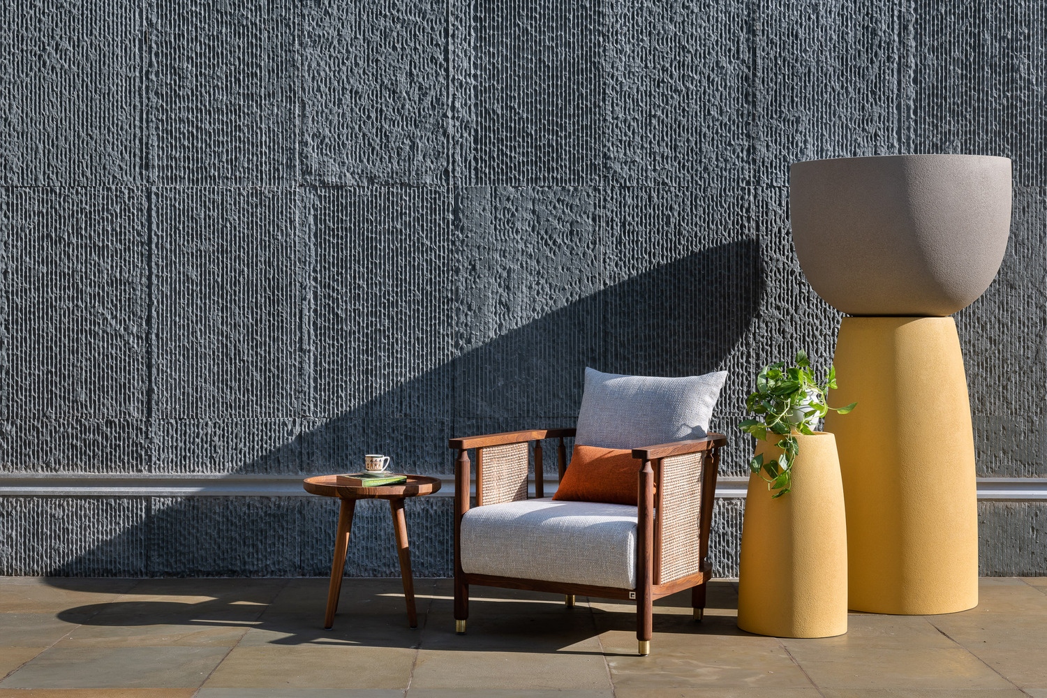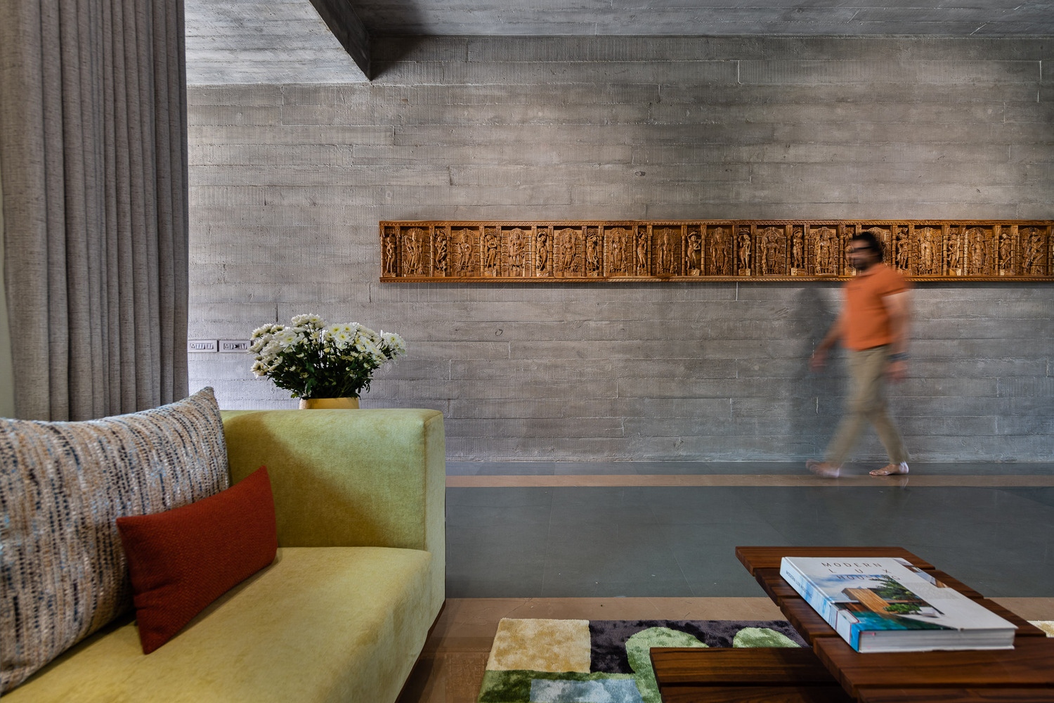 A tervezés során az éghajlat miatt fontos szempont volt, hogy az épület kellőképp védve legyen az erős napfénytől és hőtől. Ehhez a vizuális alapötletet az indiai nő klasszikus, titokzatos képe adta, aki finom kelmék védelmében éli mindennapjait. A Beton Brut-ban az anyag őszinte egyszerűsége lép előtérbe: csupasz beton, geometrikus formavilág, monokromatikus színpaletta, tömbszerű megjelenés jellemzi. Mindezt hagyományos, finom indiai elemek puhítják, az erős, rideg (neo)brutalista stílushoz lágy érzelmesség párosul.