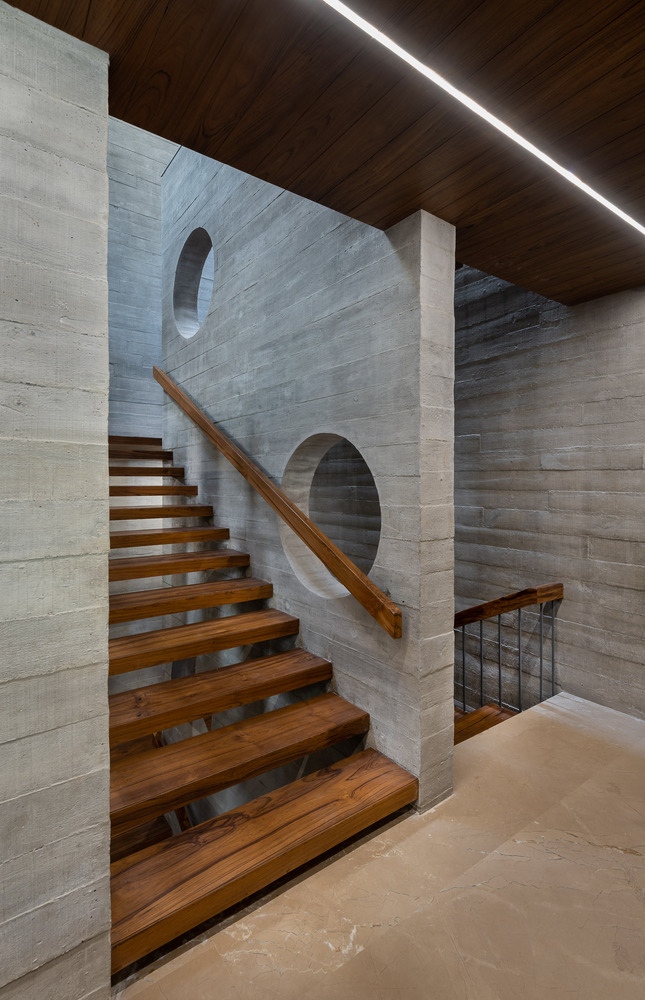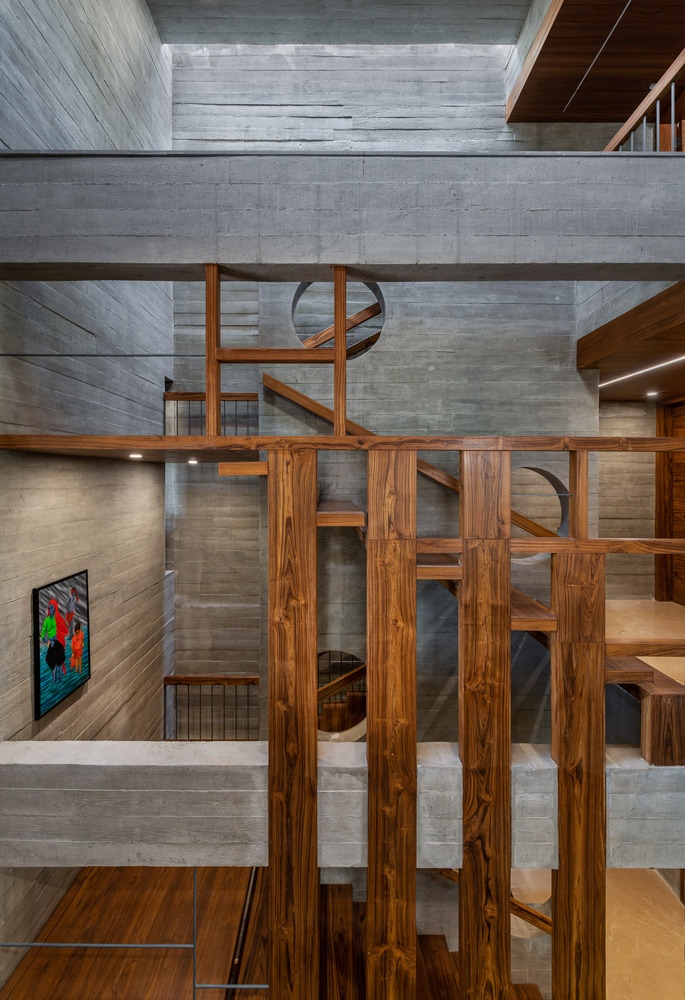 The Grid Architects építész és belsőépítész stúdiót Indiában alapította Snehal Suthar és Bhadri Suthar. Munkáikkal, melyek abszolút nem az aktuális divatot követik, spirituális utazásra invitálják ügyfeleiket. A Beton Brut elnevezésű projekt esetében a megrendelő, vállalkozást üzemeltető, kreatív család olyan otthont szeretett volna, ahol a közösségi terek mellett az individuumnak is jut elég hely. A fő építőanyag a beton volt, amit többféle puha, meleg, színes felülettel lágyítottak.