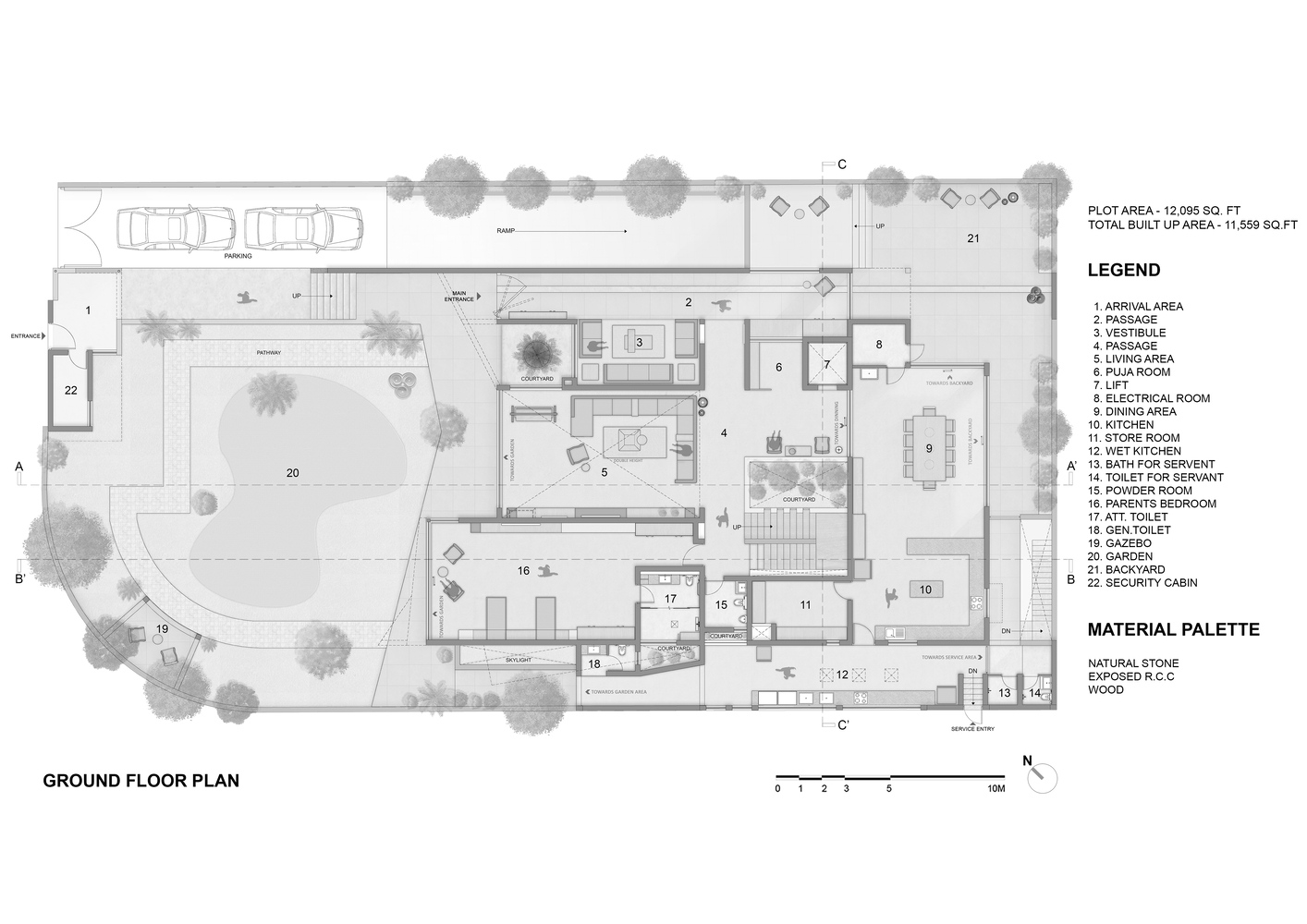 Vizuálisan a viszonylag szűk bejárattól a központi, parkosított udvar felé haladva tágul ki a tér. Itt találhatók a szociális helyiségek és az idős szülők hálószobája, míg a többi háló és gardrób az emeleten kapott helyet. A tudatos tervezés jóvoltából minden lakótér közvetlenül kapcsolódik a lépcsőzetes elrendezésű teraszhoz, vagy kertrészhez. Az esztétikusan tagolt enteriőrt indiai tárgyak, fafaragványok, installációk fűszerezik, ennek legszembeötlőbb darabja a nappali falára elhelyezett jharokha (falfülke), amelyből a földszintre pillanthatunk le. Az egyszerű, letisztult vonalvezetésű bútorok kellemes színfoltjai a berendezésnek.