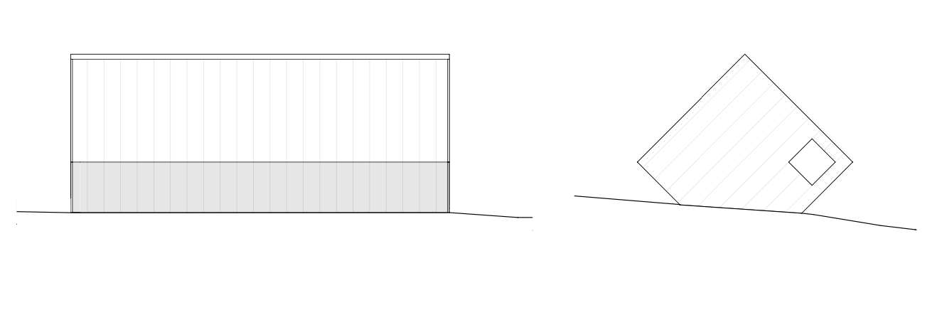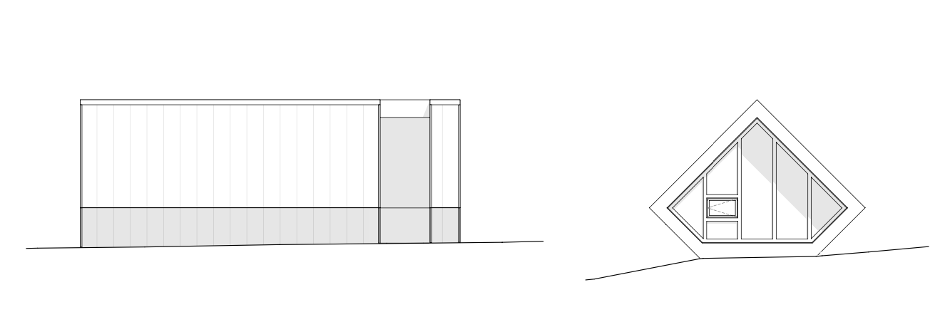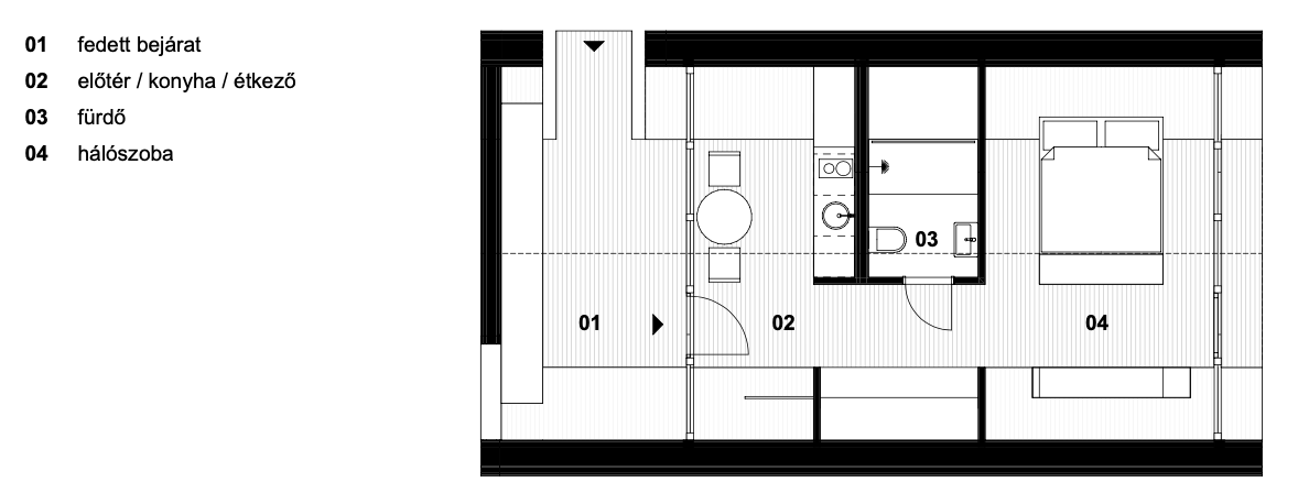 A szállásépület fő helyiségei egy élére fordított, négyzet alapú hasáb alakú tömegben helyezkednek el. Az épület legkedvezőbb tájolású homlokzata teli üvegezésű. Itt kapott helyet a vendégszoba. A túloldalon hasonlóan nagyvonalú üvegfelület mellett található az étkező, melynek védettségét egy részben fedett terasz biztosítja. Az itt leírt két fő helyiség között egy központi blokkban helyeztük el a fürdőszobát, melynek falai mentén található egy beépített mini-konyha és a gépészeti fülke is.