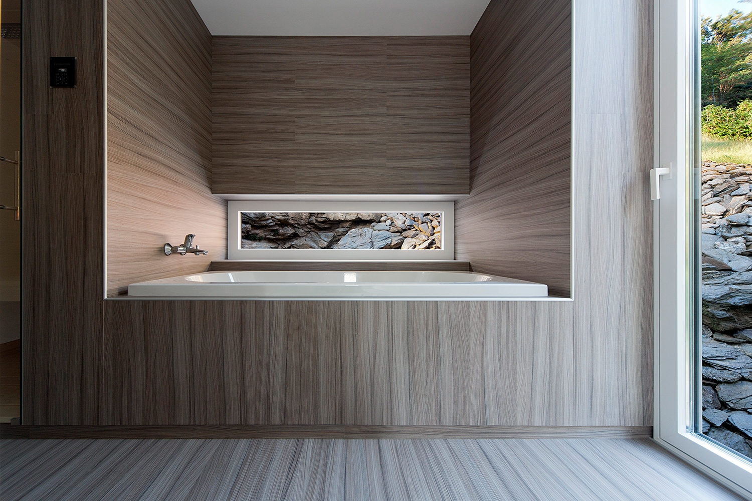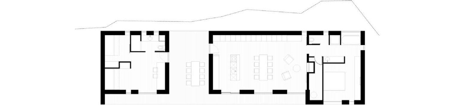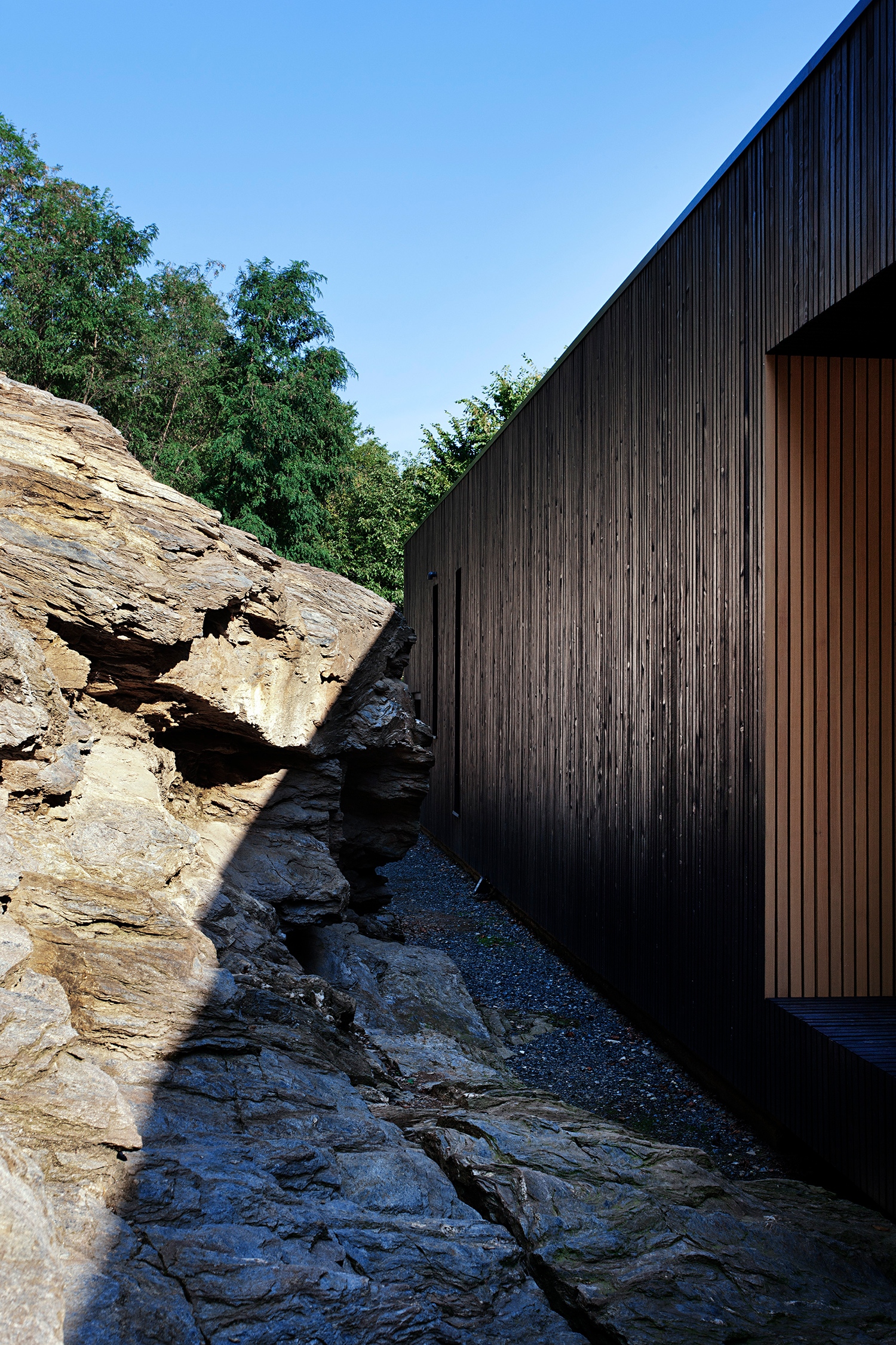 A szikla... Itt most elfogynak a szavak. Az egykori apró kőfejtő, amit a kőszórásba beépített meddőtől és a kőzetre rátelepült 20-30 centiméteres humusztól puszta kézzel tisztítottak meg, elképesztő kisugárzással bír. Színe, hőmérséklete, hol üledékes hullámokat, hol grafittól csillogó palákba törő, hol kristályos szerkezeti részletei megunhatatlanul gazdag, felfoghatatlan, befogadhatatlan élmény forrásai. Szinte lélegzik. Minduntalan hozzá akarsz érni. Simogatod, mint egy élőlényt. Az építész-tervező olyan közelségben szerkesztette ki hozzá a házat, amilyen közel csak lehetett. Nem pusztán a rá nyíló ablakok teremtenek szinte intim, érzéki kapcsolatot. Amikor a sziklára délről érkező napsugarak erősödnek, vagy éppen gyengülnek, valóban megmozdul a levegő. Valóban olyan, mintha egy „lakótárs” lélegzetének, mozdulatainak fuvallataiban állnánk.