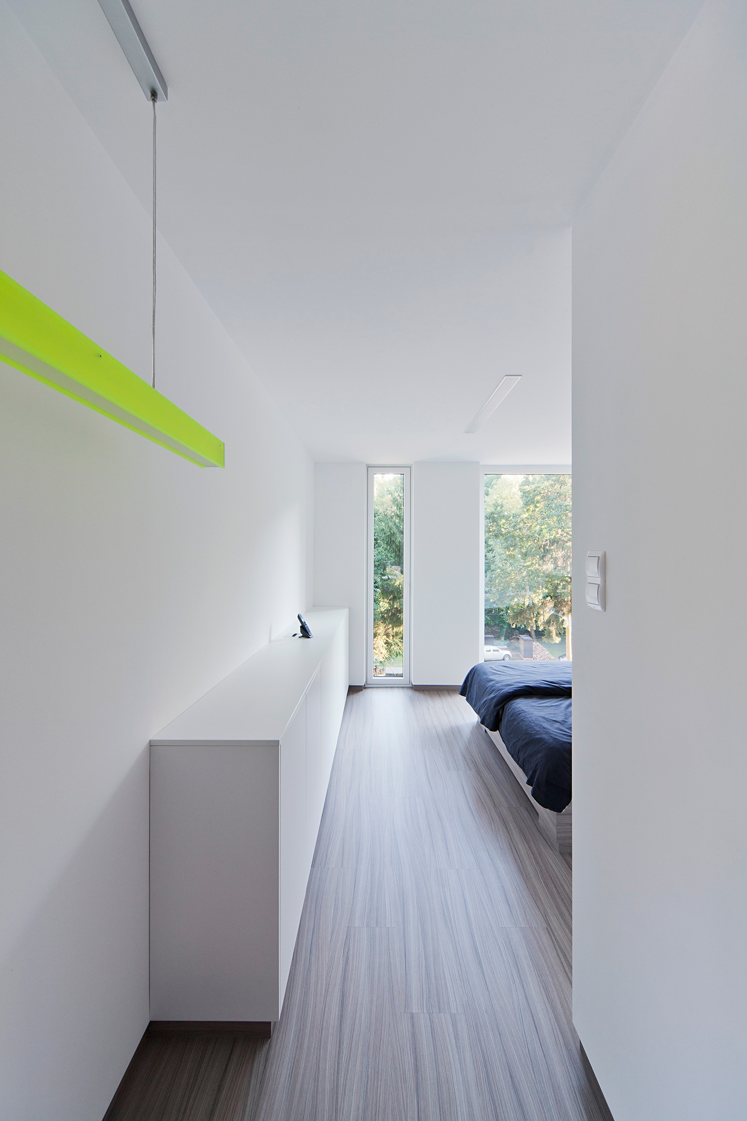 Hagyjuk azonban el most a rációt. Úgy éreztem ugyanis, hogy a tervezési folyamat mellett a kivitelezés egyes fázisaiban voltak olyan mozzanatok, ami közben valamiféle átszellemülés történt. Különös aura épült erre a házra. Arra a momentumra gondolok, amikor a szinte láthatatlan megfogásokkal a homlokzatra rögzített réselt lécpanelek minden egyes 4×4 centiméteres lécét a megrendelő házaspár ecsettel maga festette le. Négy-öt hónapon át, nap, mint nap tartott a munka. Egyfajta meditáció, vagy zarándoklat, vagy tudom is én... Felfoghatatlan.