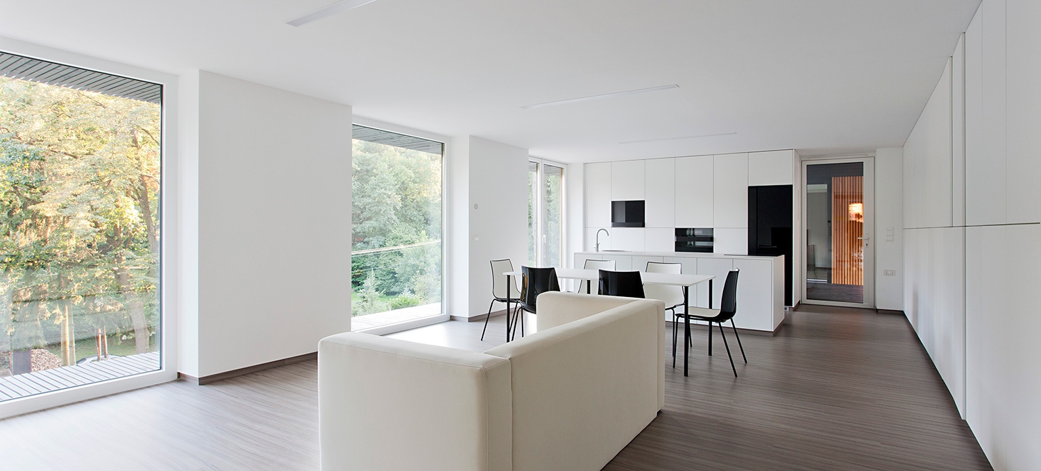 Első körben félretettek minden aktív- és passzívházas konvenciót és előírást, majd a határ osztrák oldalán lévő építőanyag-vásárok tapasztalatából, ösztönből és rengeteg számból összeállt a megfelelő, sajátos, egyedi recept. A két férfi mindent tud ennek a teleknek benapozási szögeiről és klimatikus viszonyairól, a várható hőnyereségről, és minden átgondolt döntésük telitalálatnak bizonyult. Egyetlen drága gépészeti rendszer sincs a házban, de mindenből a lehető legjobb minőséget építették be. „Ebben a házban egyetlen szög sincs. Mindent csavaroztunk.” Egyesével válogatott, fűrészelt fenyő a szlovák Tátrából, lengyel gyártmányú, nagy sűrűségű üveggyapot, amiből közel 100 m3-t használtak fel. Olyan háromrétegű alumínium nyílászárók, ahol a gyártó a fix és bukó kereteket ugyanolyan vastagra tudta legyártani, ami révén nem sérült a ház déli oldalán megtervezett nyílásrendszer designjának egységessége.