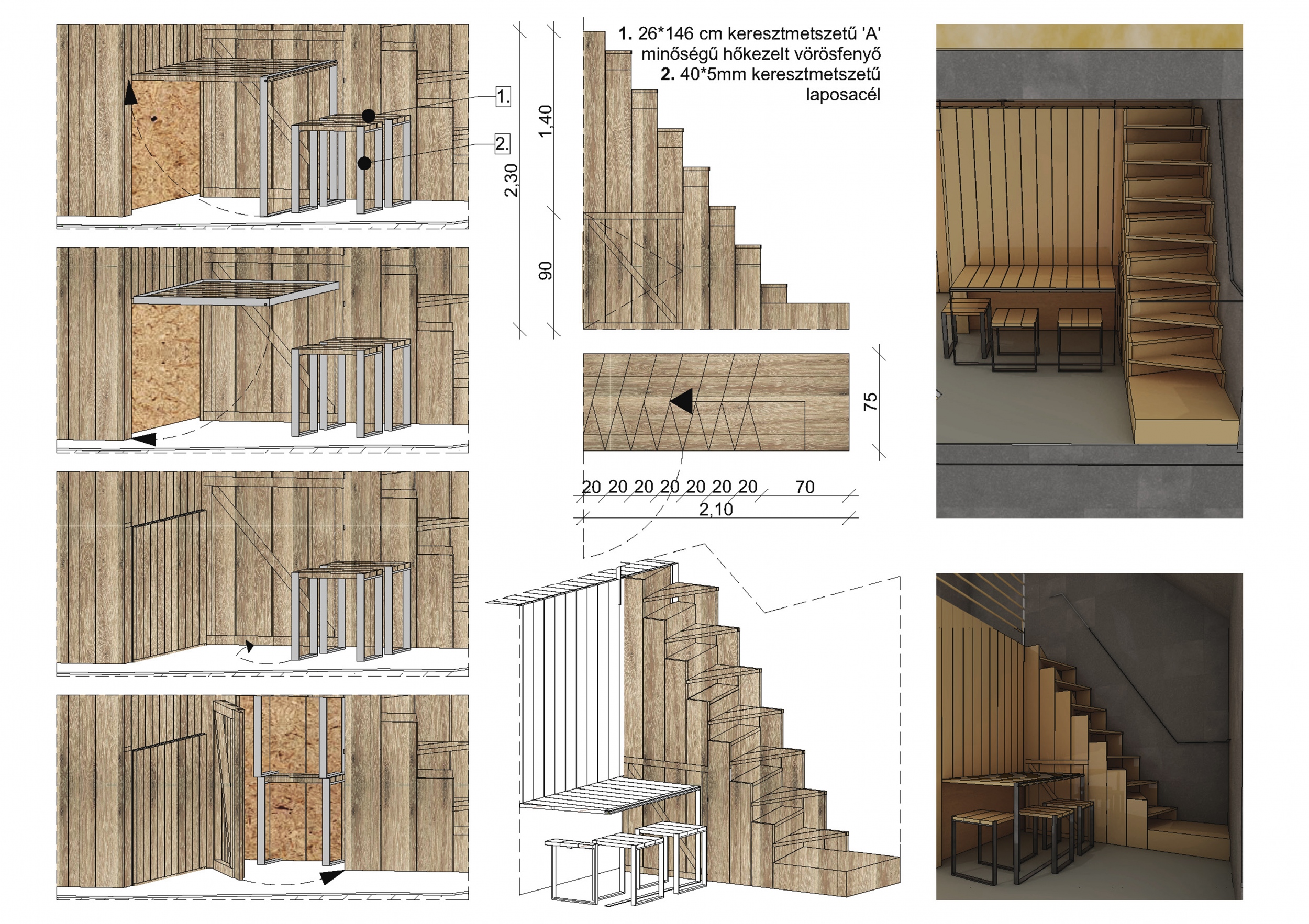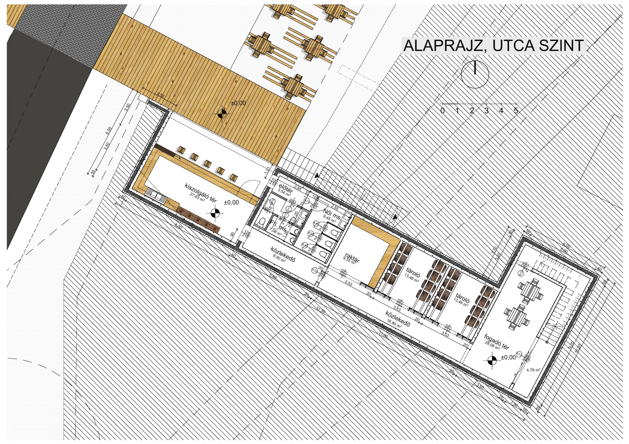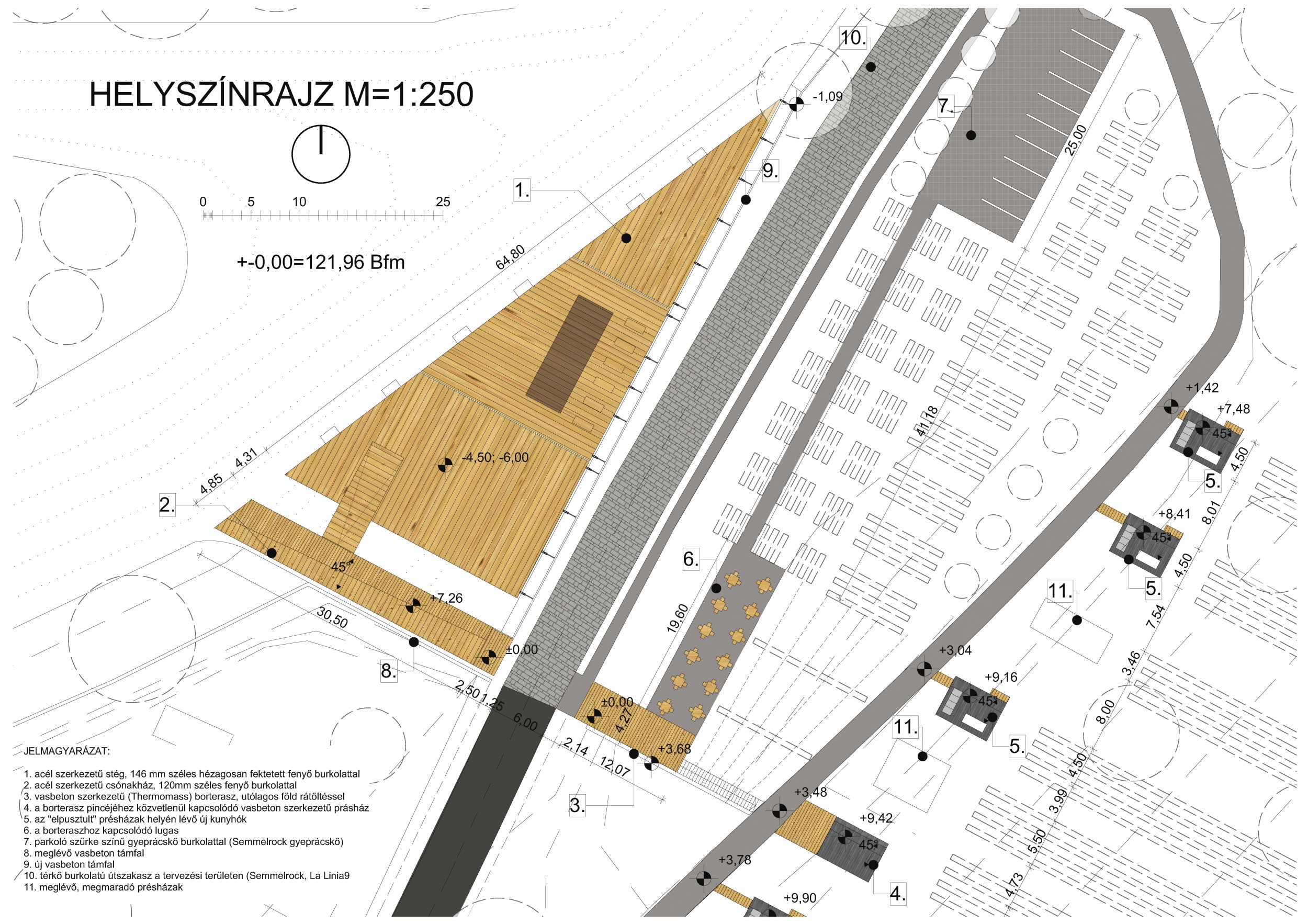 A borterasz elhelyezésénél az első felvetés az volt, hogy kövesse a csónakház vonalát. A Petőfi út két oldala ez által túl hangsúlyossá vált, így a présházat próbáltam a területen belül, a raszterbe illően máshol elhelyezni. A vízitúrázók számára viszont a csónakház felől nem rajzolódott ki egy tiszta útvonal a borteraszhoz, ezért visszahelyeztem annak tengelyébe. A két épületem így konkurált egymással, ezért a hangsúlyos csónakház mellett igyekeztem a kialakuló borteraszt visszafogni. Ennek a megoldása az lett, hogy a csónakház vonalától egy traktussal a falu felé eső részre áthelyeztem az épületet. A hangsúly csökkentése érdekében a kiszolgálóteret a terep részévé tettem. Viszonylag egyszerű, homogén homlokzatot hoztam létre, az épület többi részére pedig „ráfuttattam” a terepet. Az így kialakult nyúlvány a domb részévé vált. A borterasznál fontos volt a pince közvetlen közelsége, ezért a kiszolgálórész folytatásaként alakítottam ki a domb alá befutó pincét, amely így kiesett a csónakház és ez által a présház vonalából.