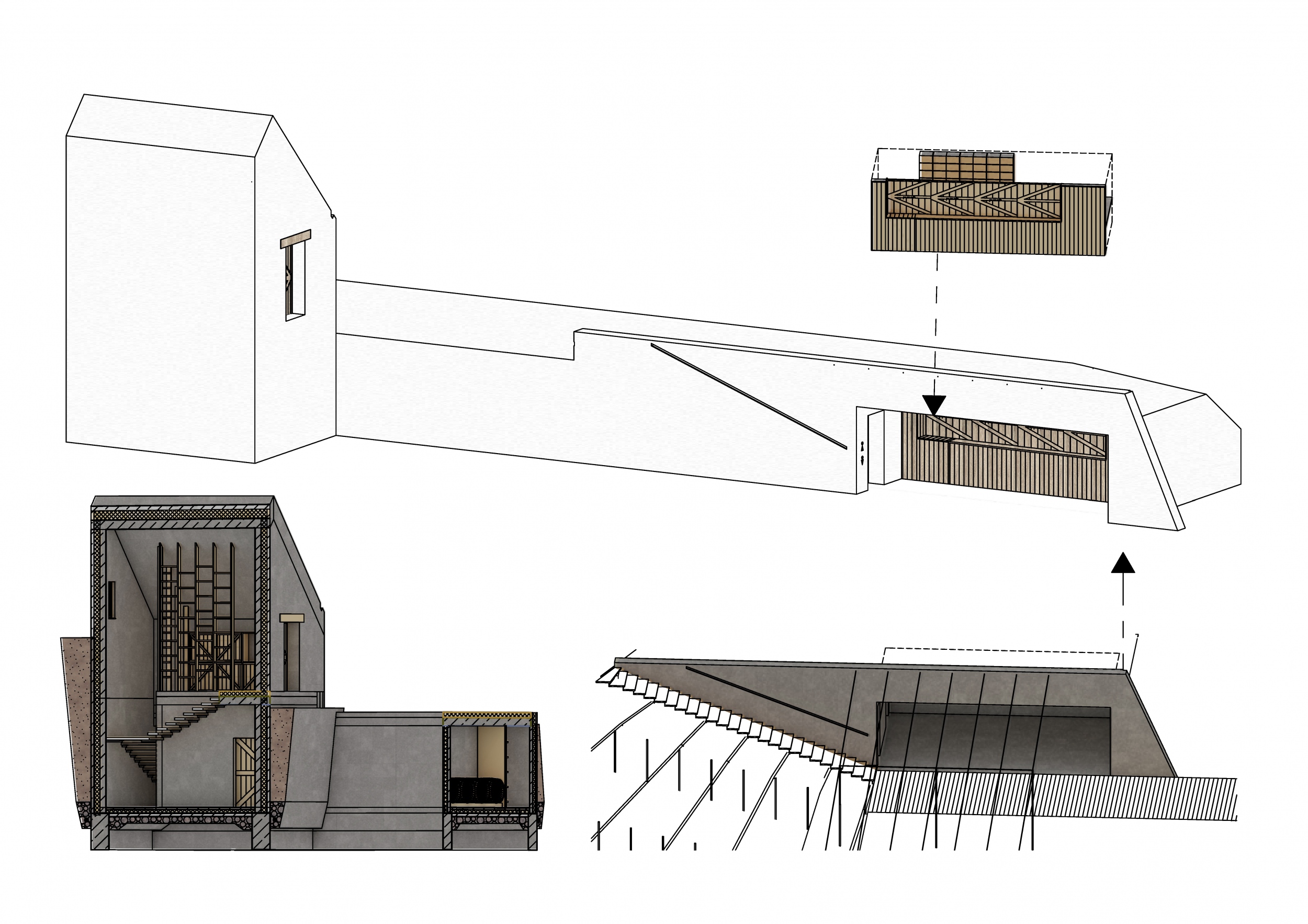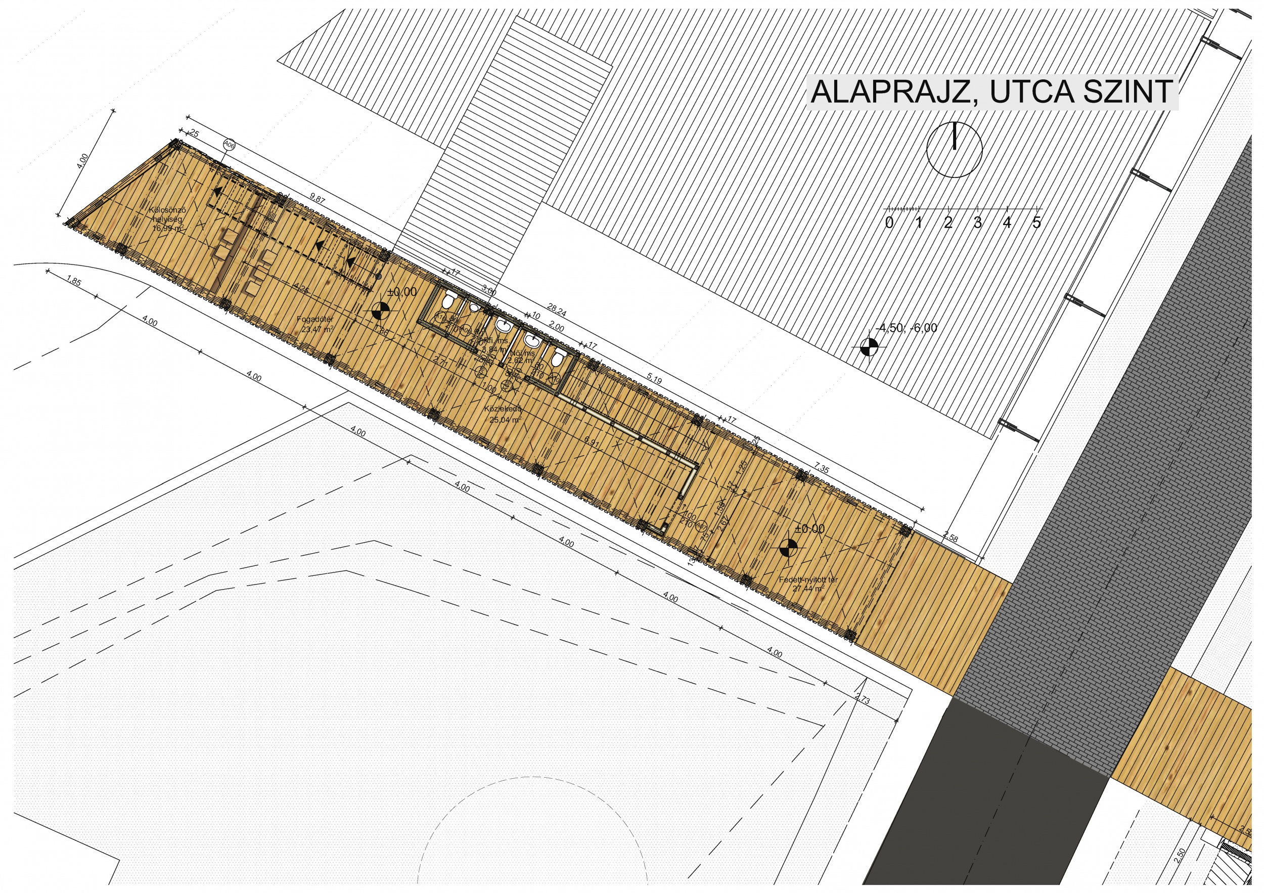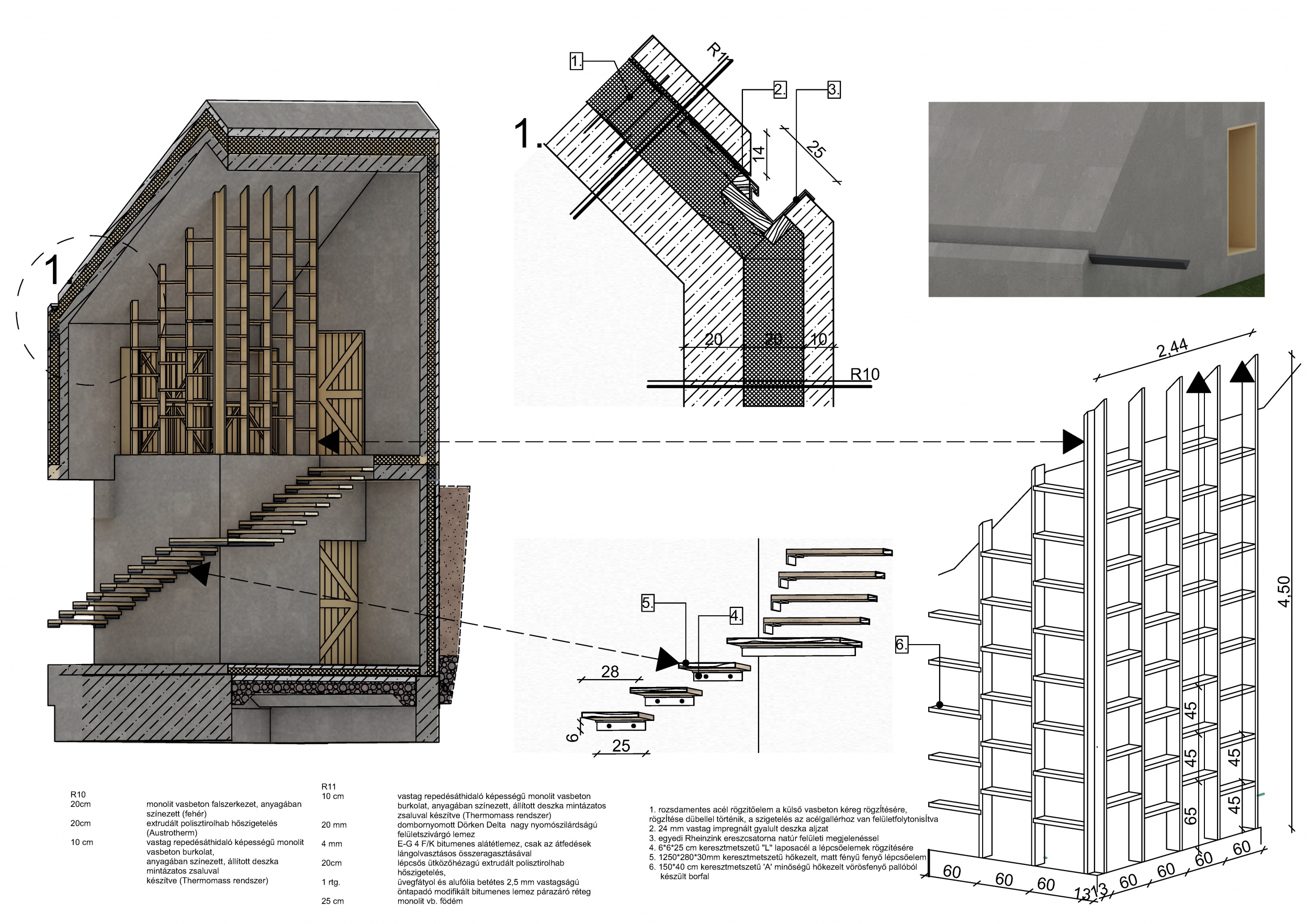 A borterasz elhelyezésénél az első felvetés az volt, hogy kövesse a csónakház vonalát. A Petőfi út két oldala ez által túl hangsúlyossá vált, így a présházat próbáltam a területen belül, a raszterbe illően máshol elhelyezni. A vízitúrázók számára viszont a csónakház felől nem rajzolódott ki egy tiszta útvonal a borteraszhoz, ezért visszahelyeztem annak tengelyébe. A két épületem így konkurált egymással, ezért a hangsúlyos csónakház mellett igyekeztem a kialakuló borteraszt visszafogni. Ennek a megoldása az lett, hogy a csónakház vonalától egy traktussal a falu felé eső részre áthelyeztem az épületet. A hangsúly csökkentése érdekében a kiszolgálóteret a terep részévé tettem. Viszonylag egyszerű, homogén homlokzatot hoztam létre, az épület többi részére pedig „ráfuttattam” a terepet. Az így kialakult nyúlvány a domb részévé vált. A borterasznál fontos volt a pince közvetlen közelsége, ezért a kiszolgálórész folytatásaként alakítottam ki a domb alá befutó pincét, amely így kiesett a csónakház és ez által a présház vonalából.