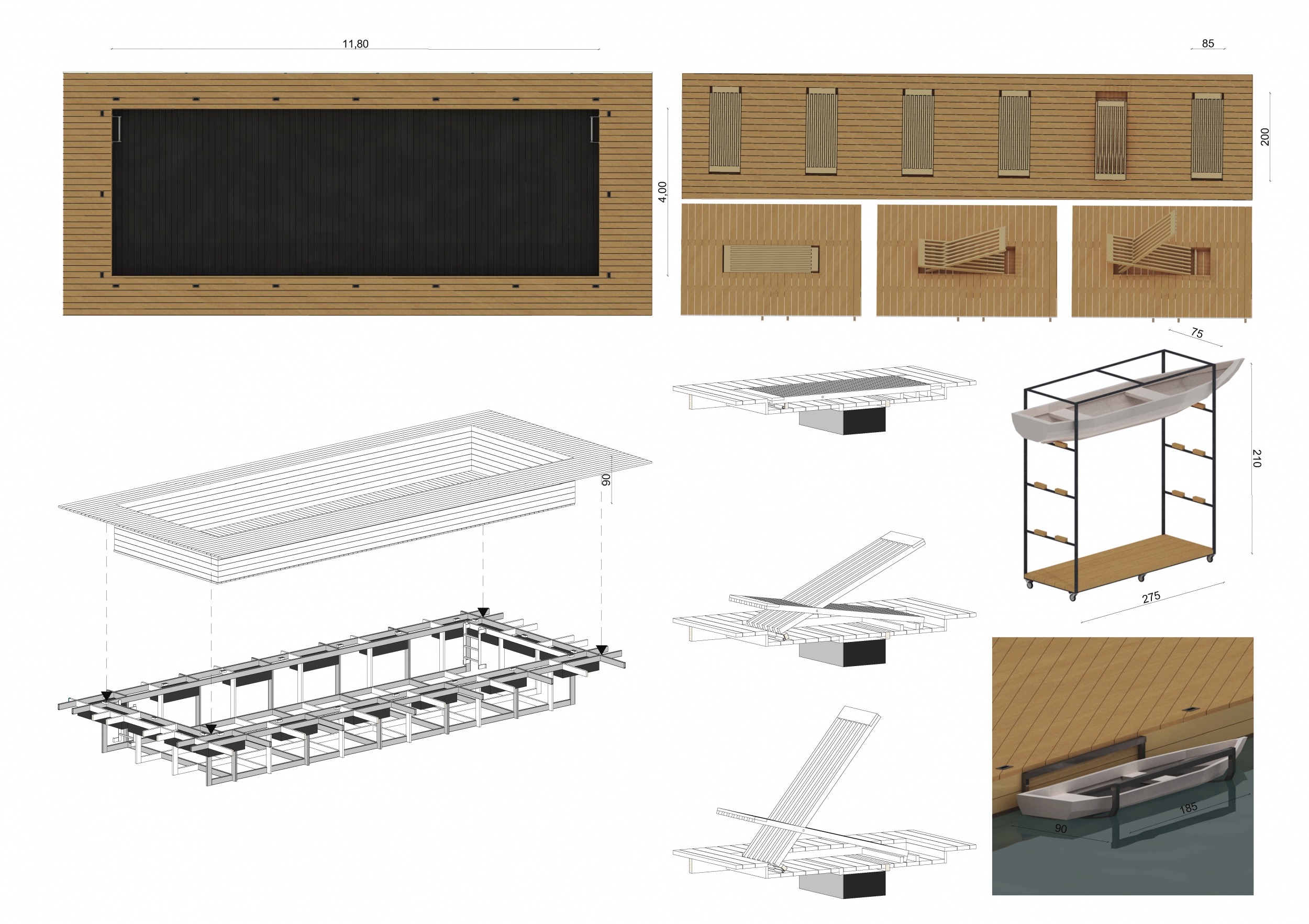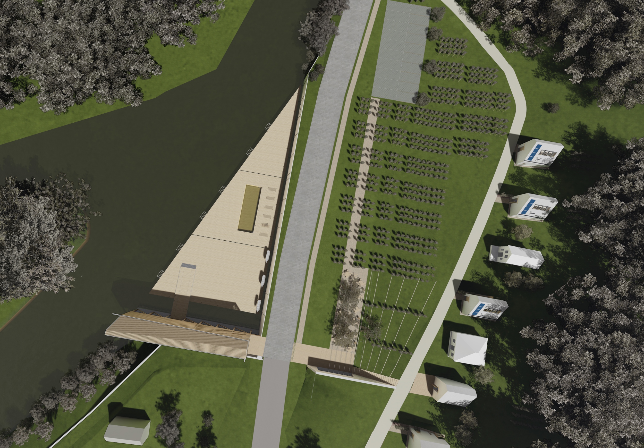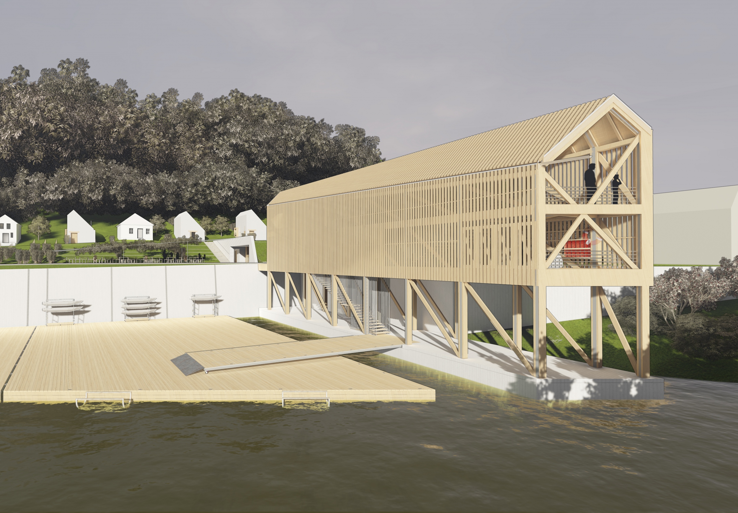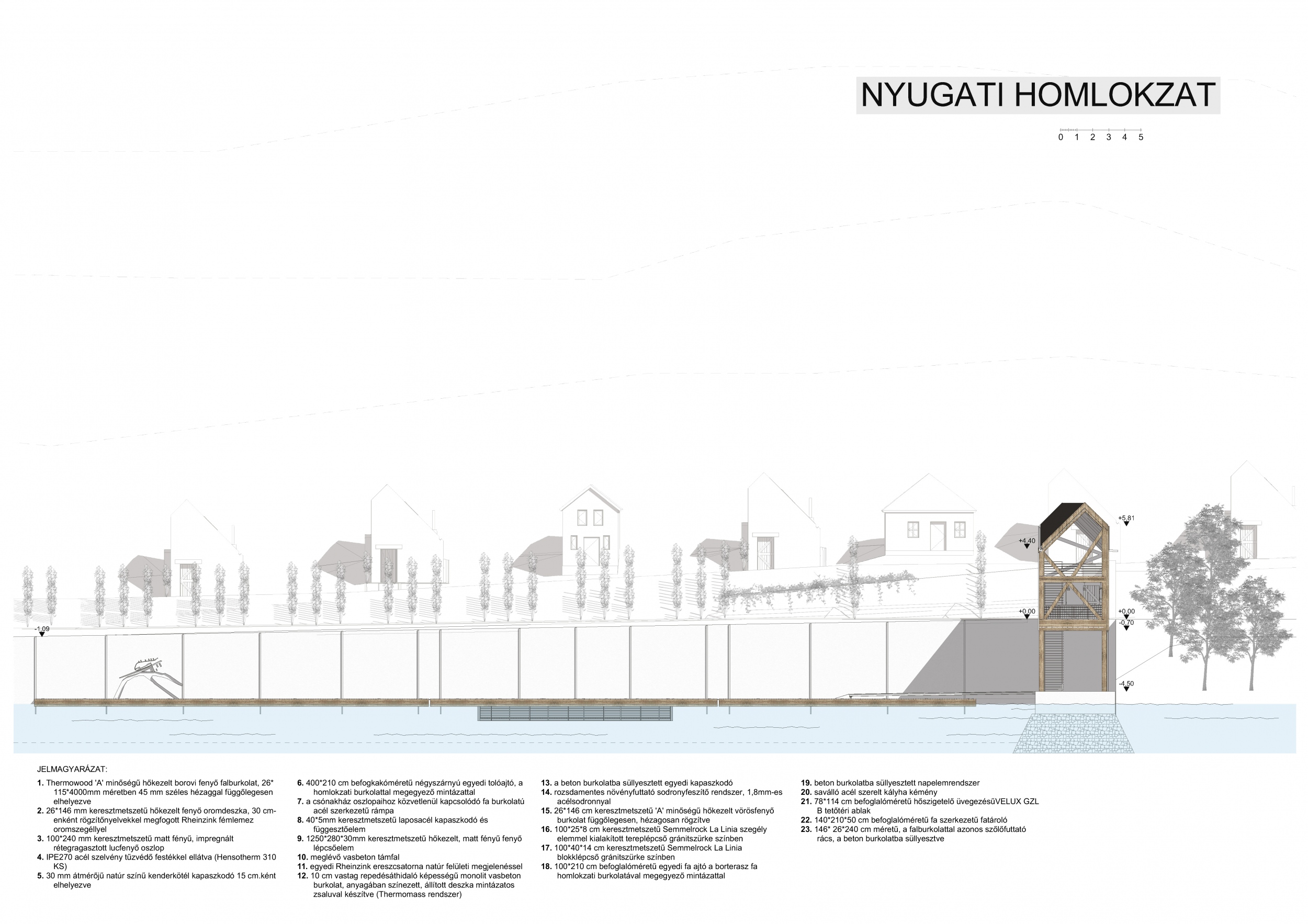 Az út domb felőli oldalán kialakított tömör épületektől eltérően a folyóparton lévő csónakháznál egy góréra emlékeztető fa szerkezetes építményt képzeltem el. Fontosnak tartottam, hogy a két oldal ne térjen el egymástól teljesen, ezért a csónakháznál használt faburkolat visszaköszön a borterasz kiszolgálótereiben. A stég faburkolatának aránya megegyezik a csónakház padlóburkolatának osztásával, a csónakház előtti terasz burkolatával, és visszaköszön a kunyhók bejárati ajtójának mintázatánál is.