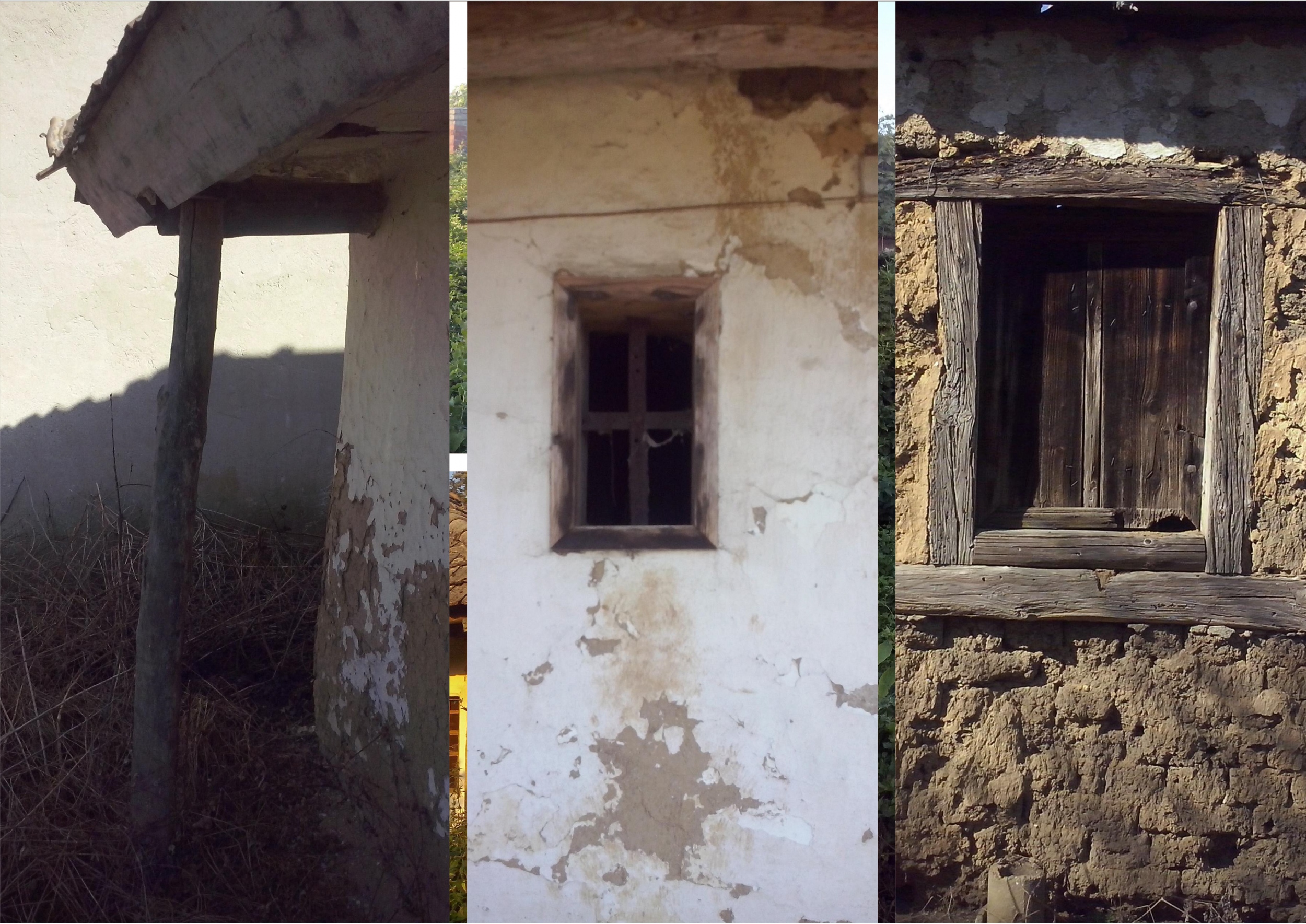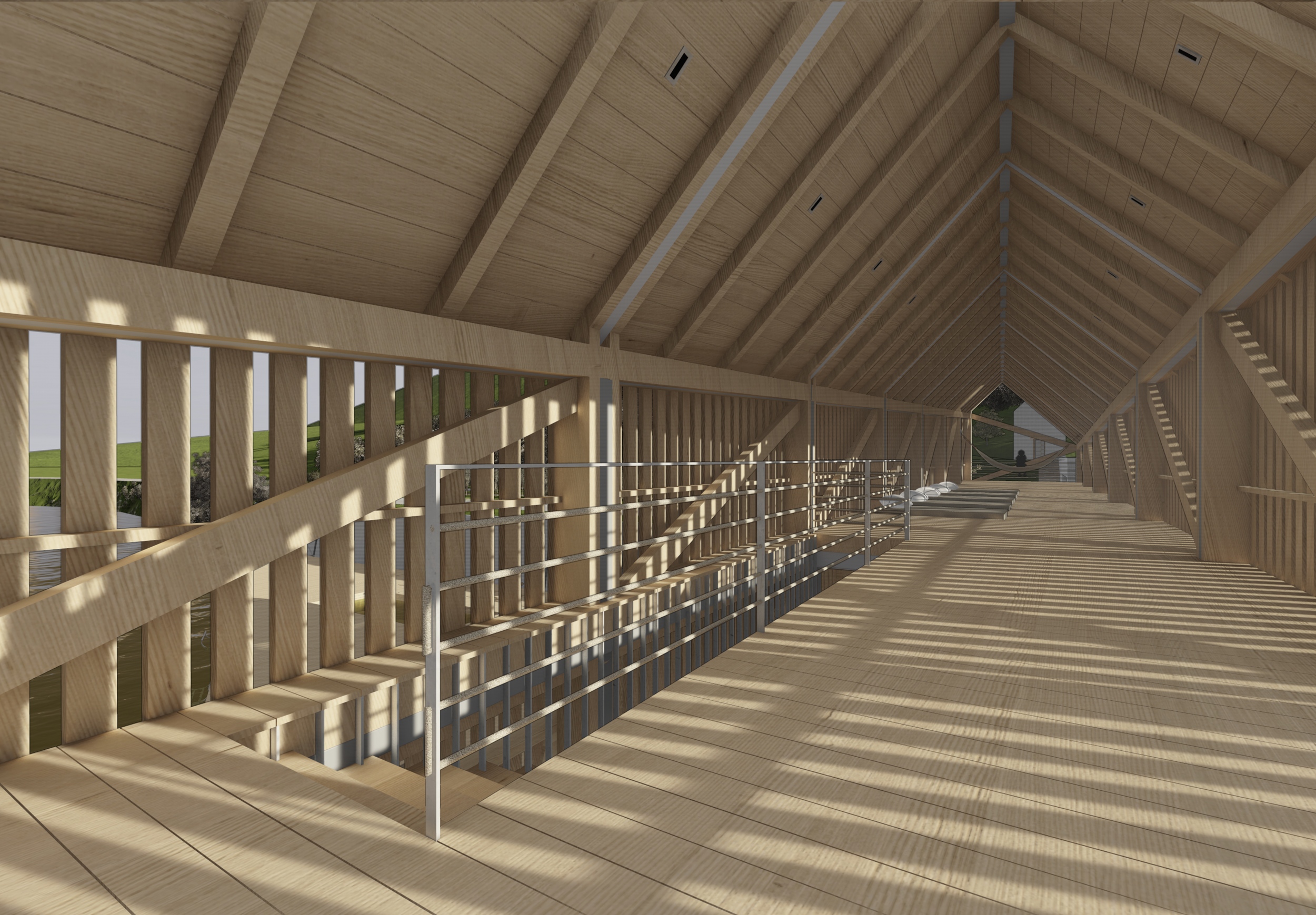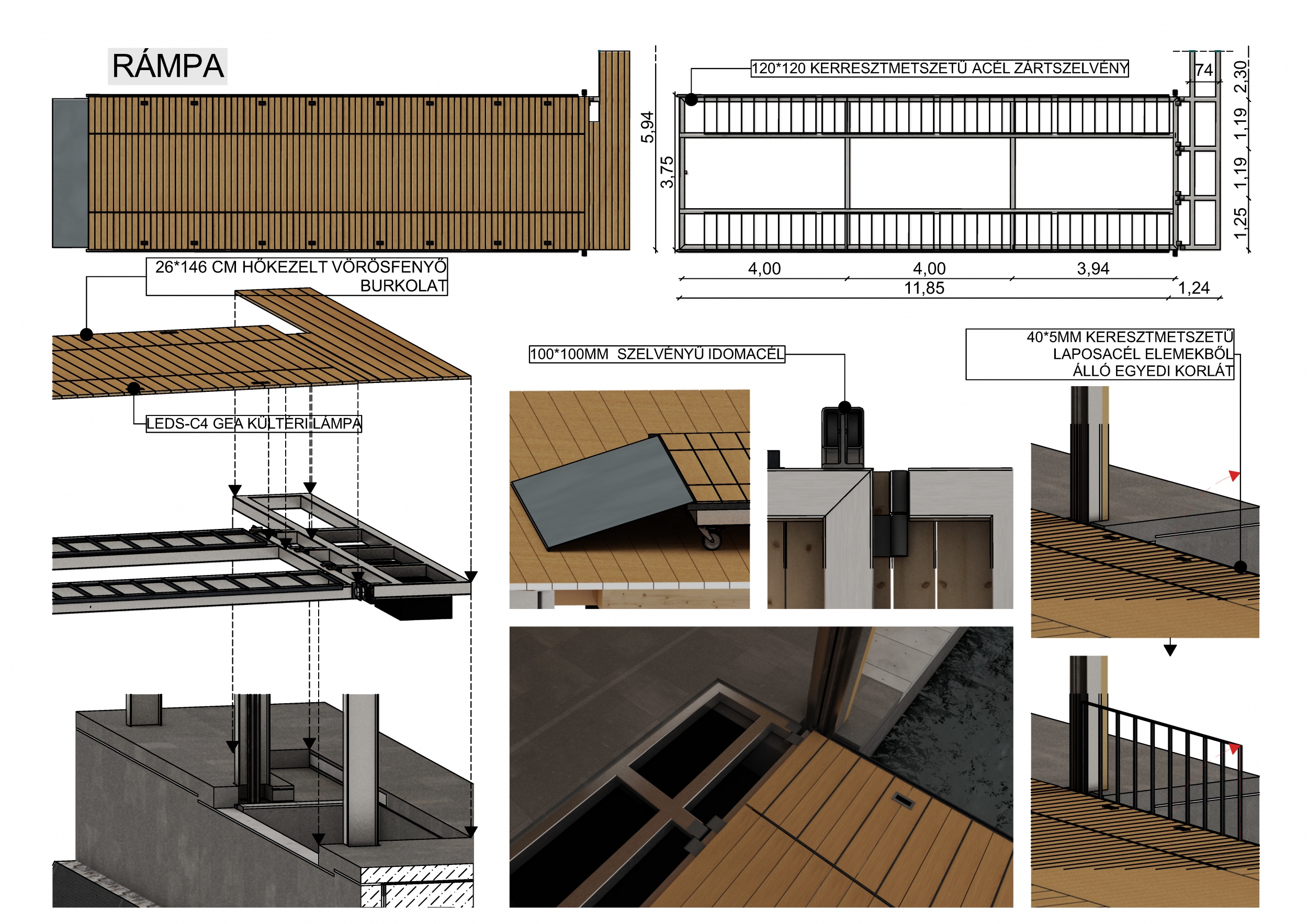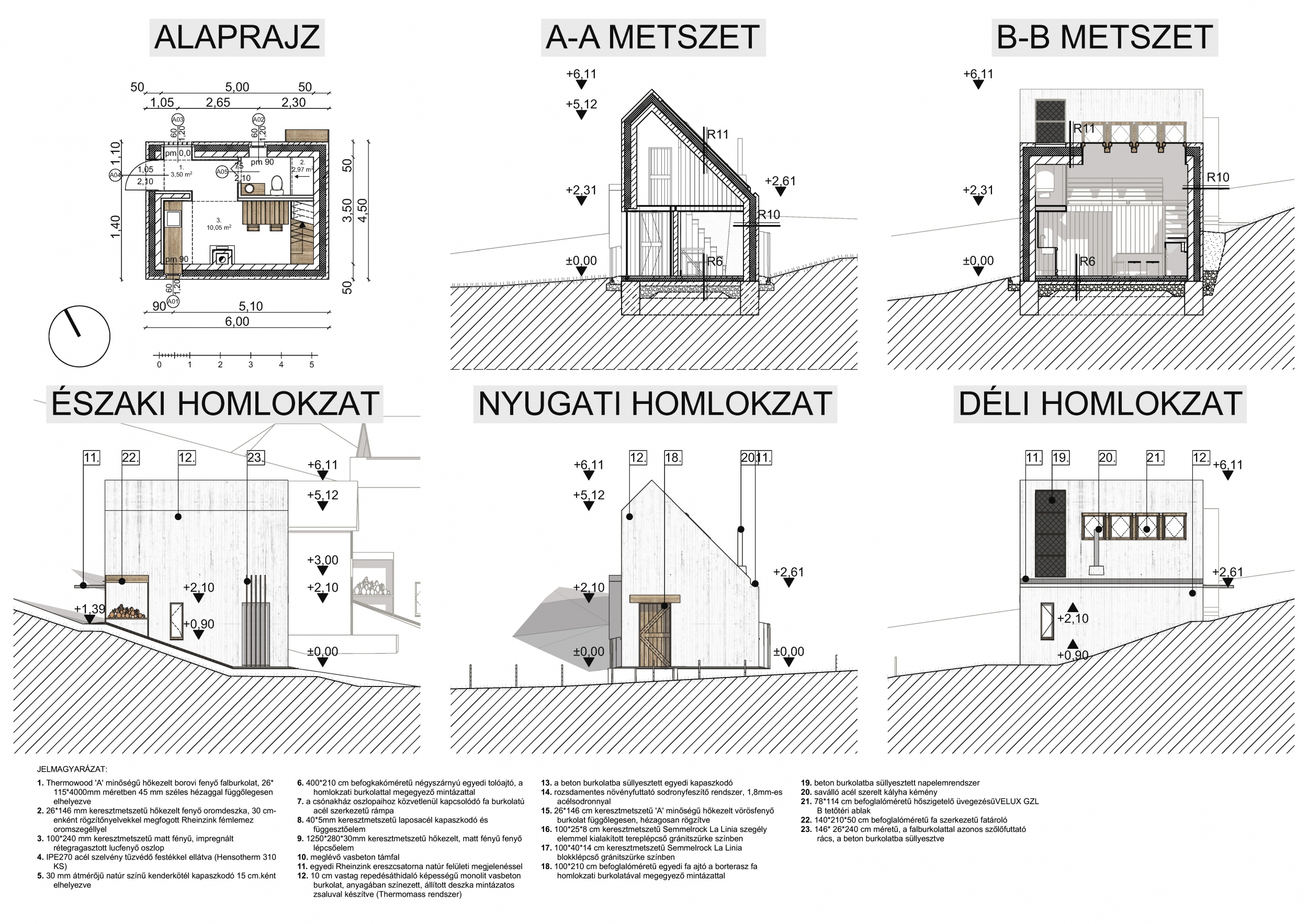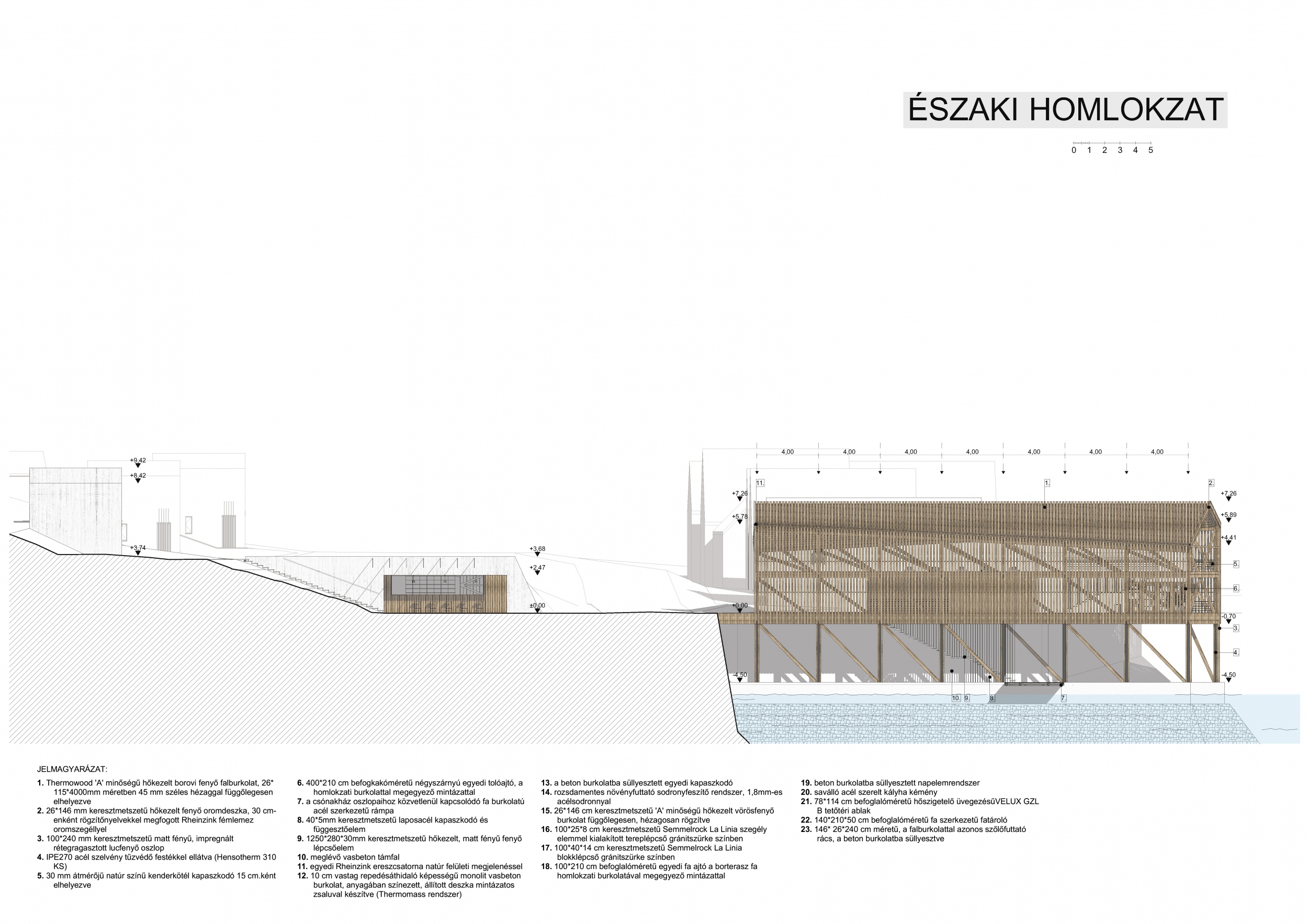 Az út domb felőli oldalán kialakított tömör épületektől eltérően a folyóparton lévő csónakháznál egy góréra emlékeztető fa szerkezetes építményt képzeltem el. Fontosnak tartottam, hogy a két oldal ne térjen el egymástól teljesen, ezért a csónakháznál használt faburkolat visszaköszön a borterasz kiszolgálótereiben. A stég faburkolatának aránya megegyezik a csónakház padlóburkolatának osztásával, a csónakház előtti terasz burkolatával, és visszaköszön a kunyhók bejárati ajtójának mintázatánál is.