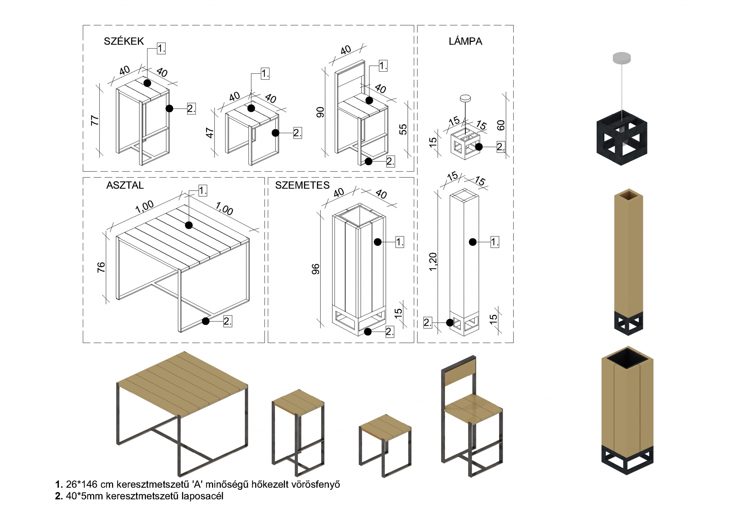A tervezési területen belül egységes, egyedi bútorok kerültek elhelyezésre. Az asztalok és székek a padlóburkolatnak megfelelően 14,6 cm széles faburkolatot kaptak. A lábak a csónakház lépcsőszerkezetéhez hasonlóan 10 cm széles lapos acélból készülnek. A lámpák anyaghasználata az egyedi székekkel és asztalokkal megegyező. A kunyhókban az előbbiekhez hasonló méretű és burkolatú asztal és székek kerültek elhelyezésre. Az asztal kialakítása kissé eltérő, mivel az mobilis, a falburkolatból kihajtható. A galériaszintre vezető lépcső szerkezete szintén faszerkezet, amely alatt a helykihasználás érdekében kisebb tároló kerül elhelyezésre. A présházban és a pincében 15 cm széles fa oszlopokból és gerendákból álló rácsos szerkezetű borfal készül.