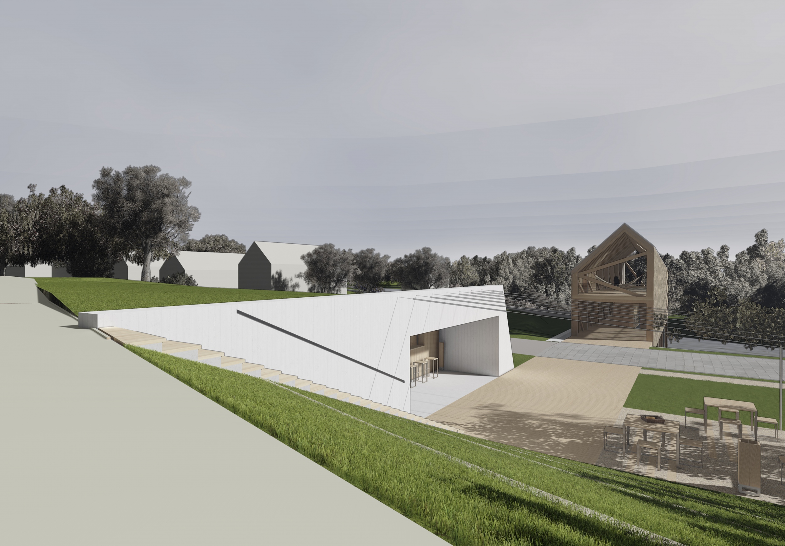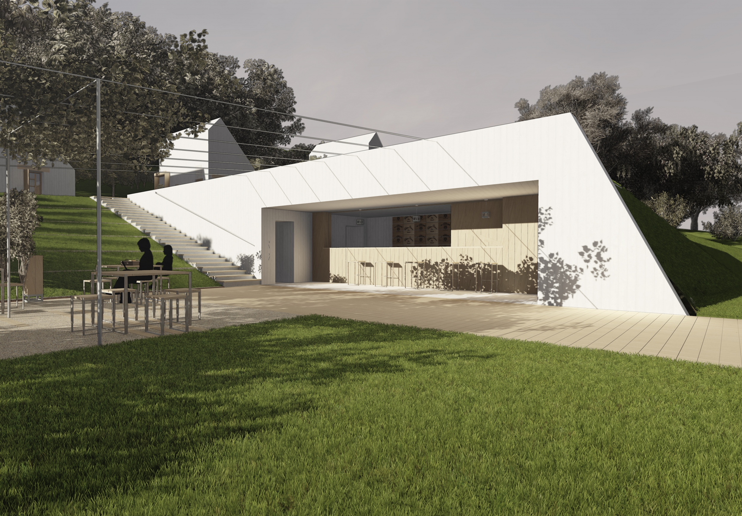 A területen a meglévőekhez hasonlóan, és azokat kiegészítve új szőlősorokat hoztam létre, amelyek közvetlenül csatlakoznak a kiszolgálótérhez, egyfajta lugast létrehozva. A borozni vágyók tehát közvetlenül a szőlősorok mellett ülhetnek, felettük pedig az épületből kiinduló sodronyokra futnak fel a szőlőszárak.